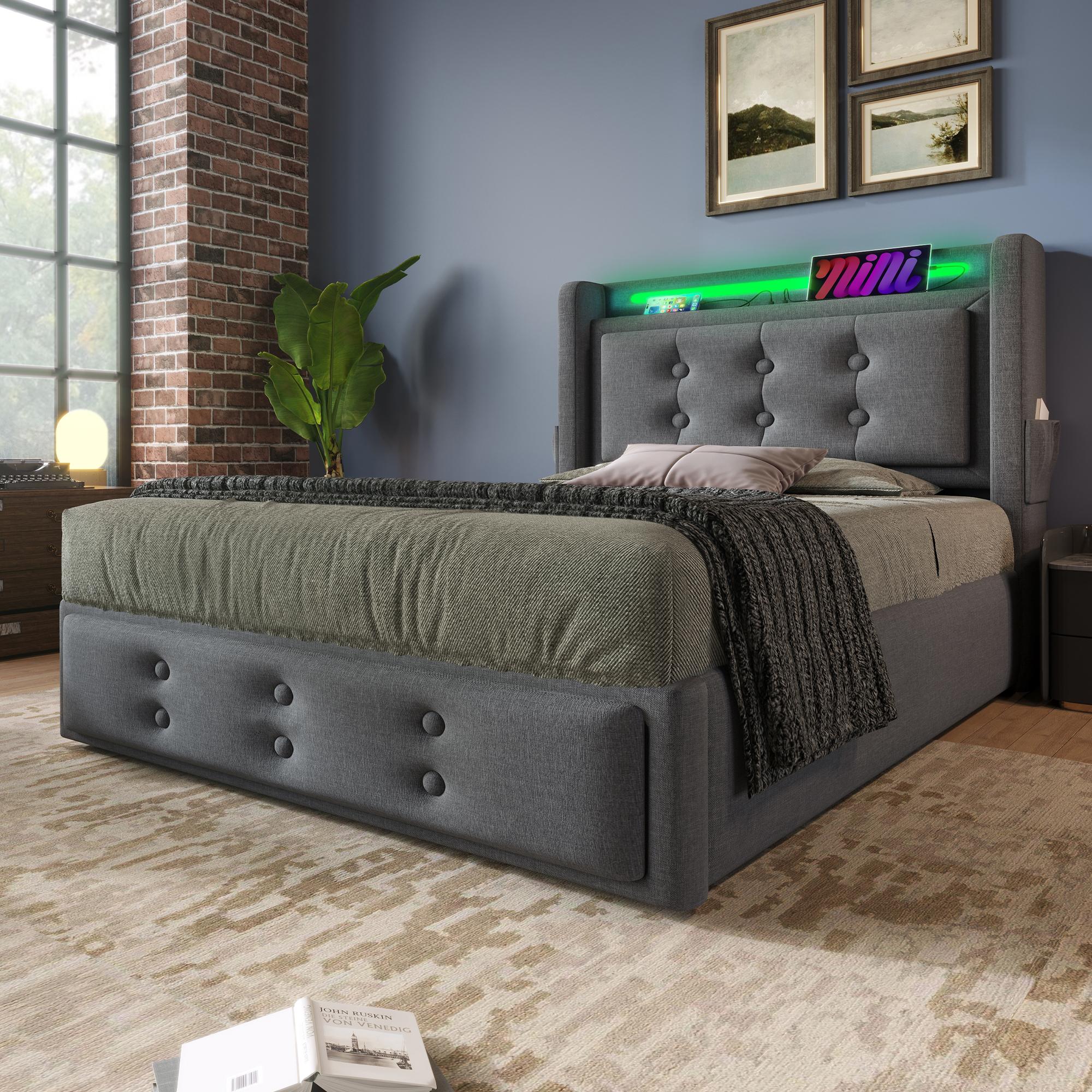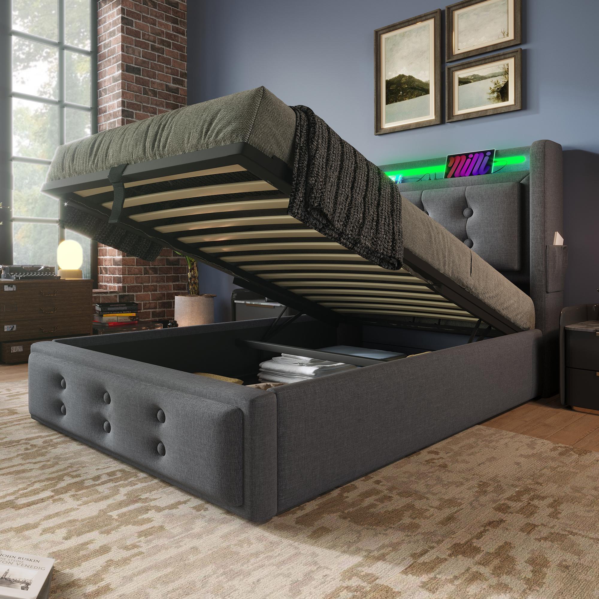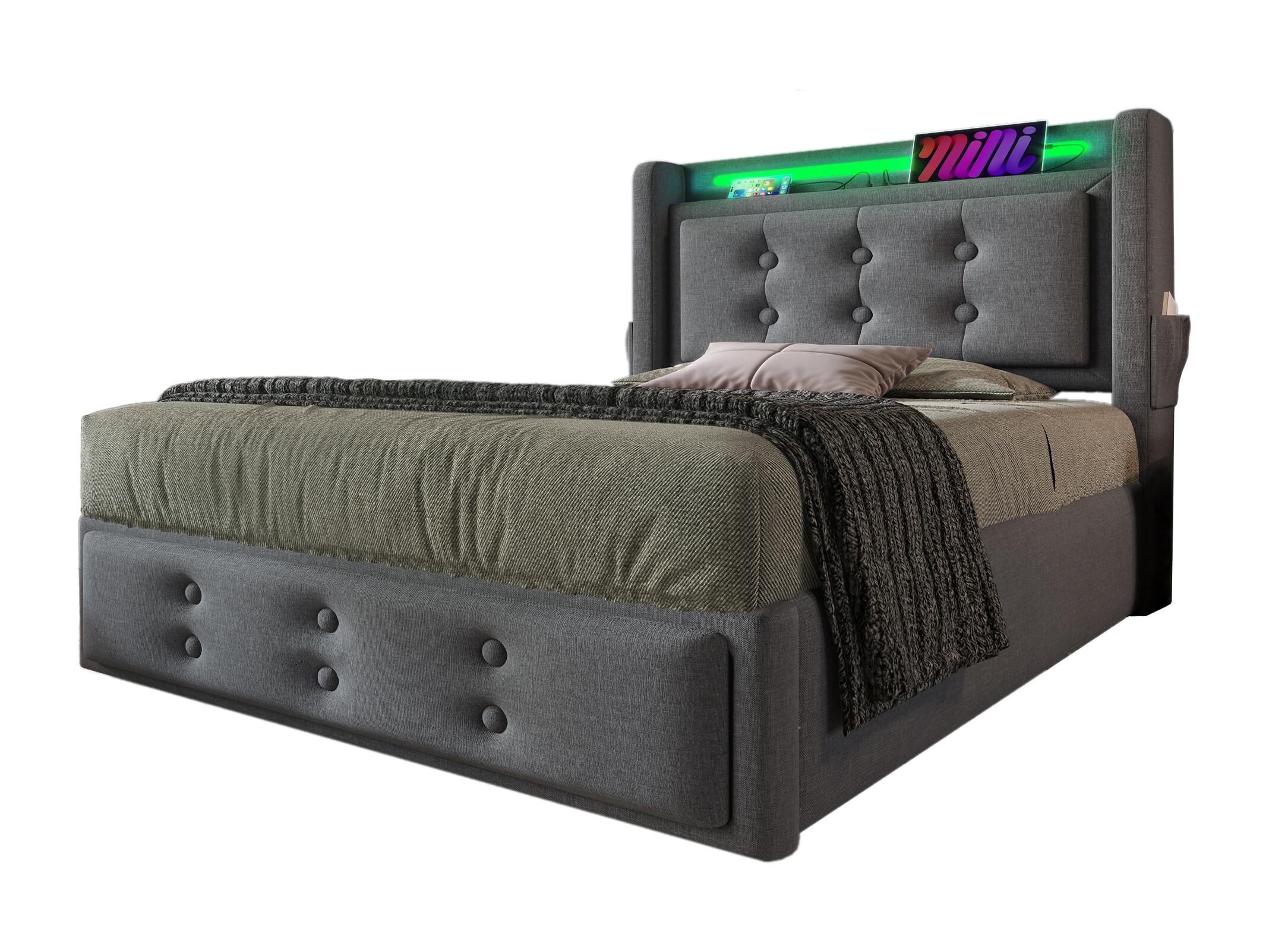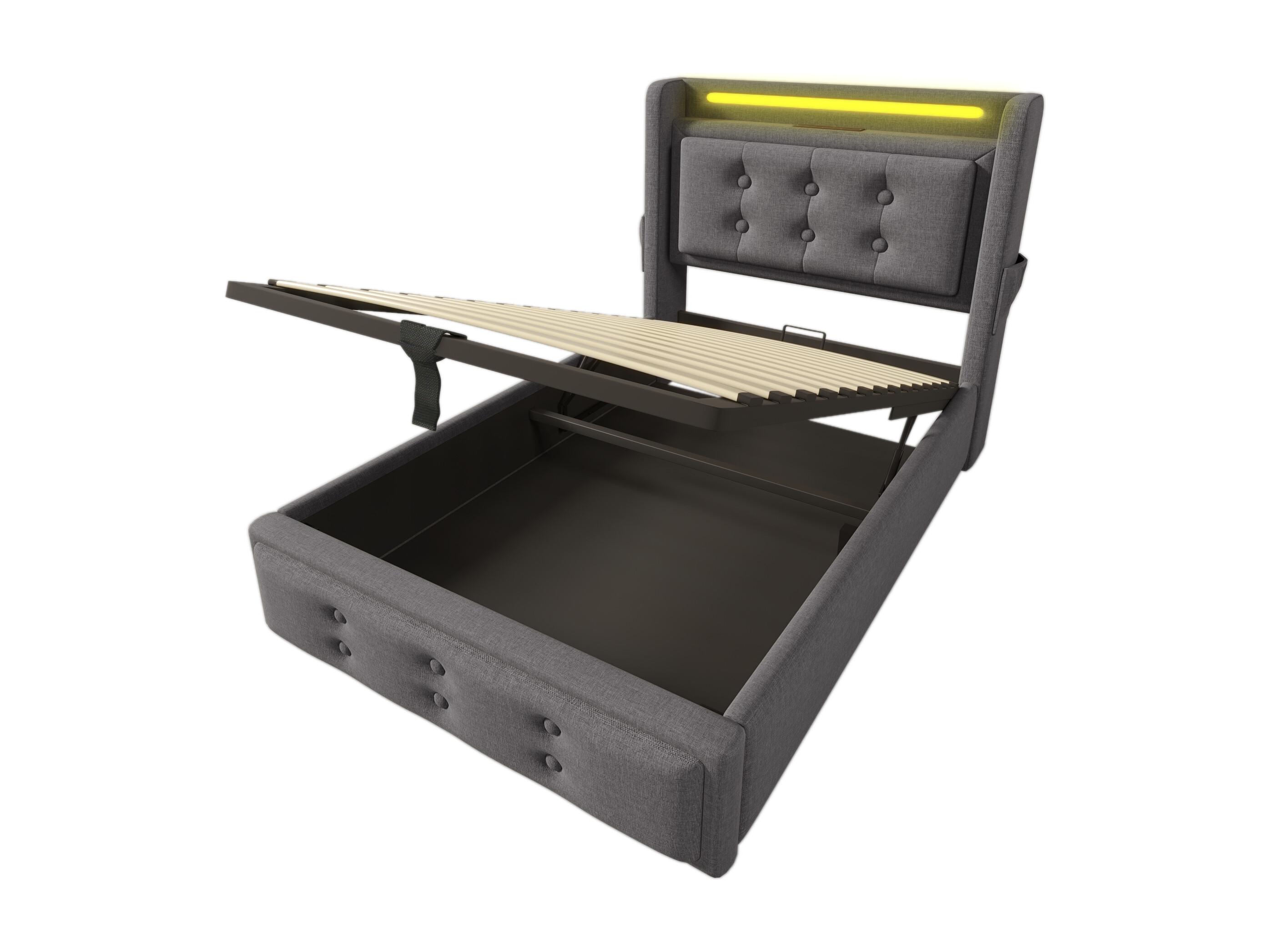 Lit individuel 90x200 avec tête de lit LED et port USB-C, lit hydraulique avec sommier en bois et cadre métallique, capacité 150 kg, gris, coton (sans matelas)