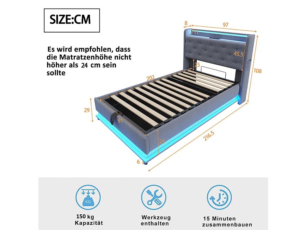 Lit jeune lit 90x200cm lit hydraulique rembourré lit de rangement avec lampes à couleurs changeantes et prise usb lit simple tissu de lin gris