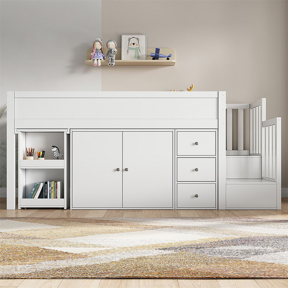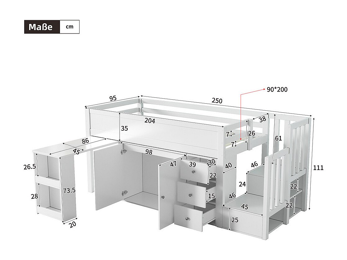 Lit jeune lit 90×200cm lit superposé avec bureau, armoire, tiroir et escalier mdf blanc