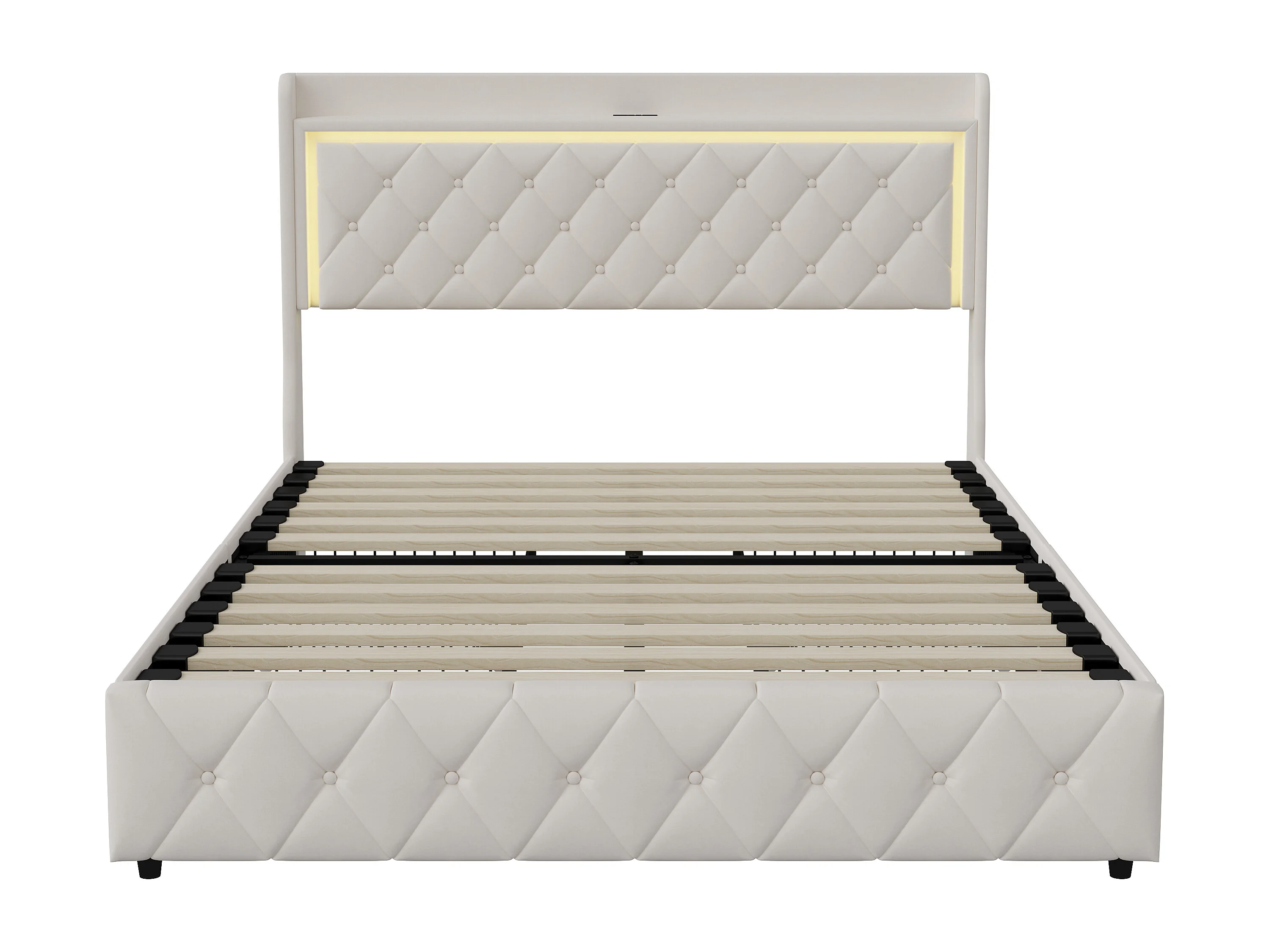 Lit jeunesse avec 4 tiroirs de stockage - Lit rembourré avec USB et port de charge USB Type-C - tête LED - Velvet - Beige -140x200cm