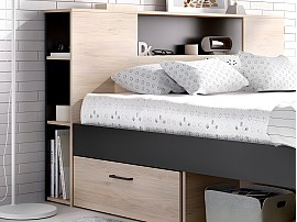 Lit avec tête de lit rangements et tiroirs - 160 x 200cm - Coloris : Naturel et anthracite - LEANDRE