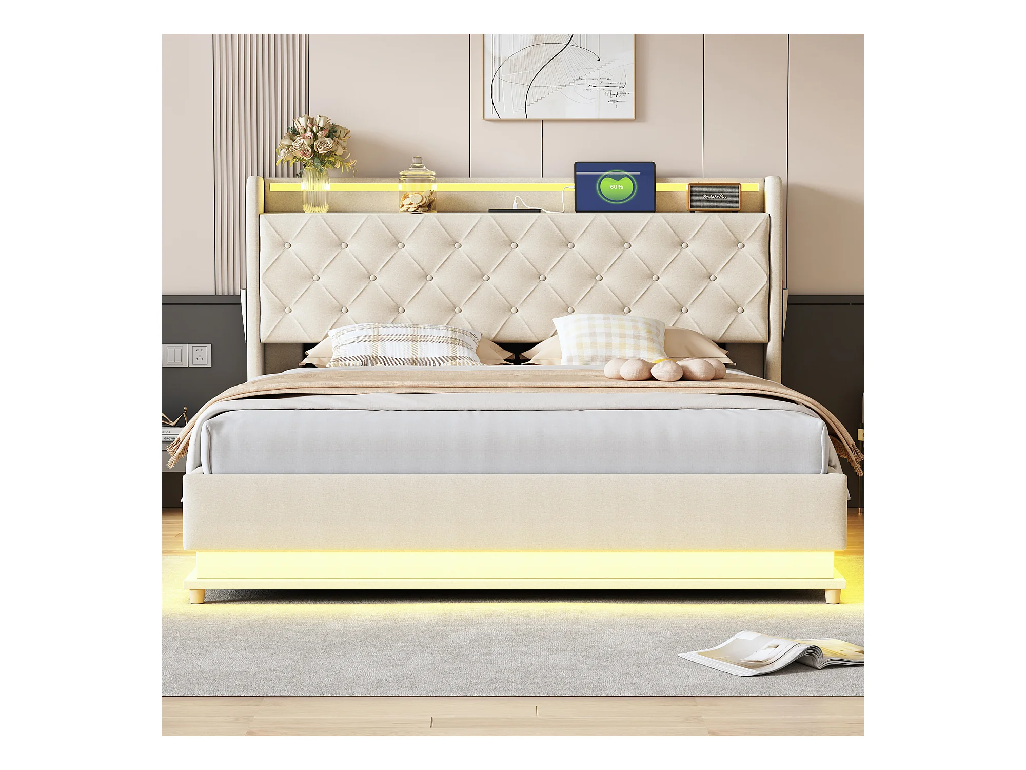 Lit LED 160 x 200 cm avec Port USB et Rangement Hydraulique, en Tissu Lin Beige