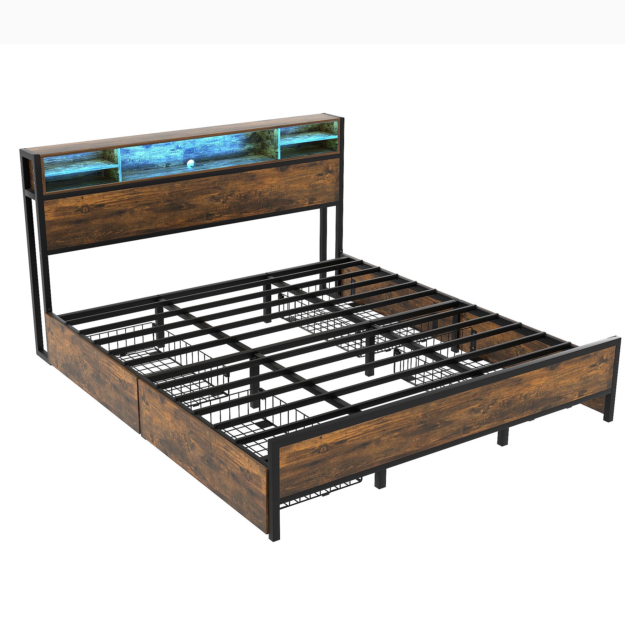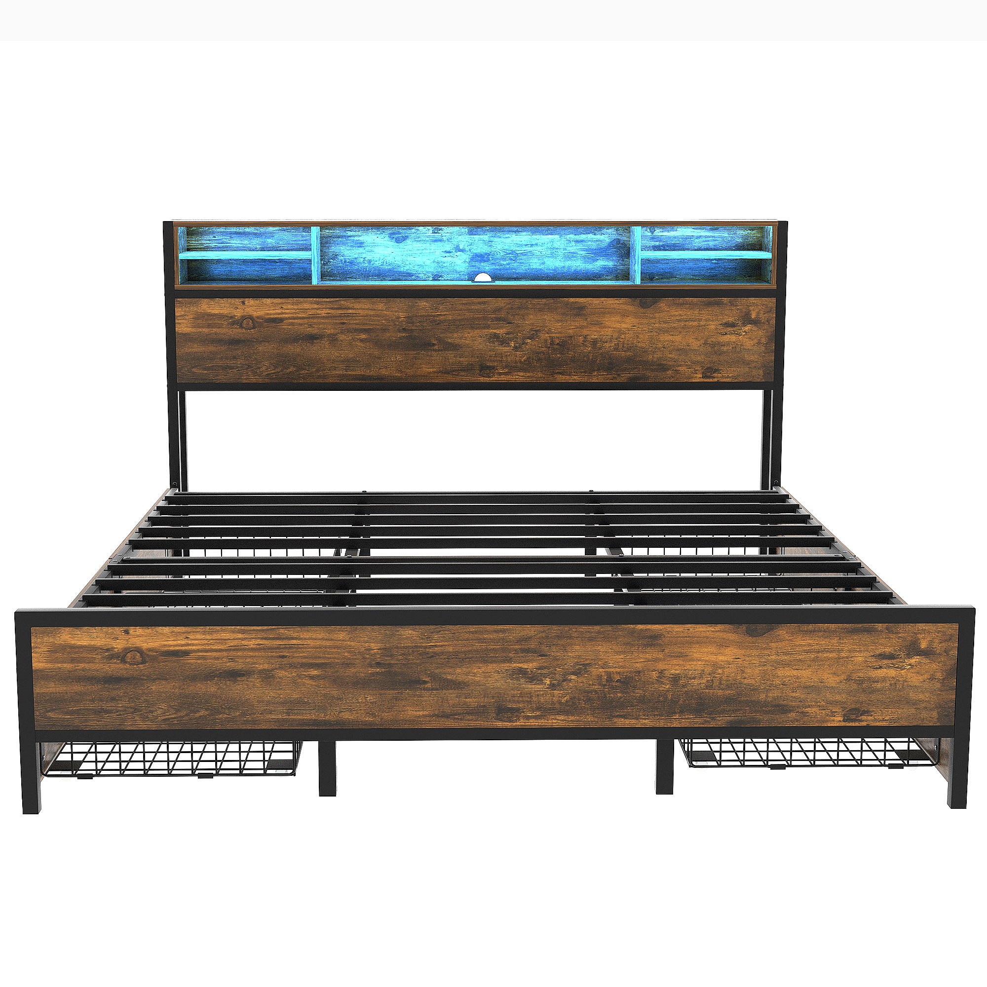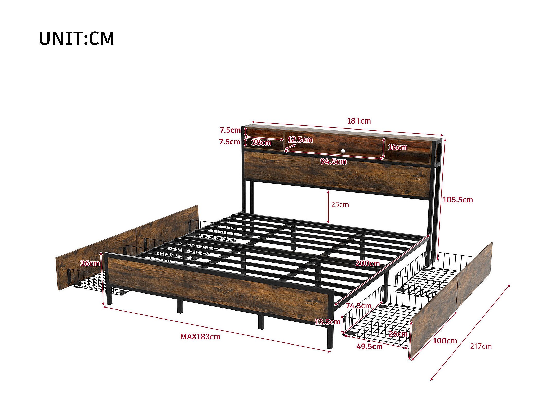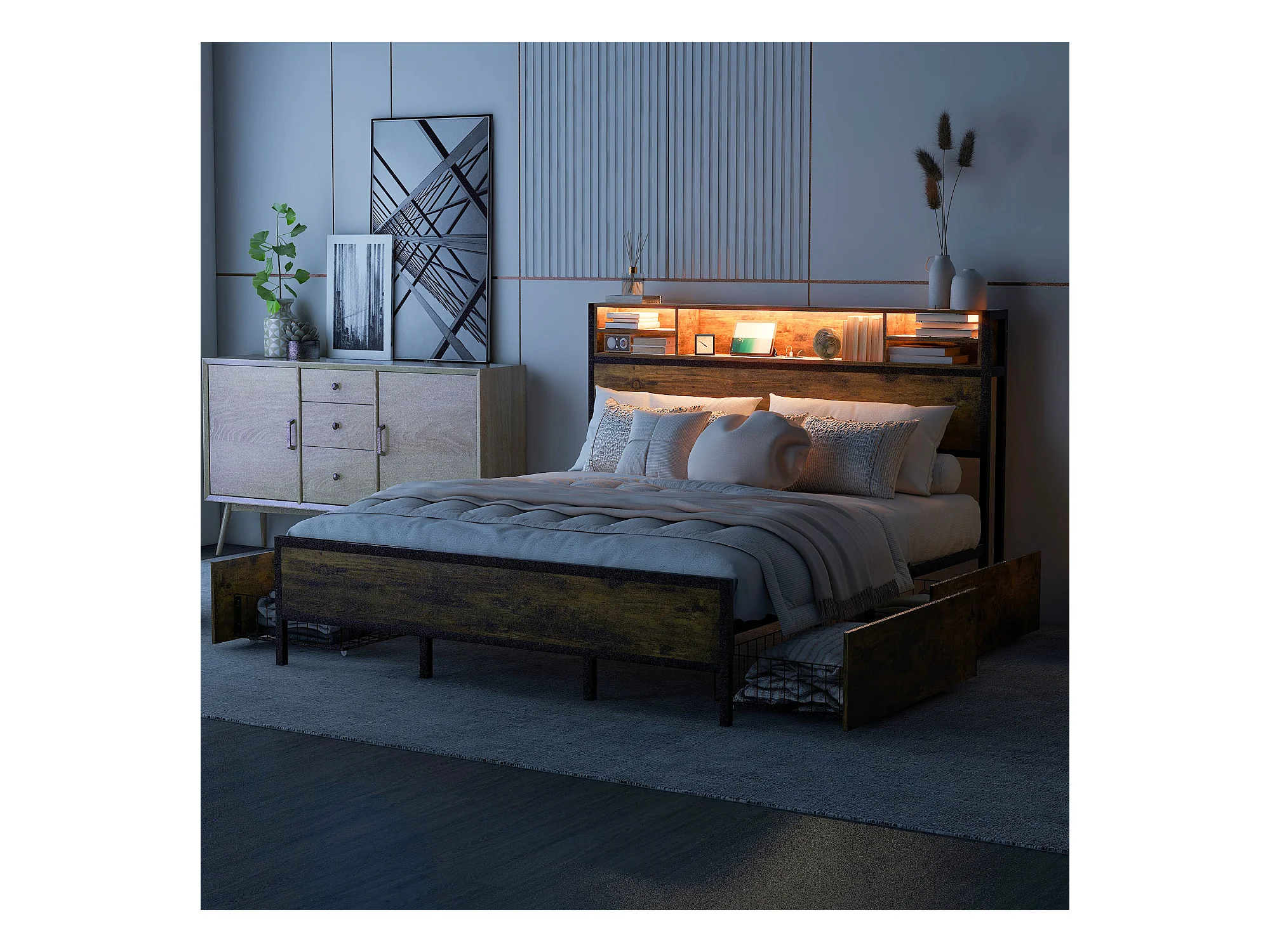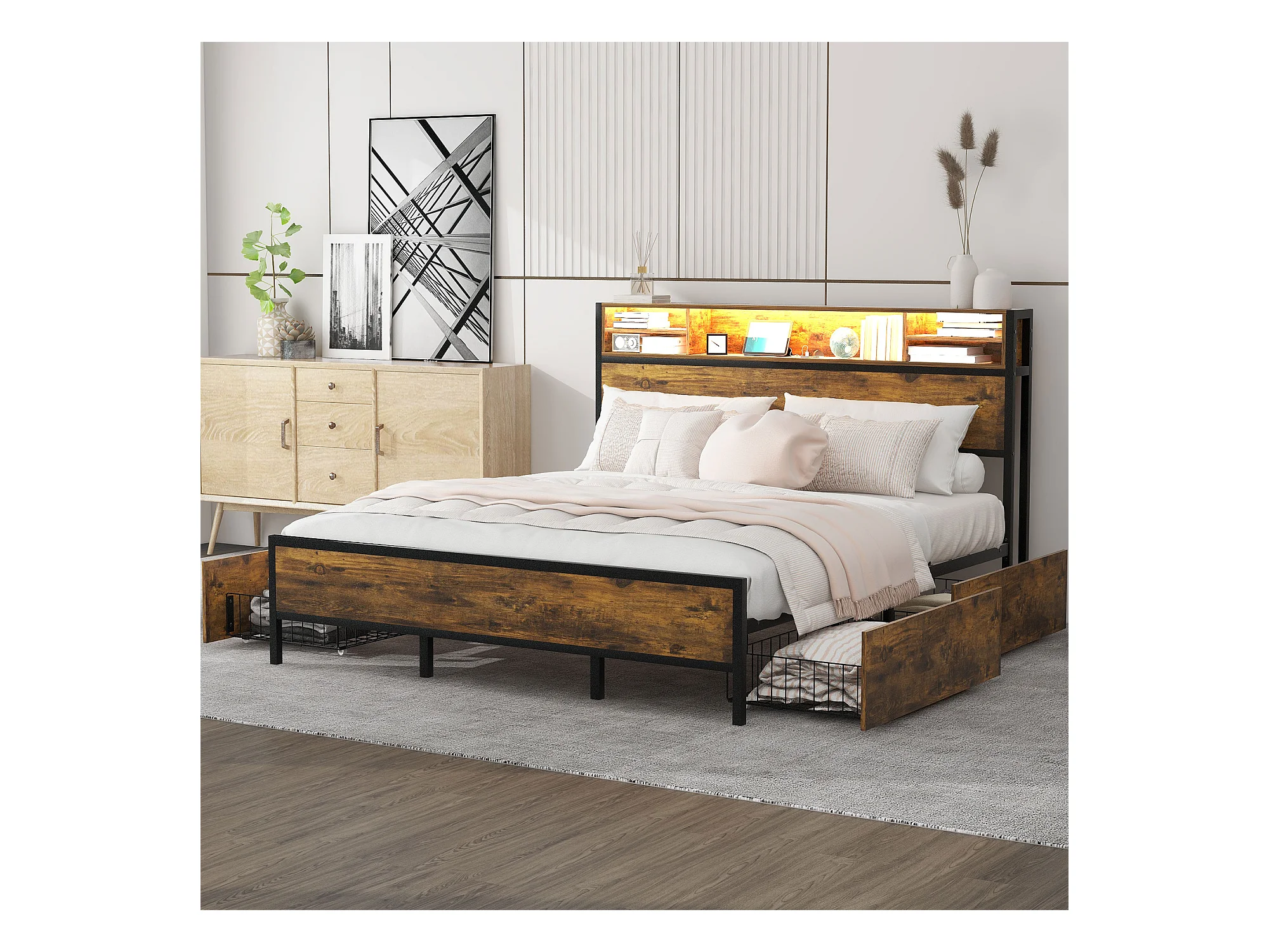Lit LED 180x200 cm marron avec tête de lit, ports USB, 4 tiroirs et grand rangement, cadre métallique robuste
