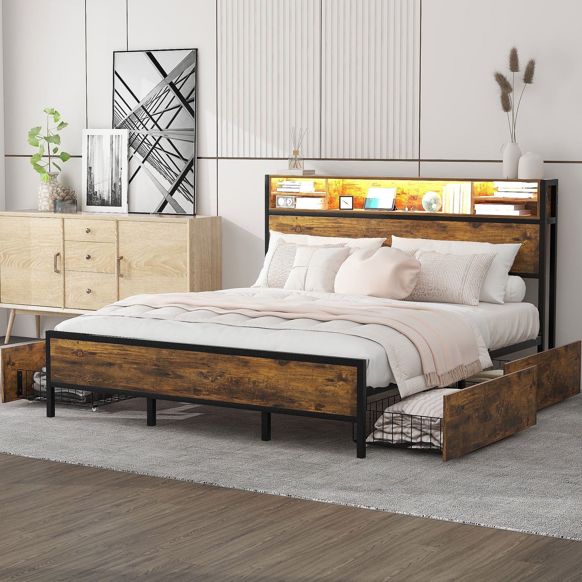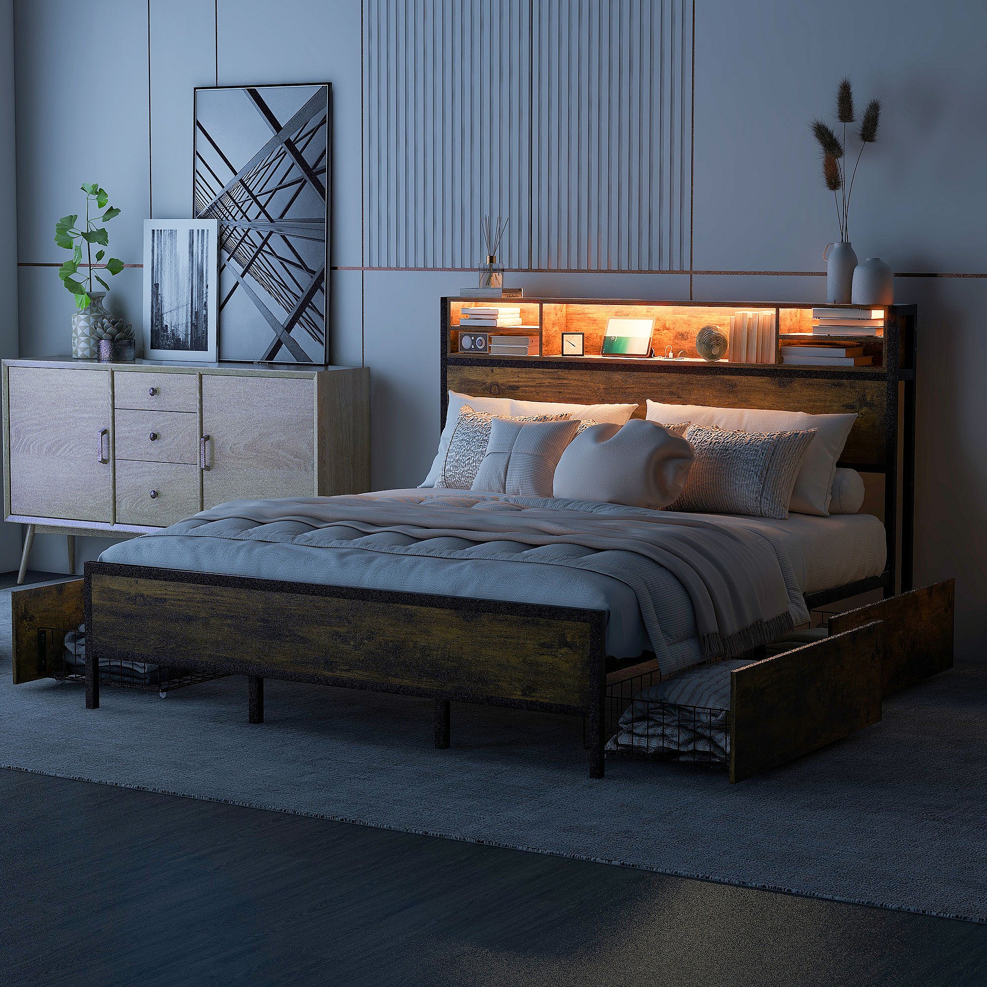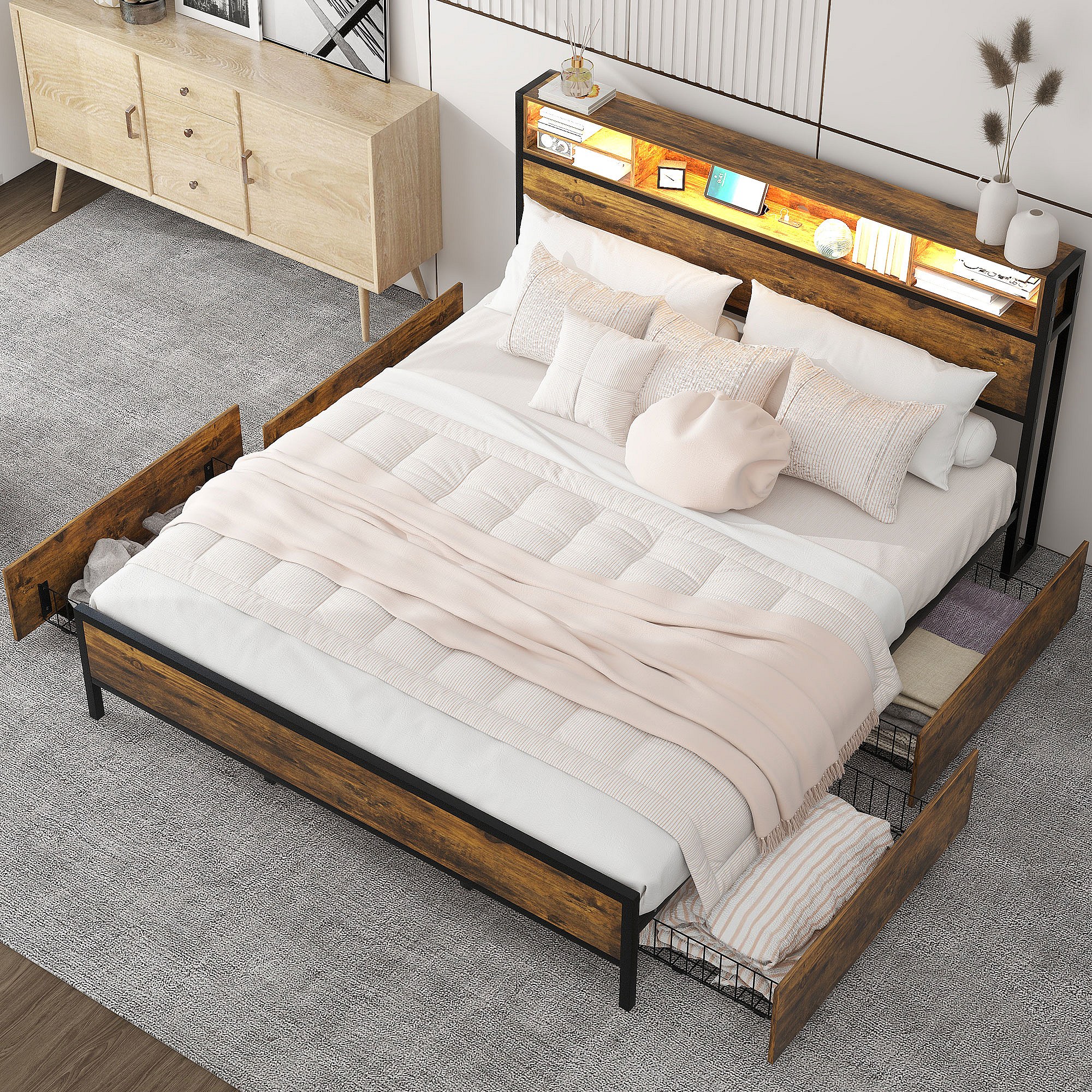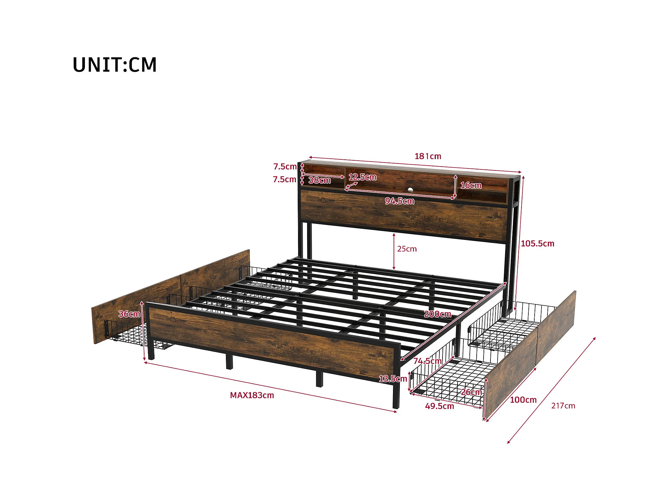Lit LED 180x200 cm marron avec tête de lit, ports USB, 4 tiroirs et grand rangement, cadre métallique robuste