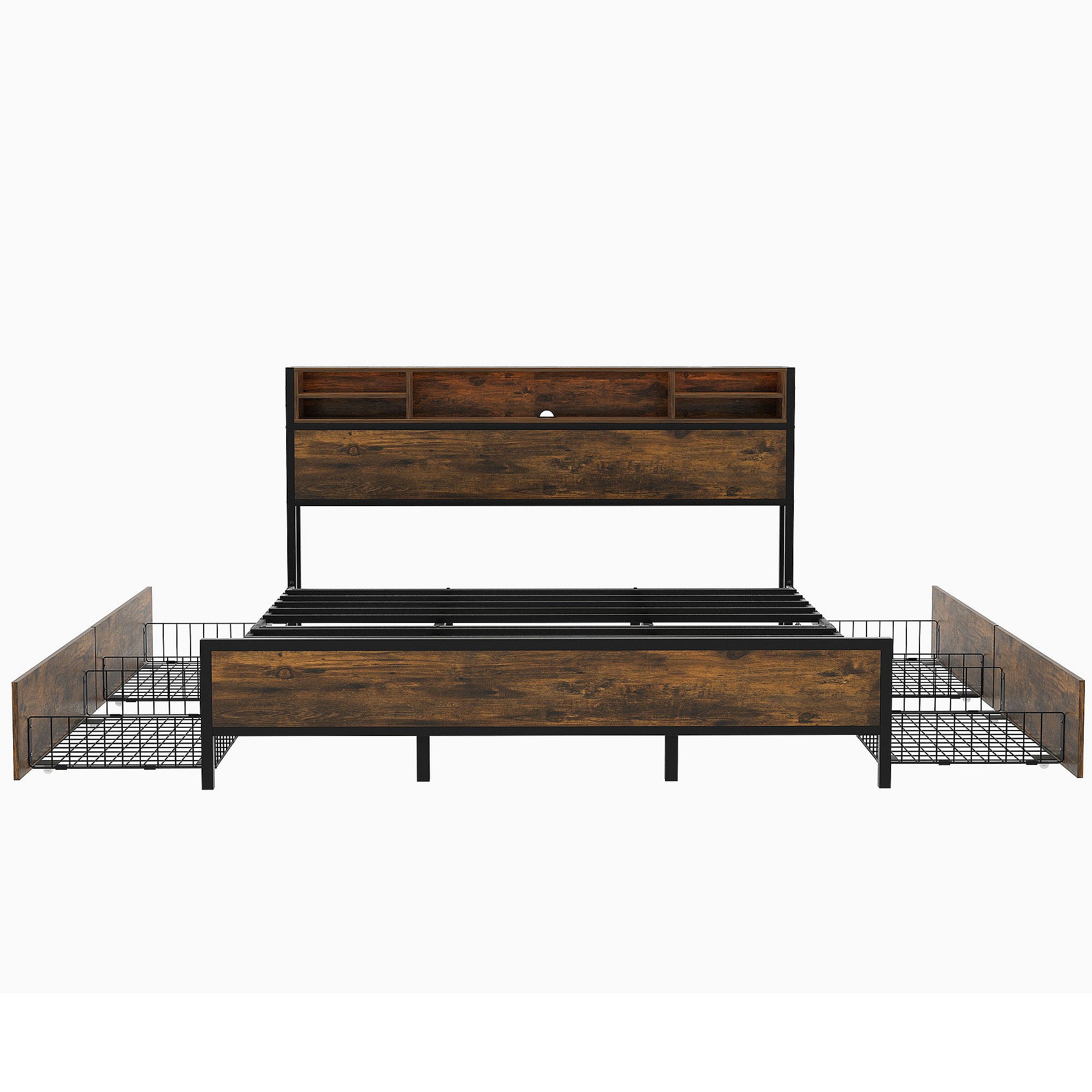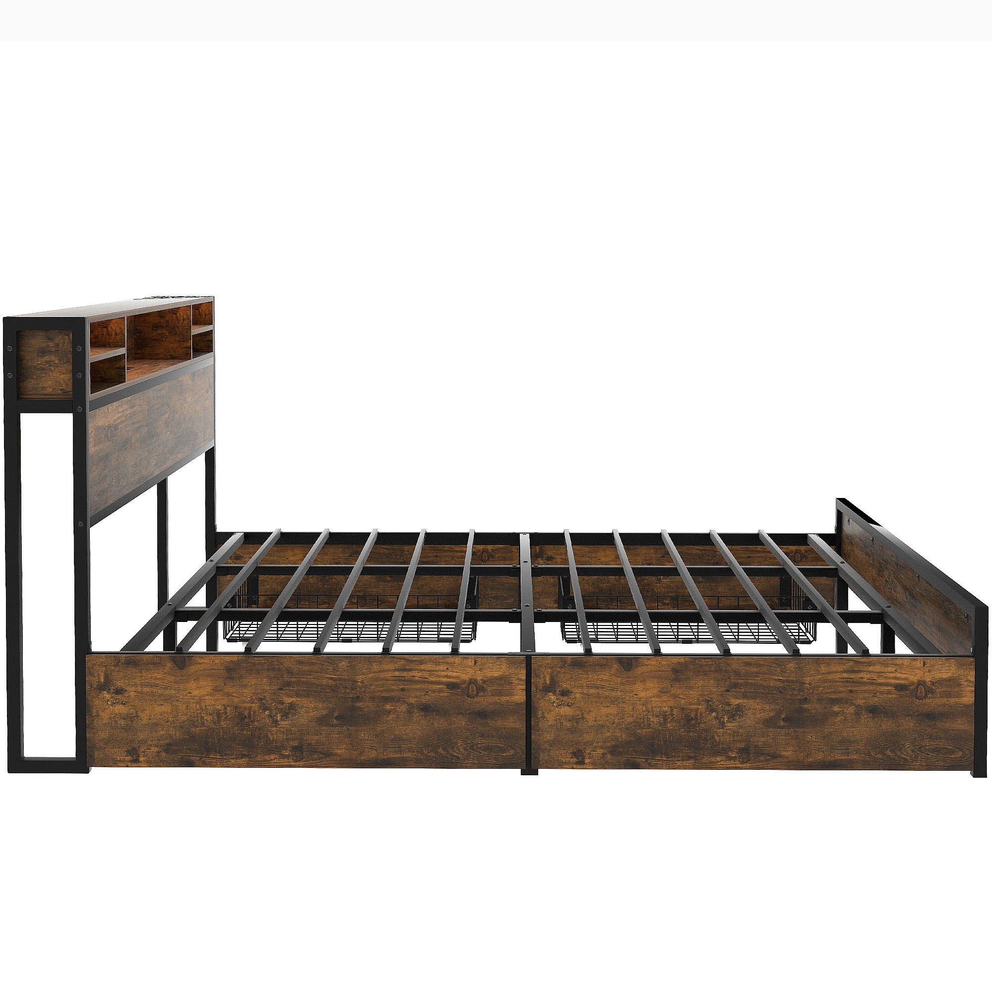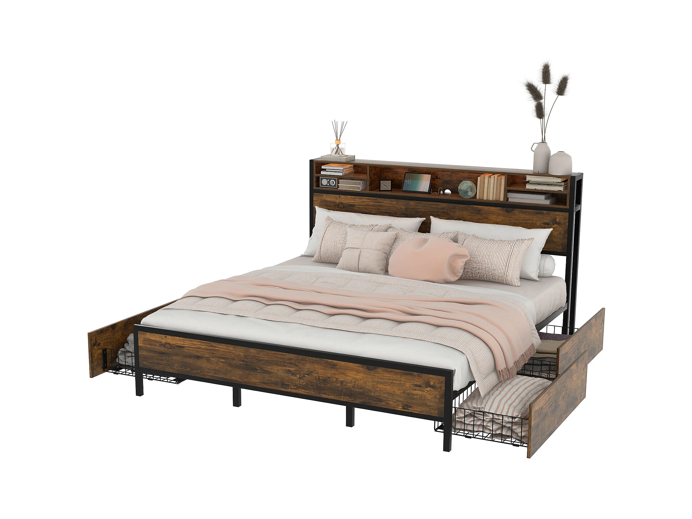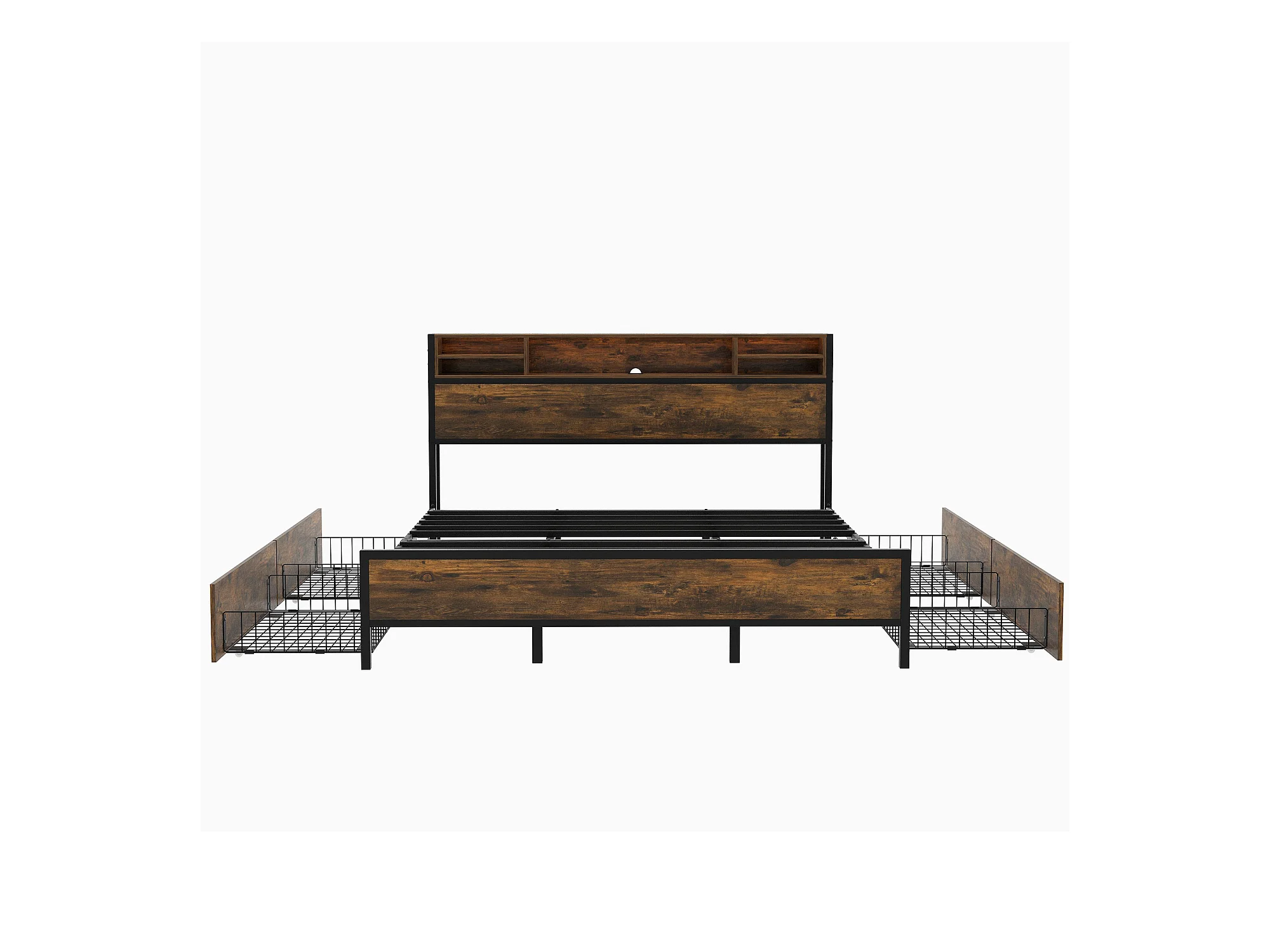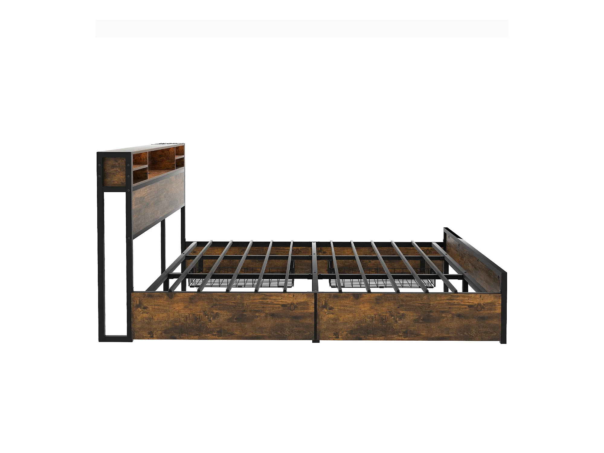 Lit LED 180x200 cm marron avec tête de lit, ports USB, 4 tiroirs et grand rangement, cadre métallique robuste