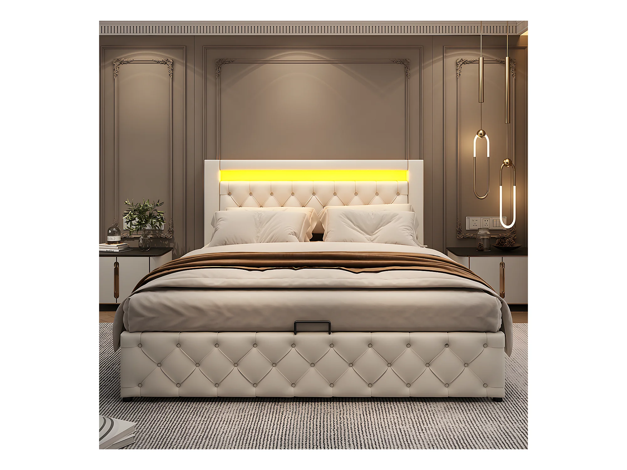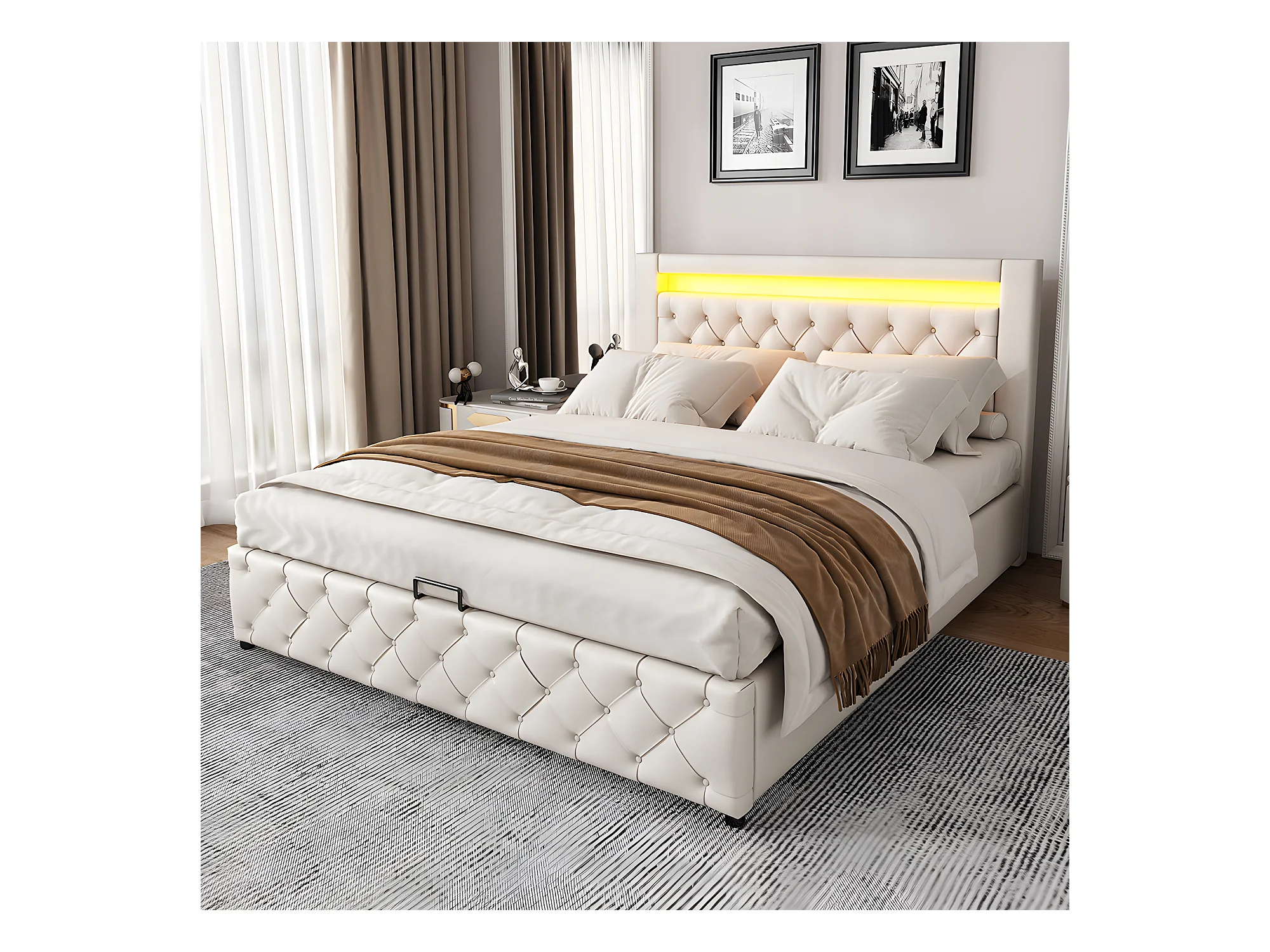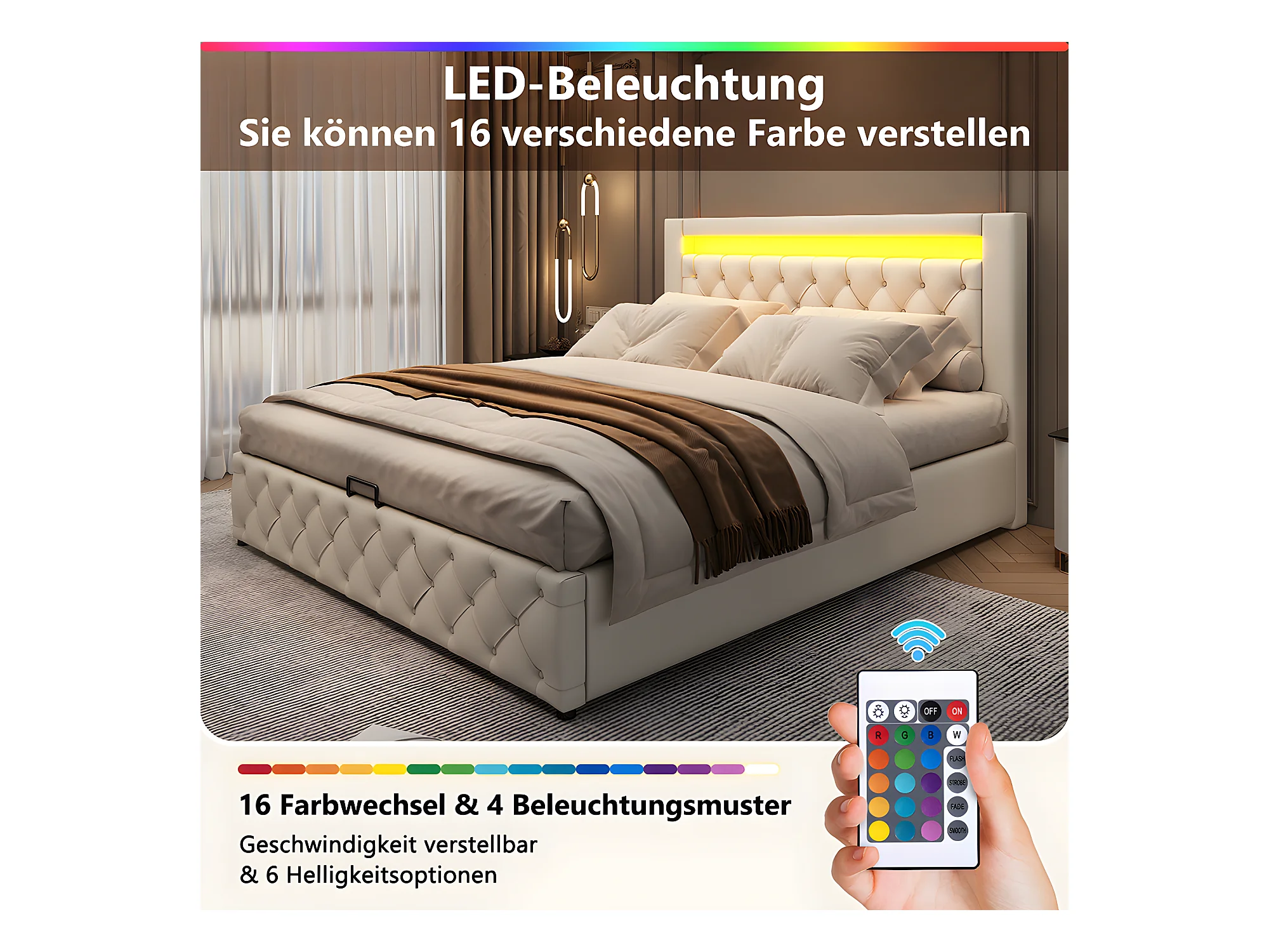 Lit LED avec coffre - 140 x 200 cm - avec sommier à lattes relevable - Beige - Sweiko