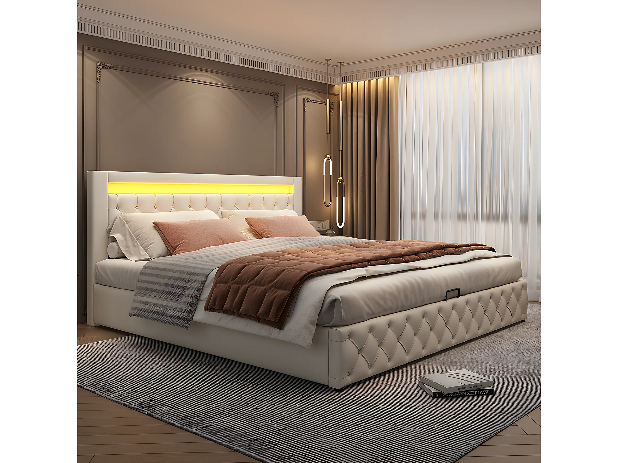 Lit LED avec coffre - 180 x 200 cm - avec sommier à lattes relevable - Beige - Sweiko