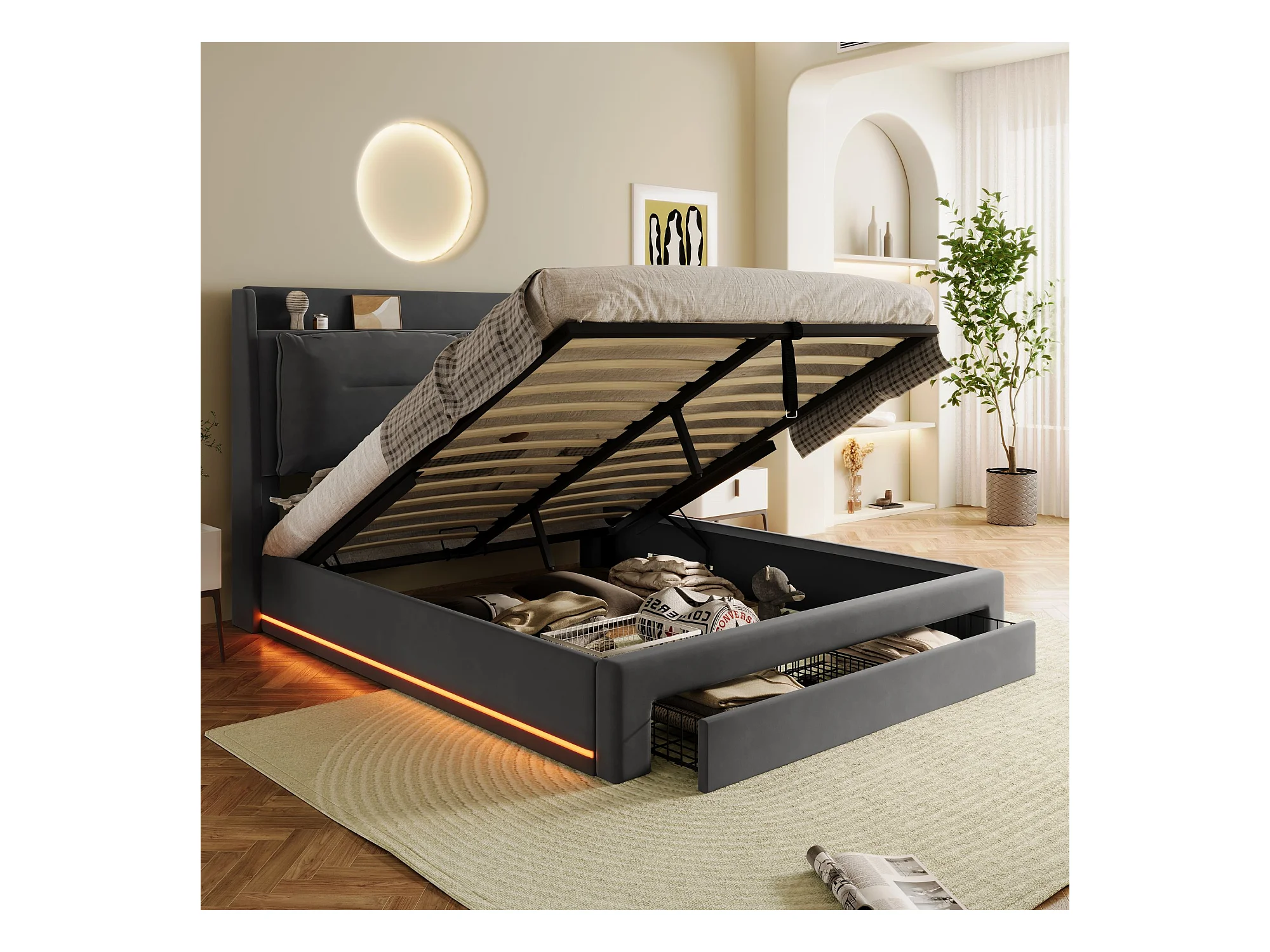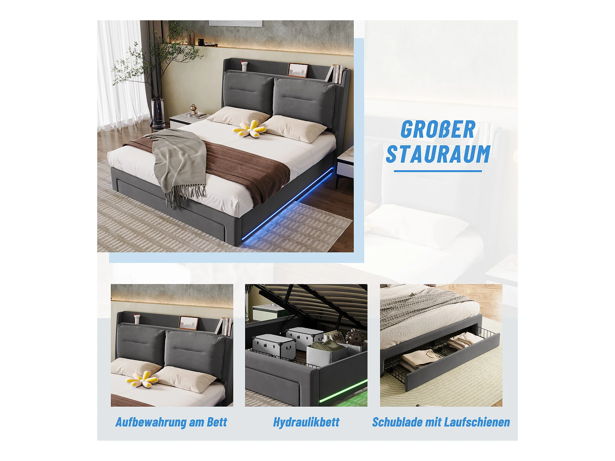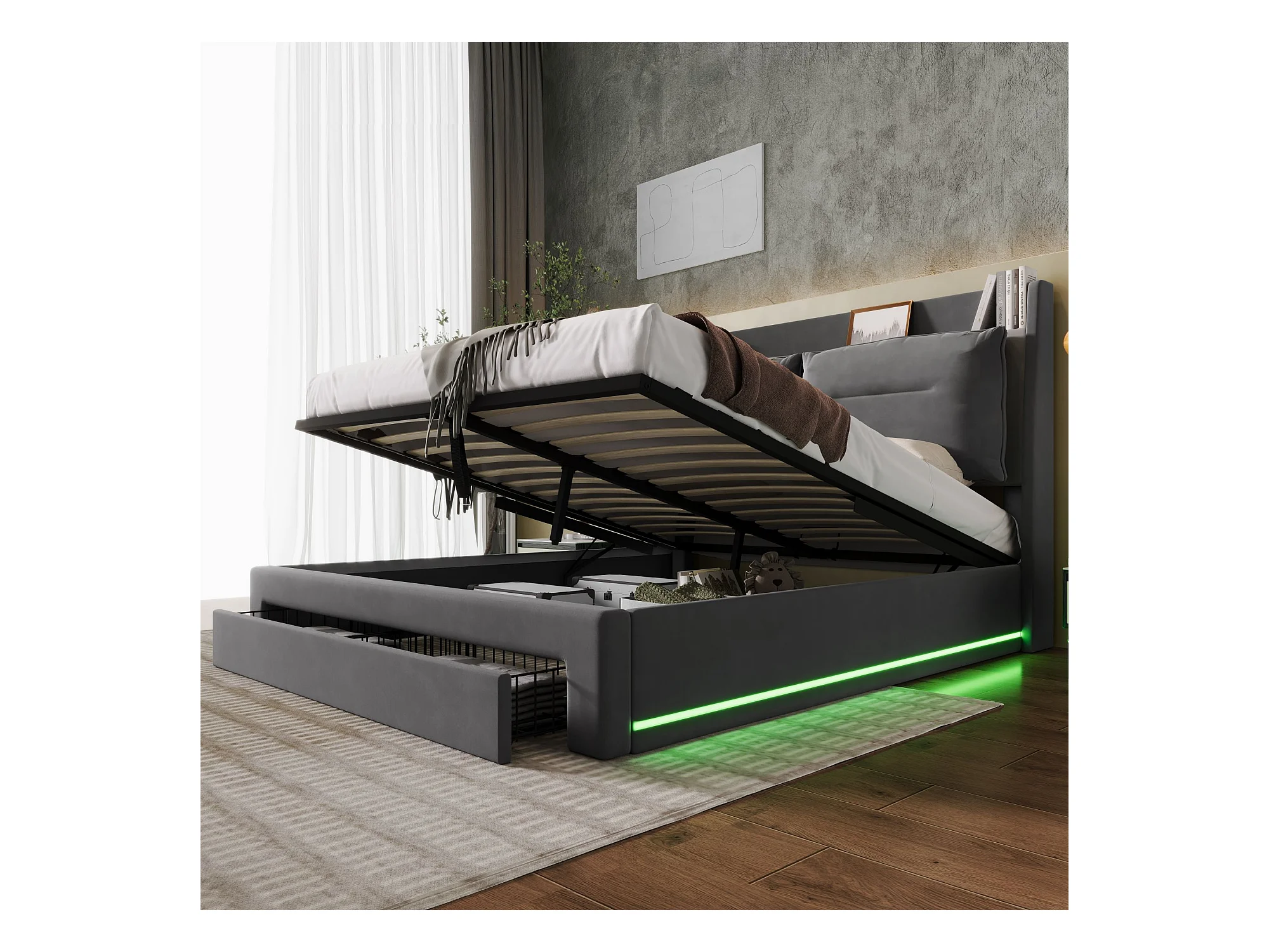 Lit LED avec rangement hydraulique, 2-in-1 tiroirs, velours gris foncé, 160x200 cm (198x30x18 cm)