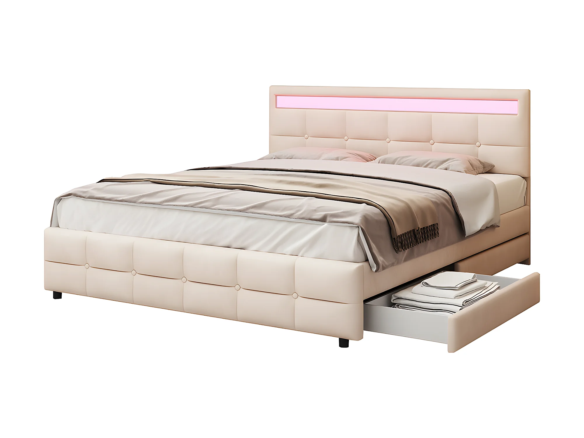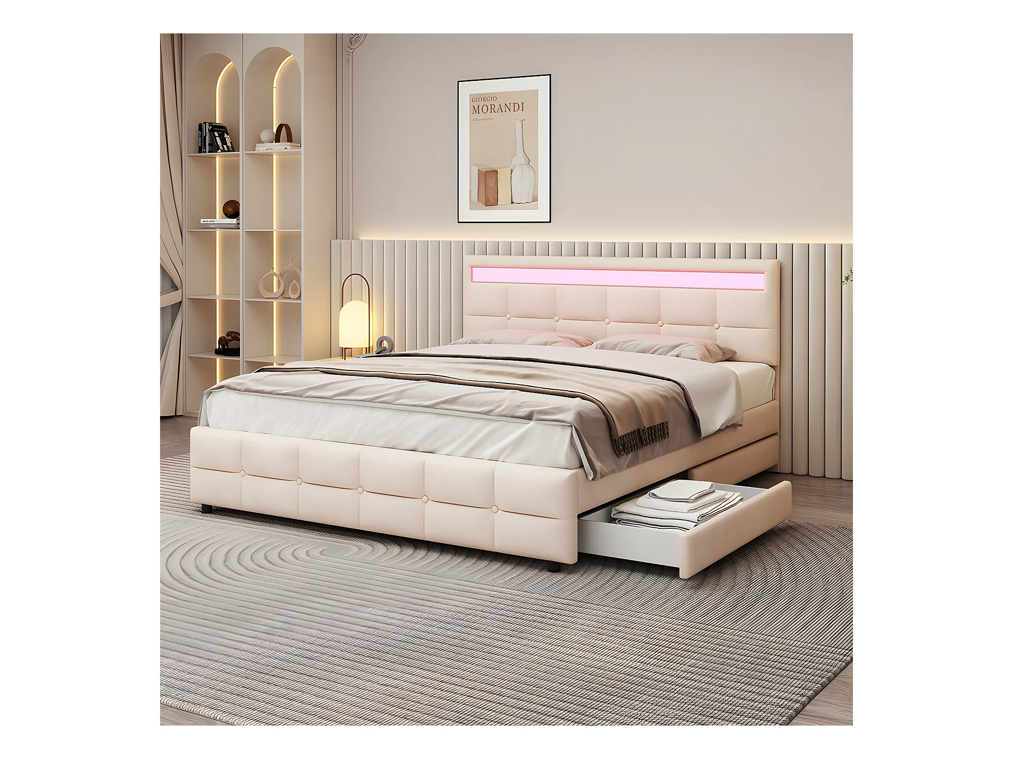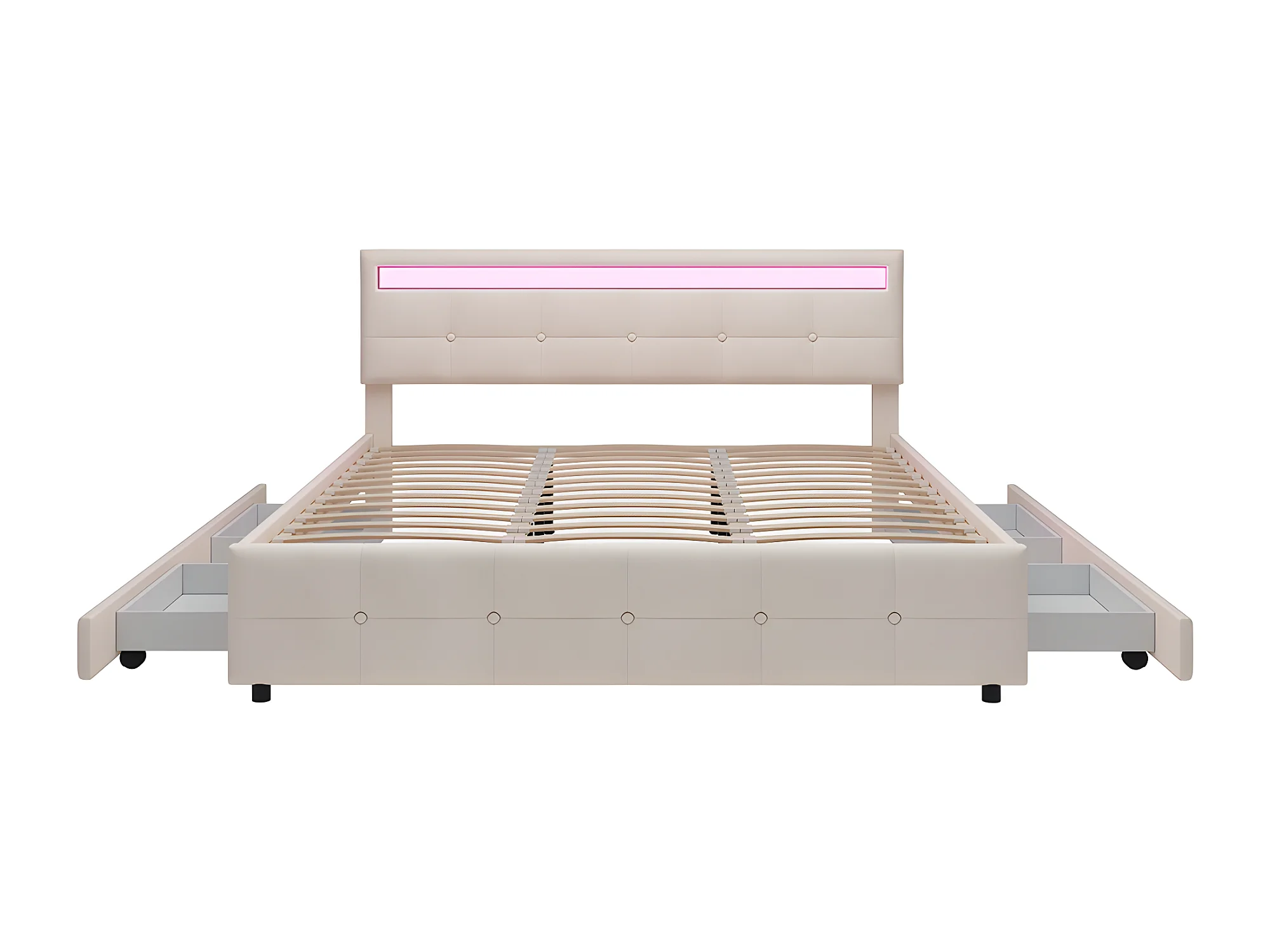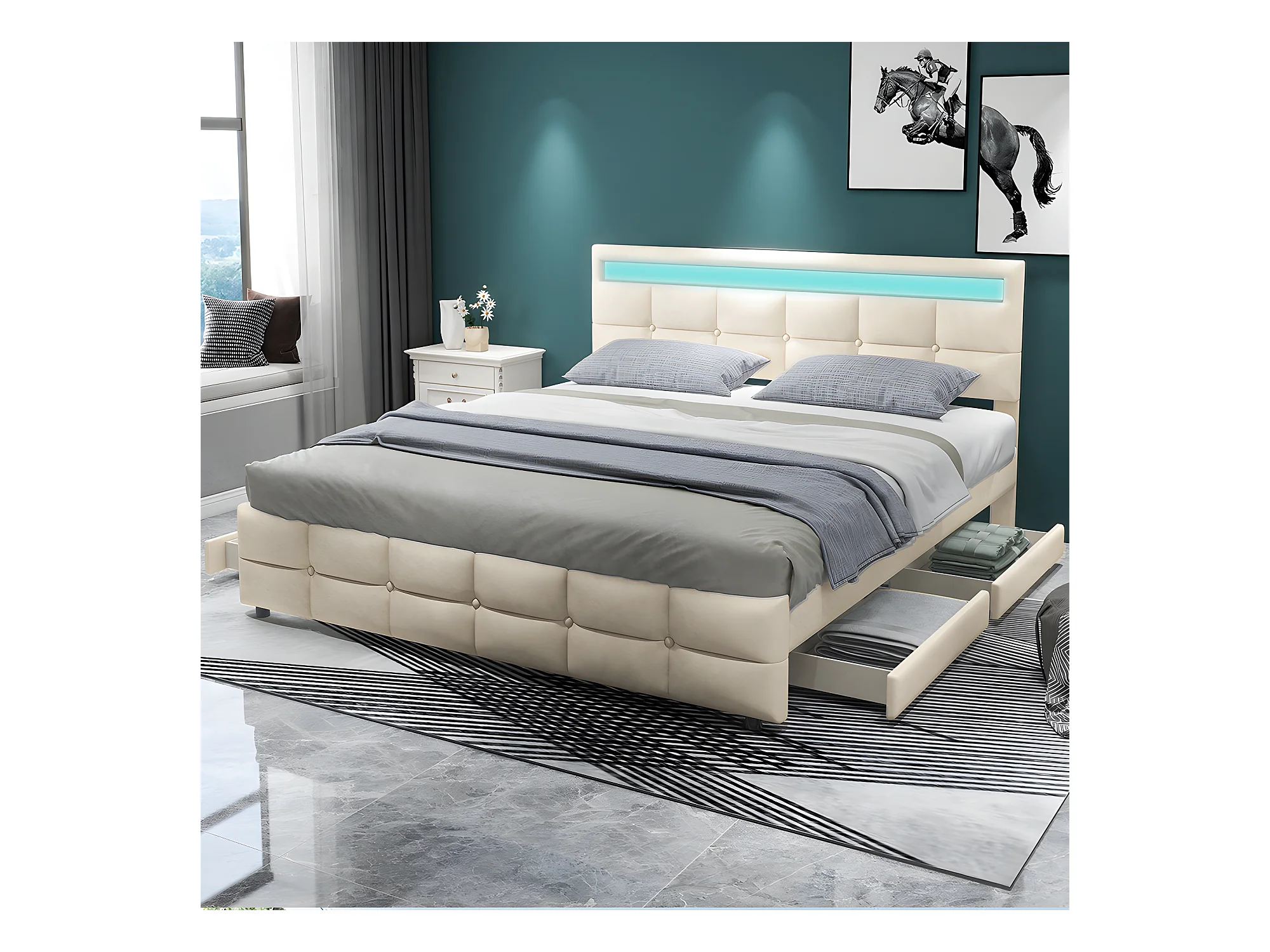 Lit LED avec tête de lit rangements et 4 tiroirs - 180 x 190 cm - Beige - Sweiko