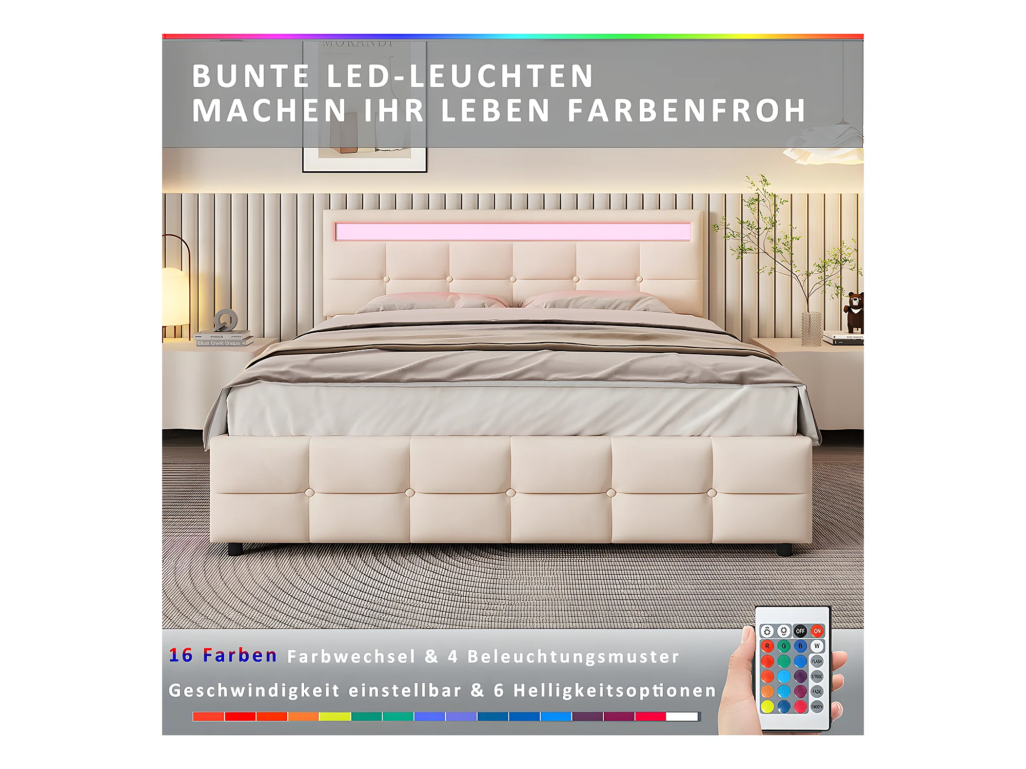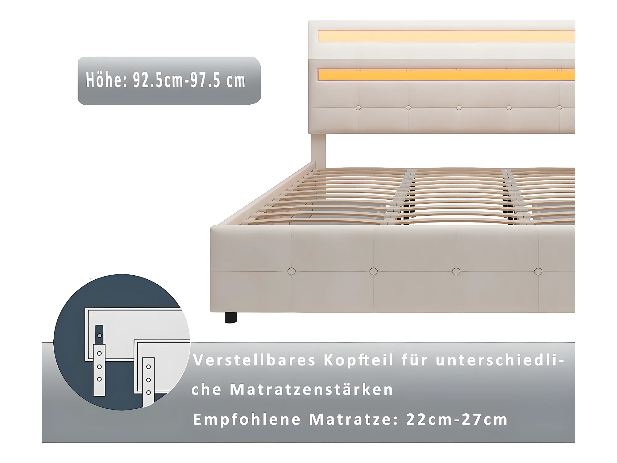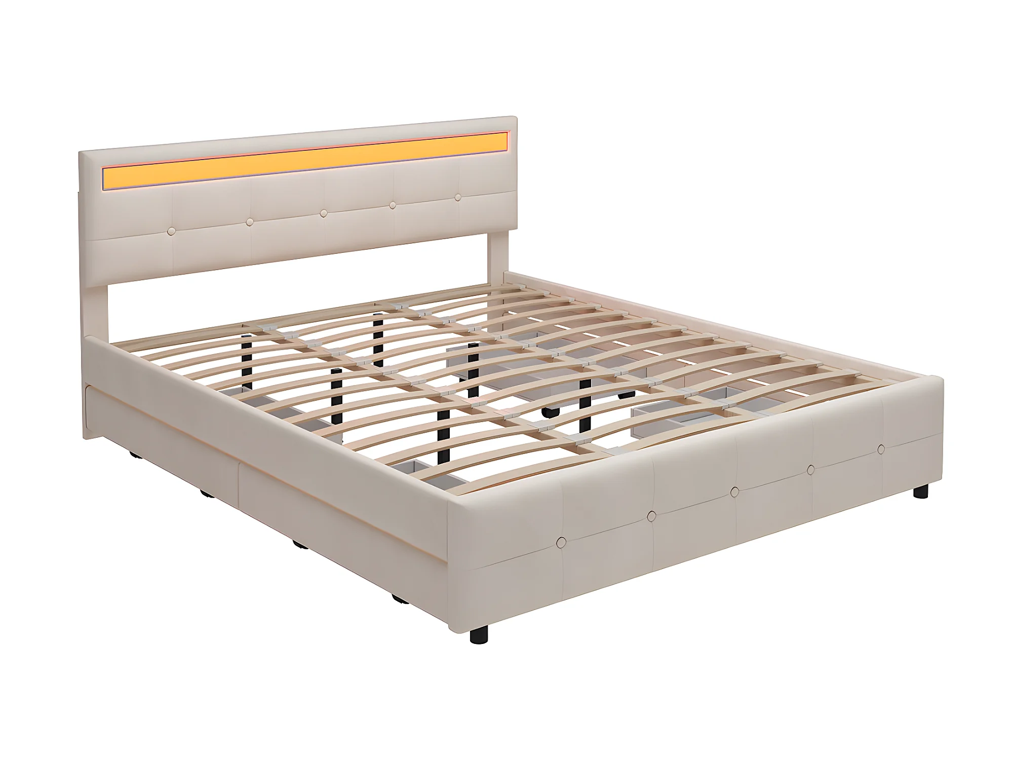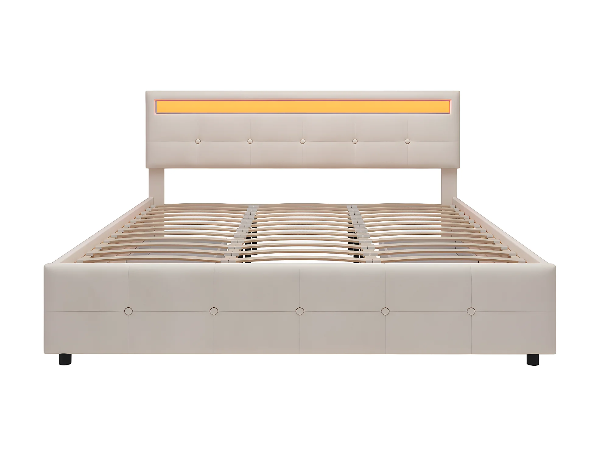 Lit LED avec tête de lit rangements et 4 tiroirs - 180 x 190 cm - Beige - Sweiko