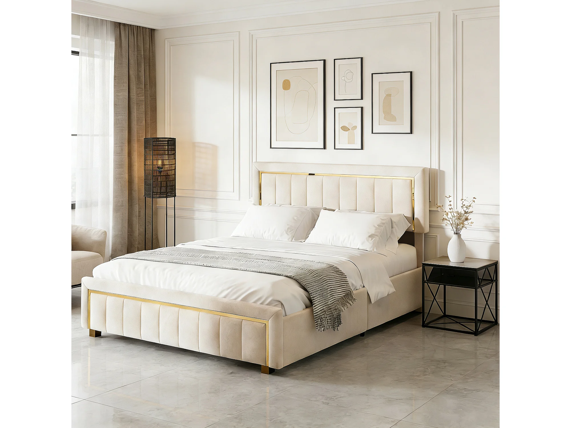 Lit adulte 160x200 cm avec sommier à lattes - Lit double 160x200 coffre rangement soldes - style scandinave - tissu en velours - blanc cassé