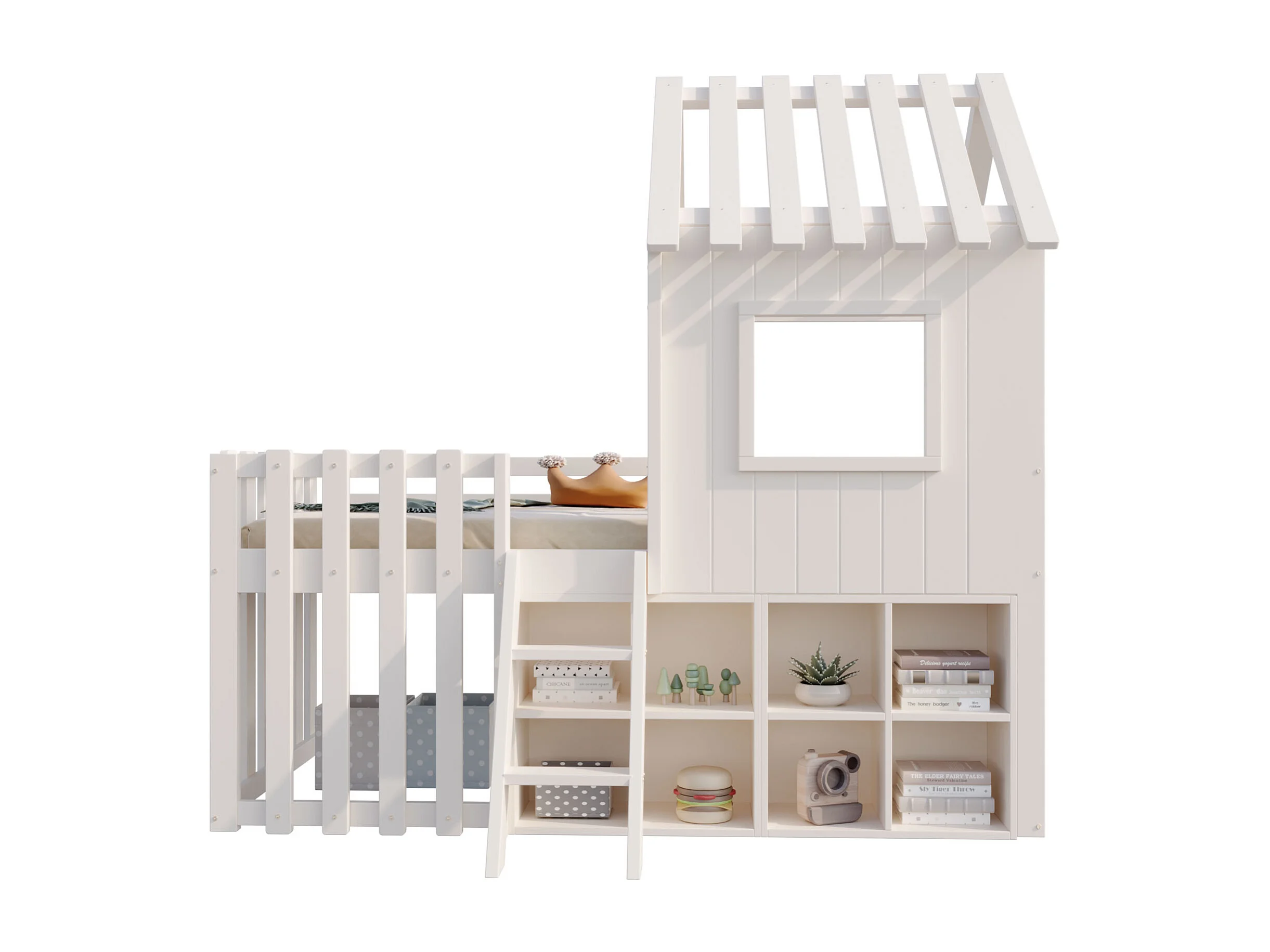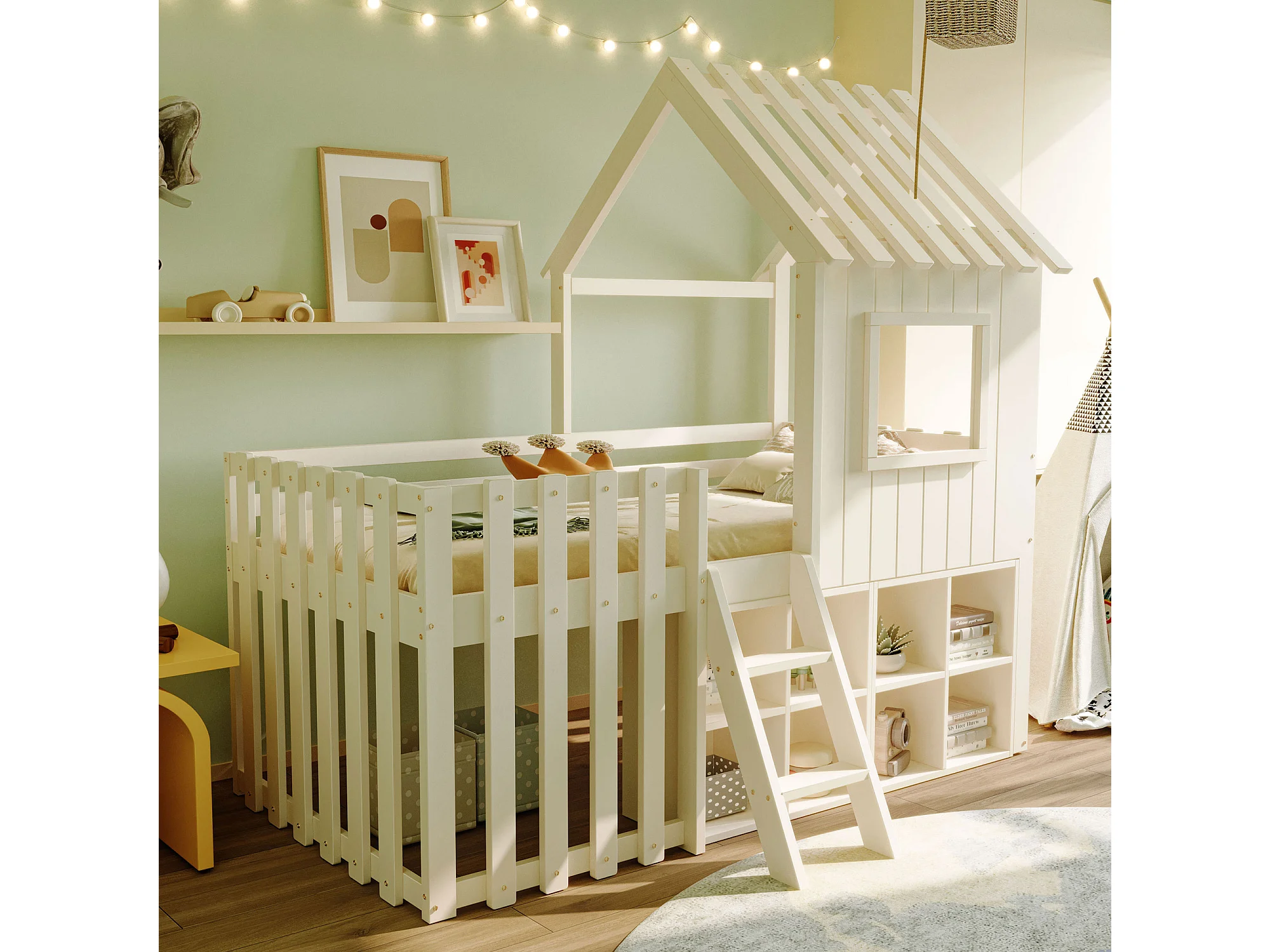 Lit maison 90x200 cm, toit et fenêtre, rangement ouvert, échelle, lit mezzanine enfants, bois massif, sans matelas, blanc