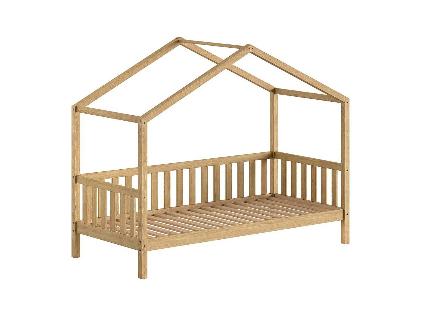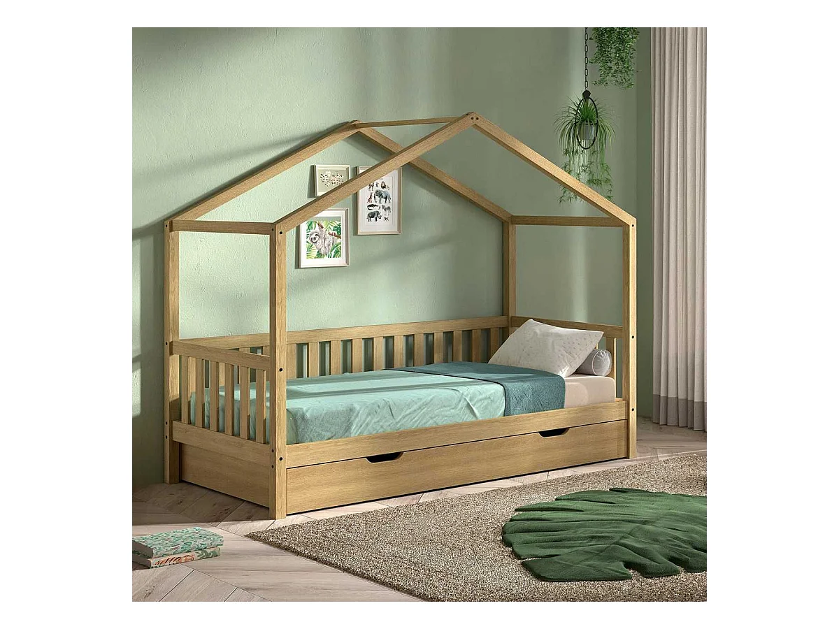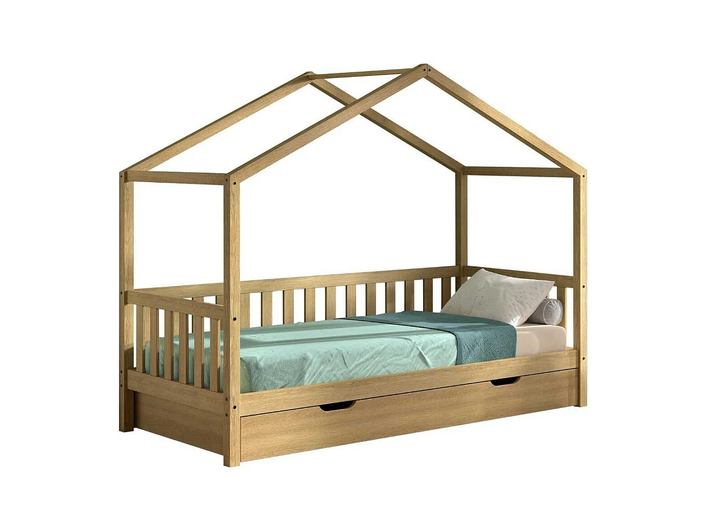 Lit maison à barrière 90x200 avec tiroir en chêne massif - LEIKY