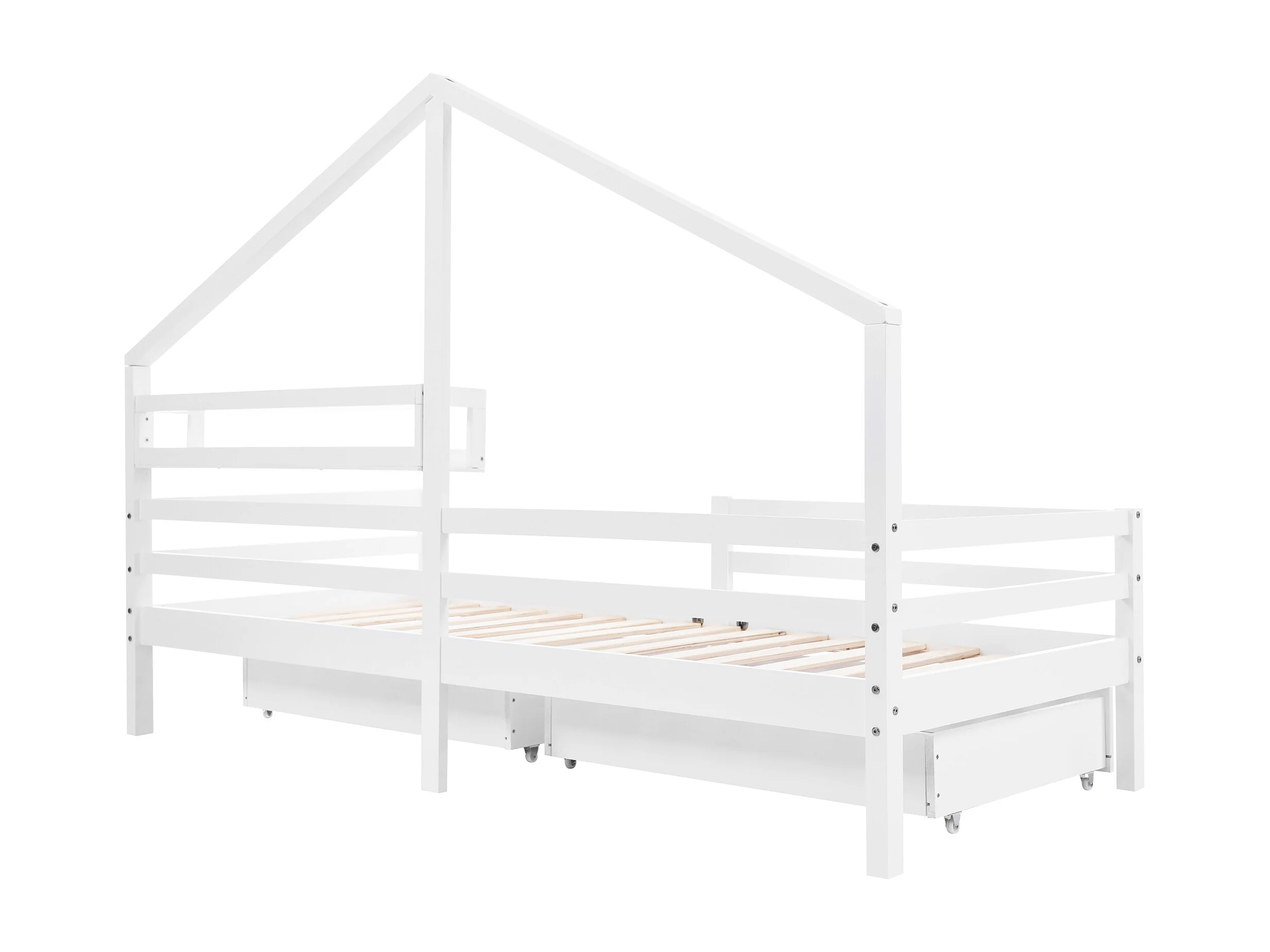 Lit Maison Simple 90 X 200 cm Avec Étagère De Rangement Et Deux Grands Tiroirs - Forme Cheminée - Bois De Pin - Blanc