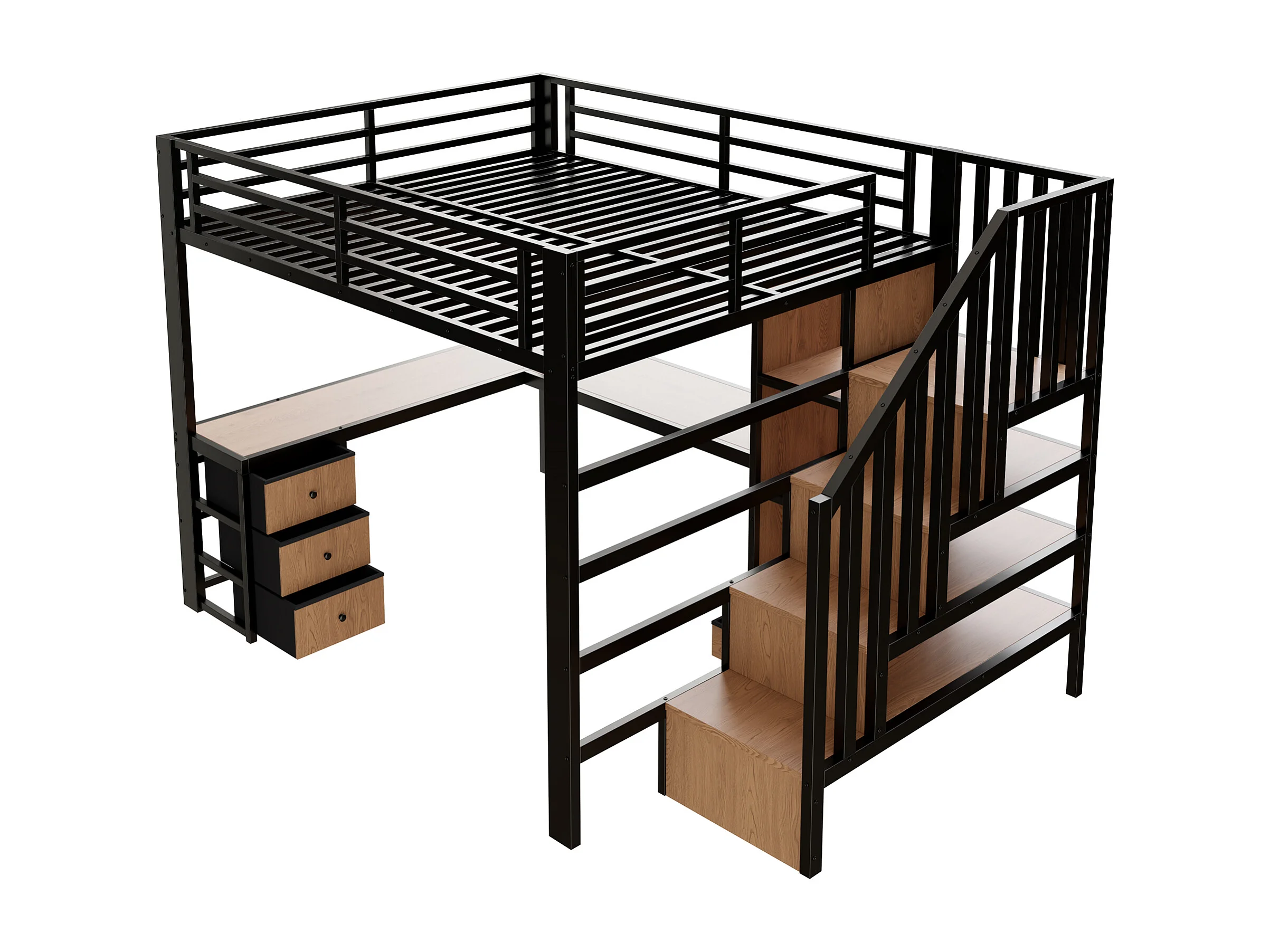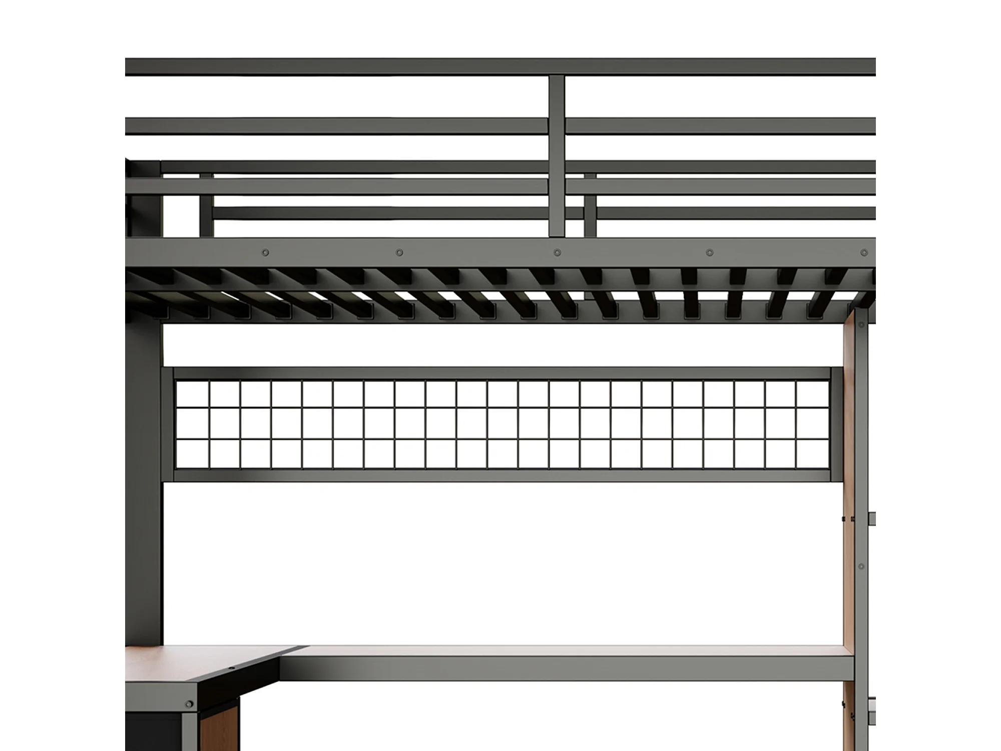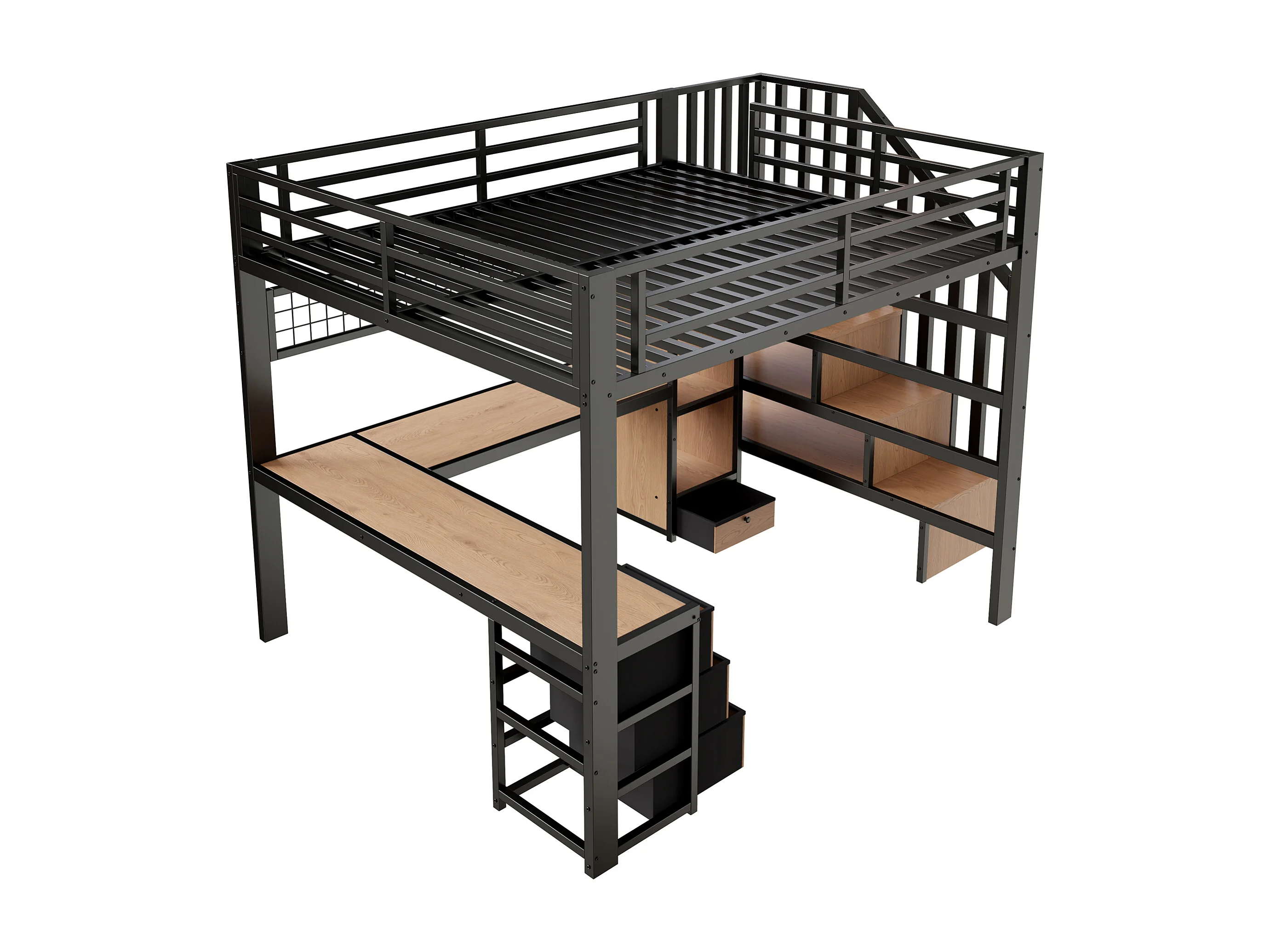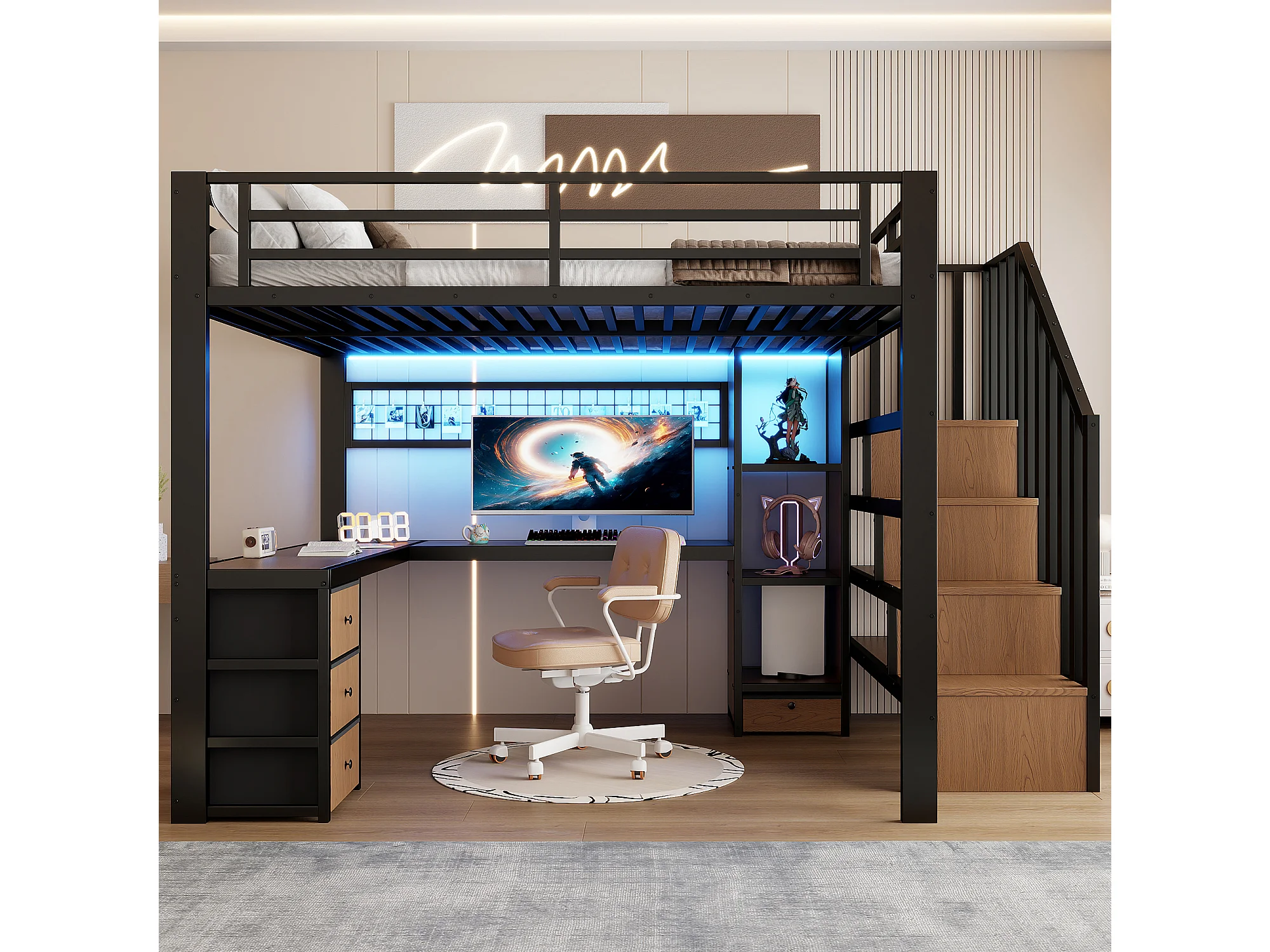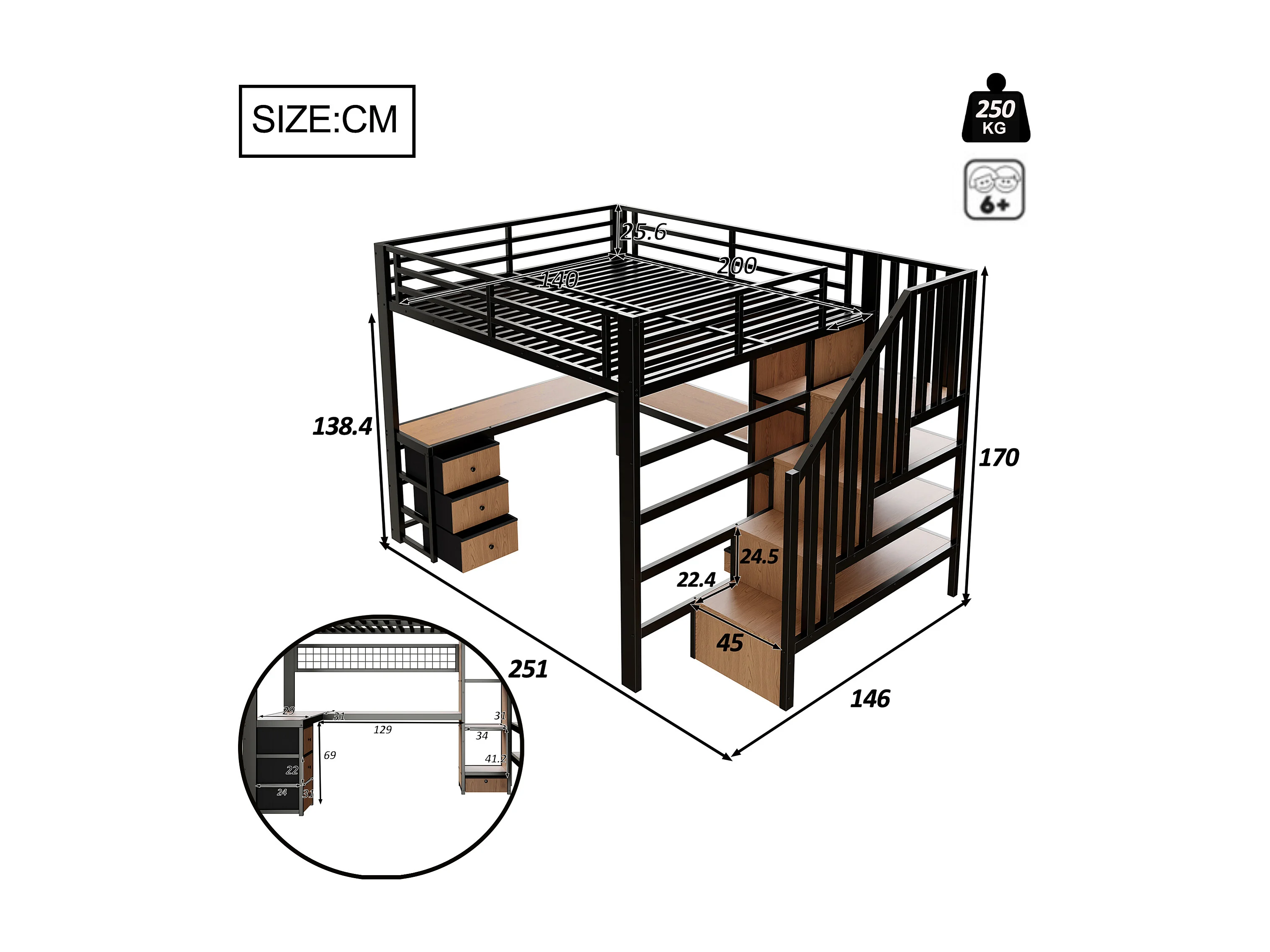 Lit mezzanine 140 x 200 cm avec 4 tiroirs , bureau et LED - Métal noir