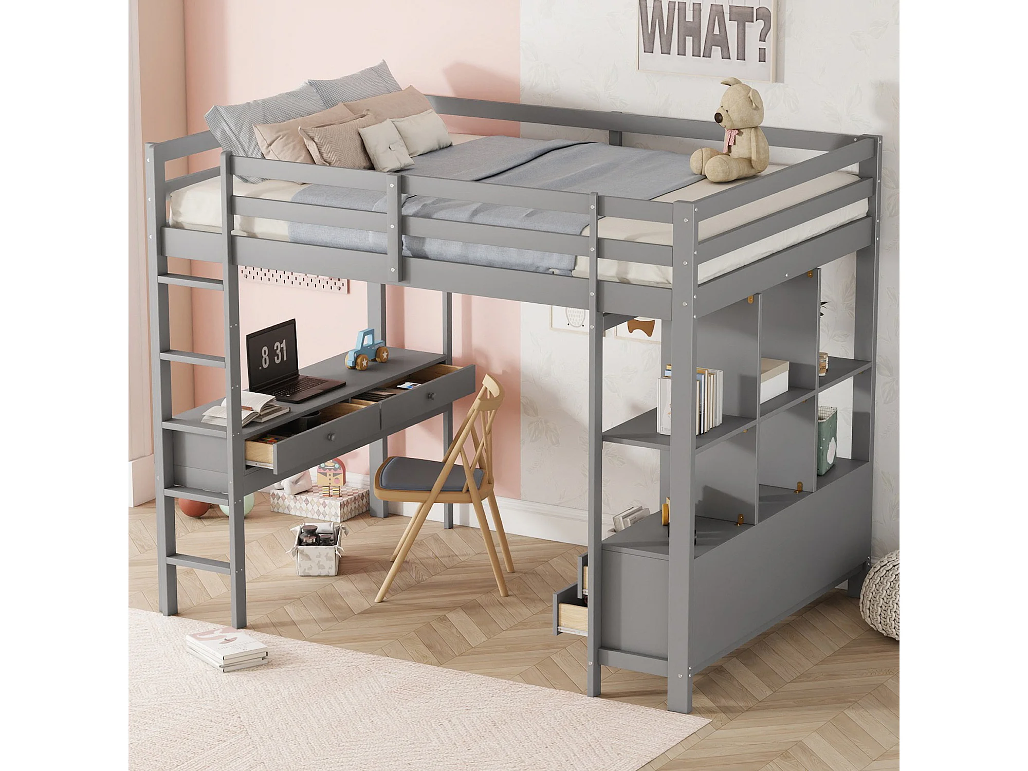 Lit mezzanine 140 x 200 cm - avec 6 tiroirs et étagères - en pin - gris - sans matelas