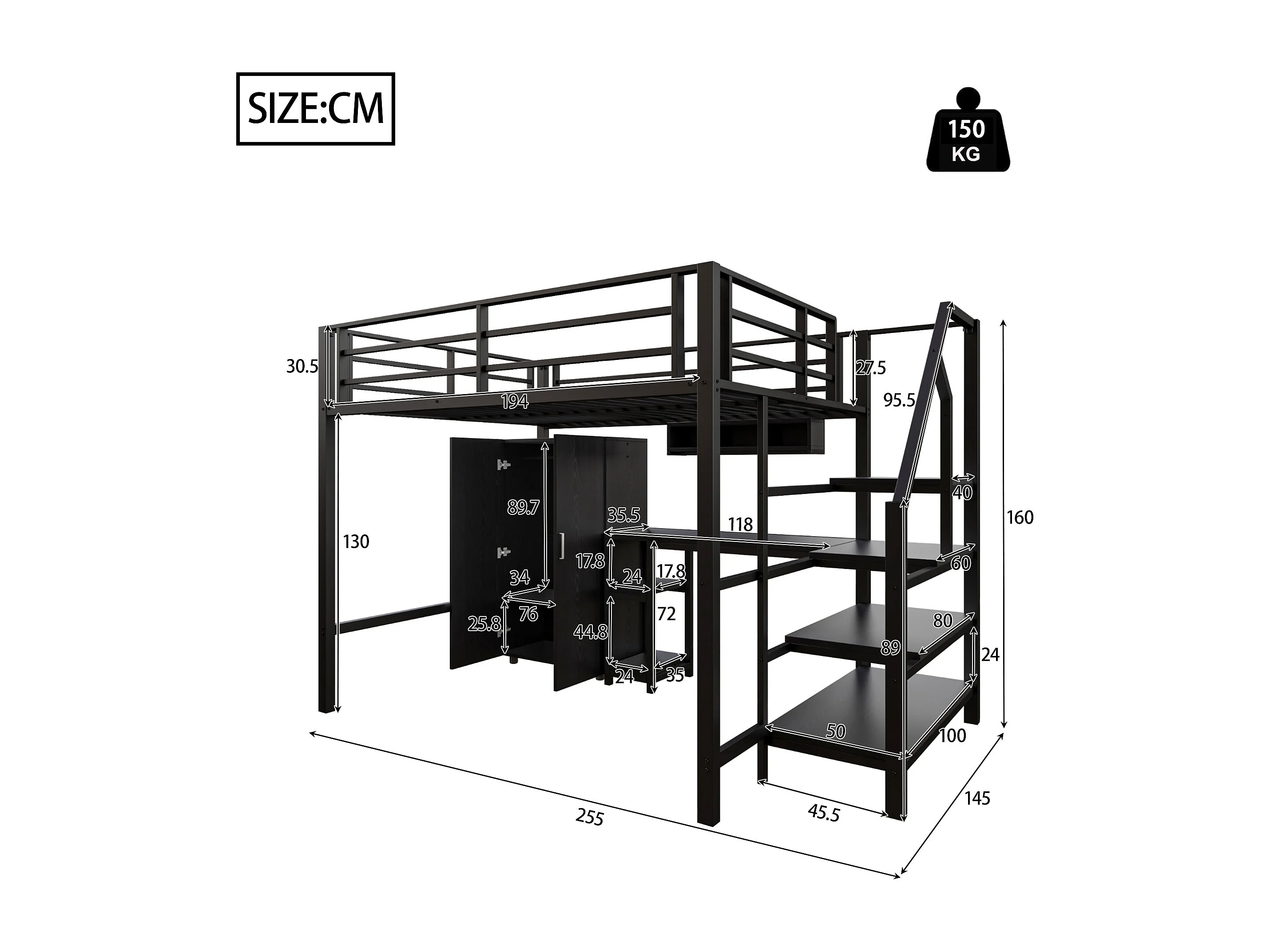Lit mezzanine, 140 x 200 cm, avec armoire, étagères, échelle de rangement et bureau, en métal noir, sans matelas