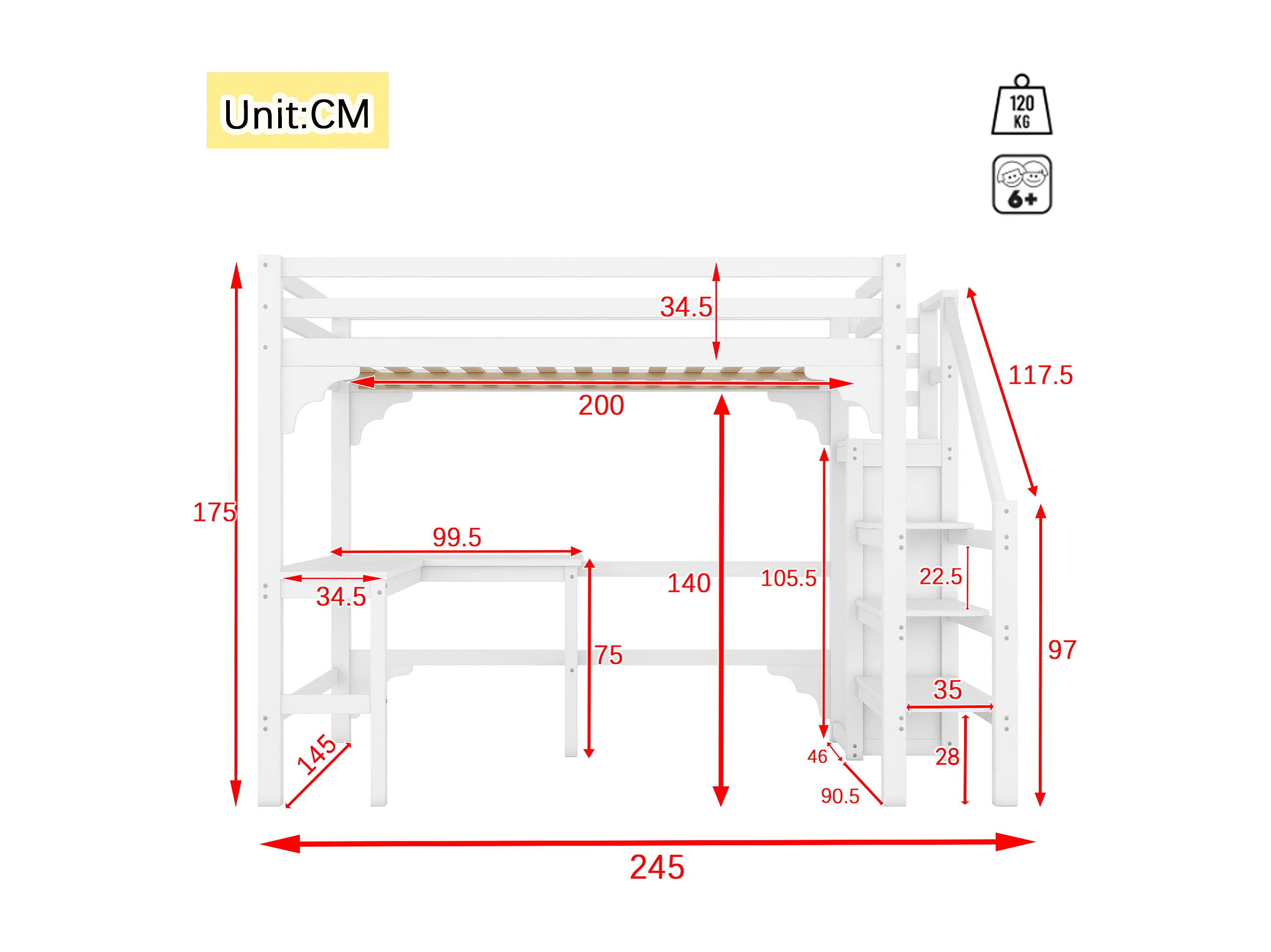 Lit mezzanine 140 x 200 cm avec bureau en L élégant et armoire ouverte, en pin blanc, sans matelas
