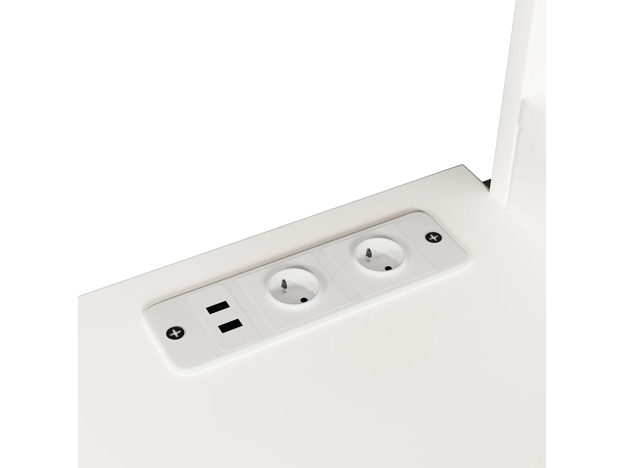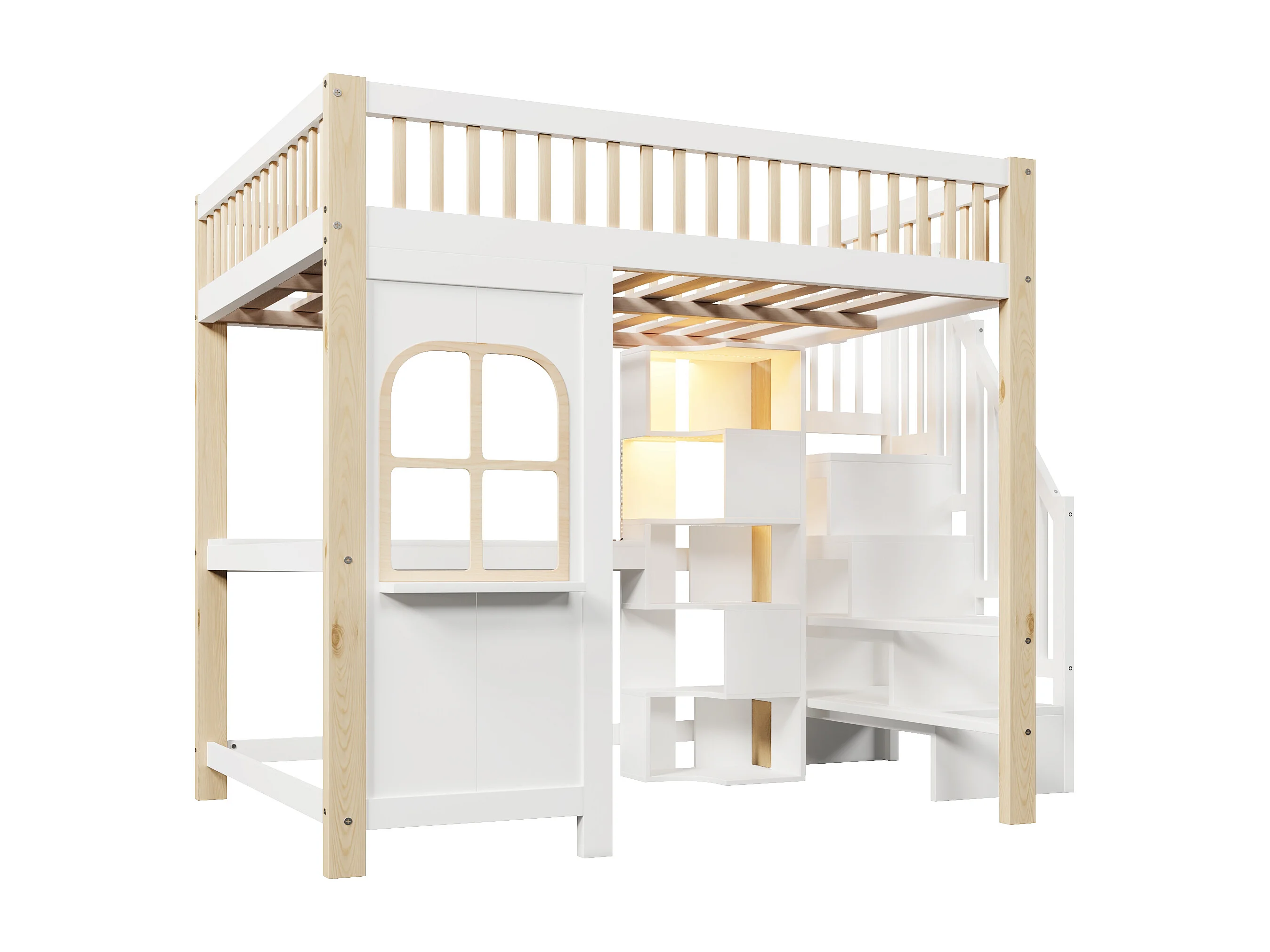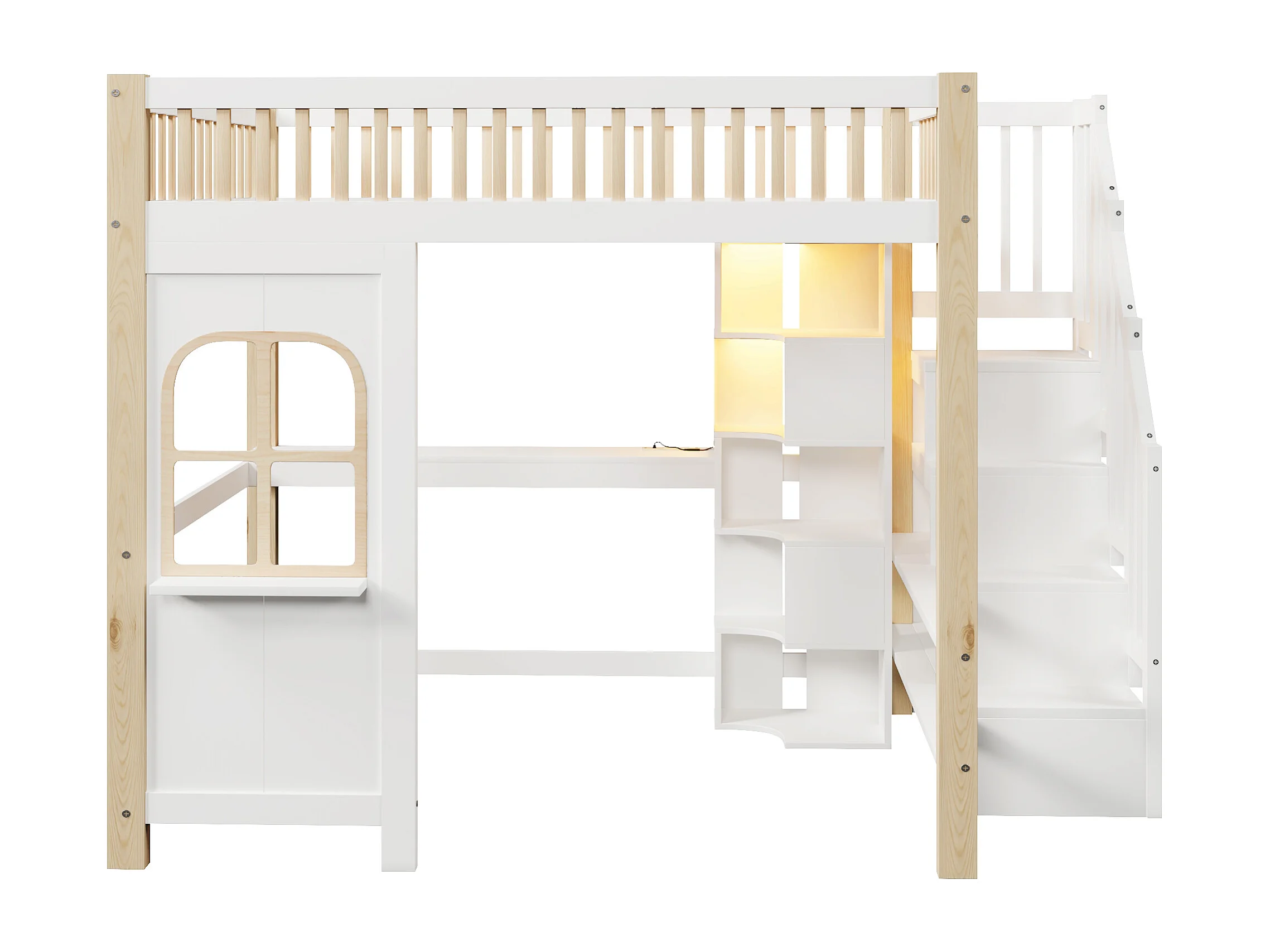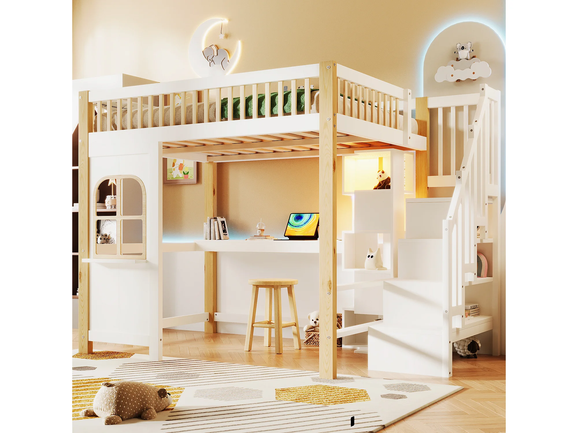 Lit mezzanine 140 x 200 cm avec LED, rangement ouvert, bureau et prise électrique - Couleur blanc et naturel