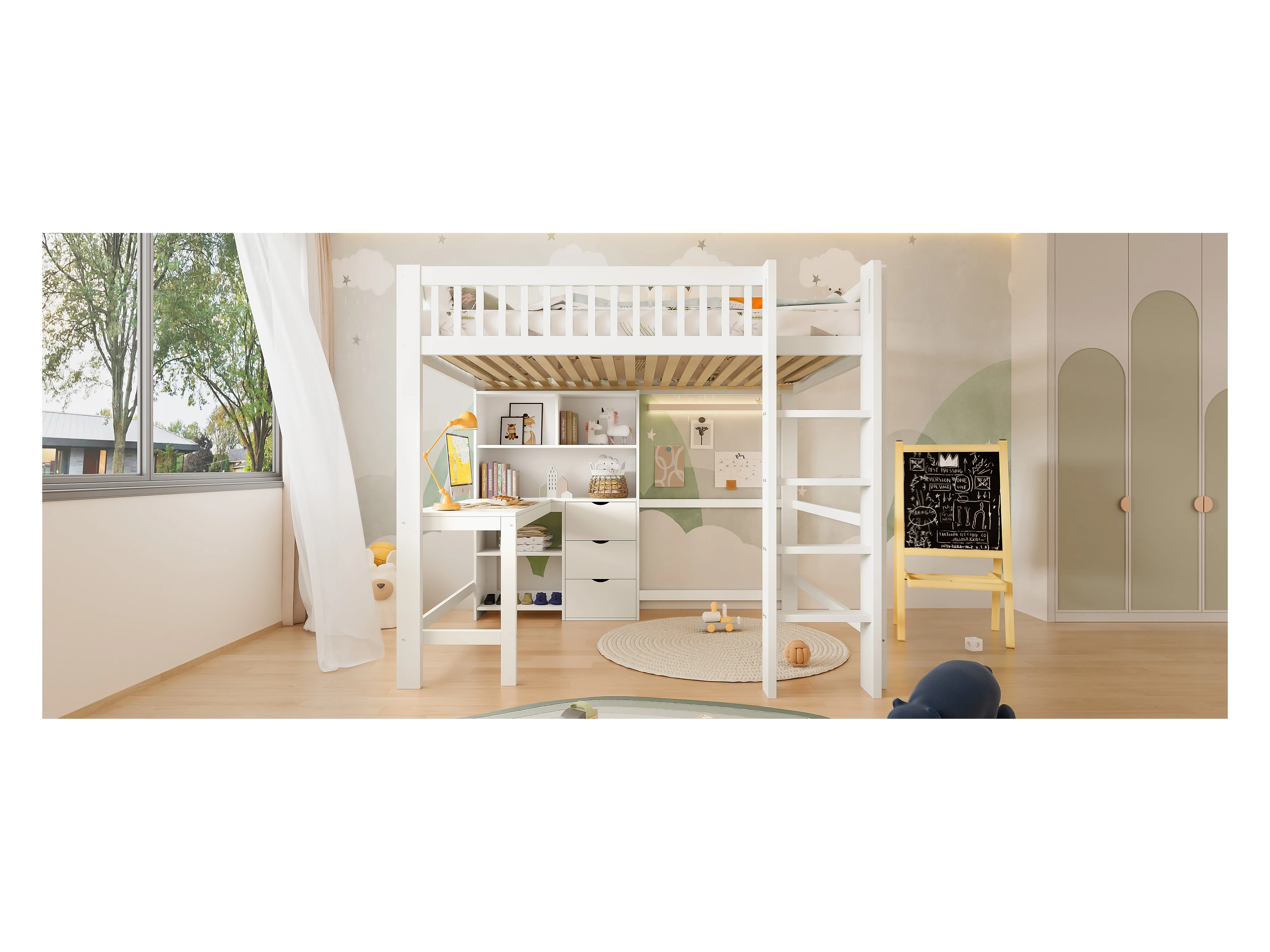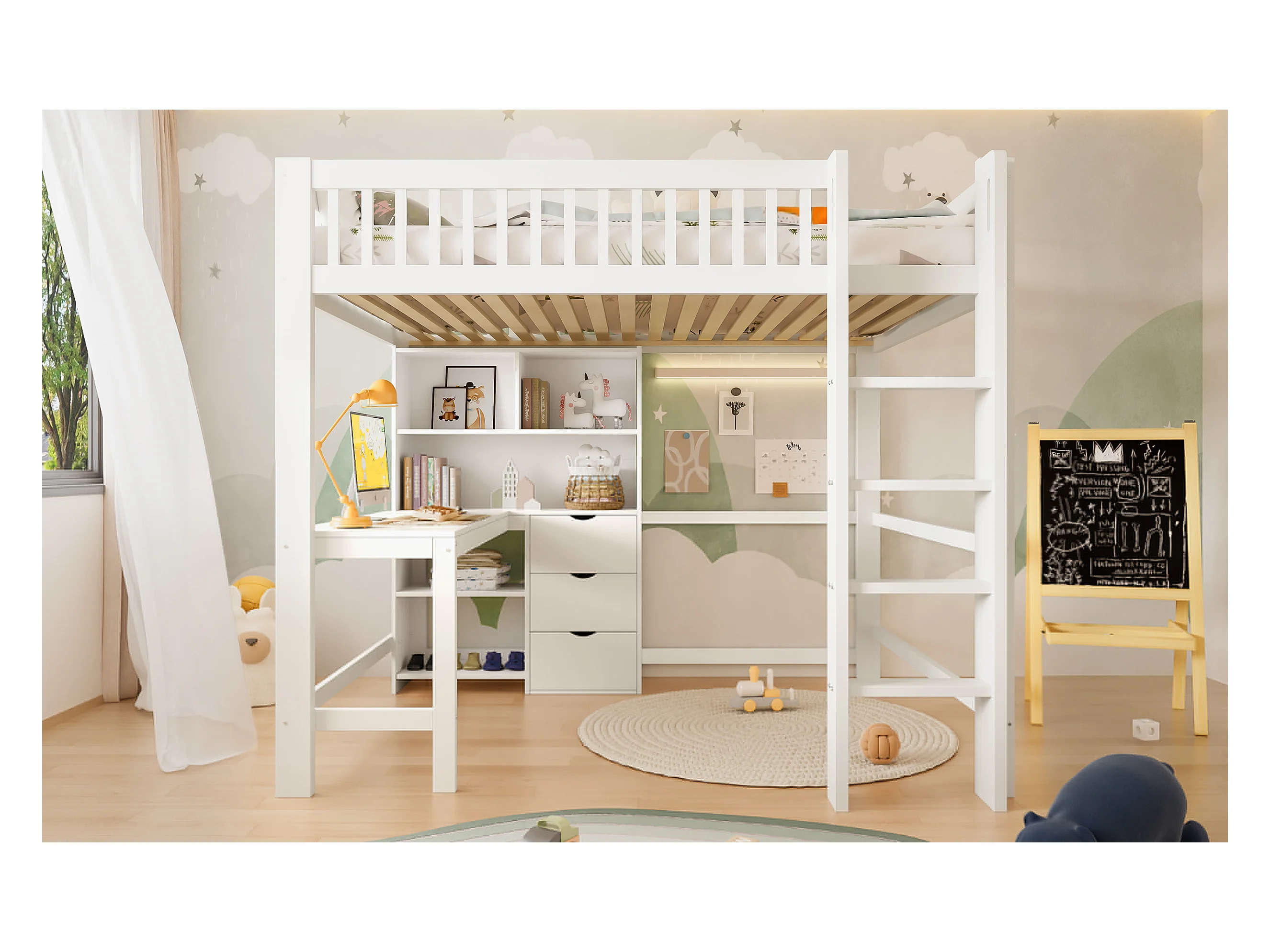 Lit Mezzanine 140 x 200 cm, avec Rangements, Échelle, Bureau, 3 Tiroirs, sans Matelas, Blanc