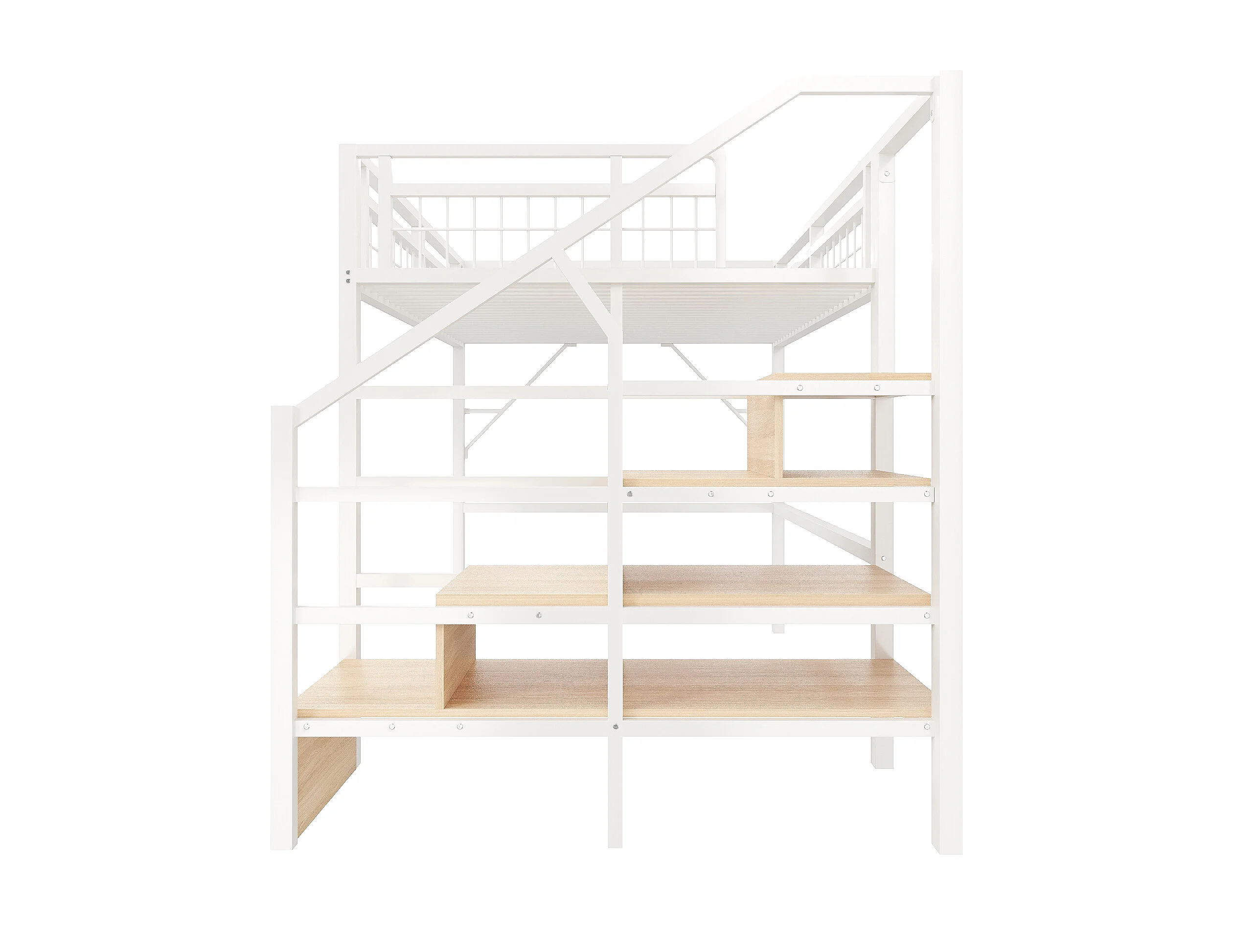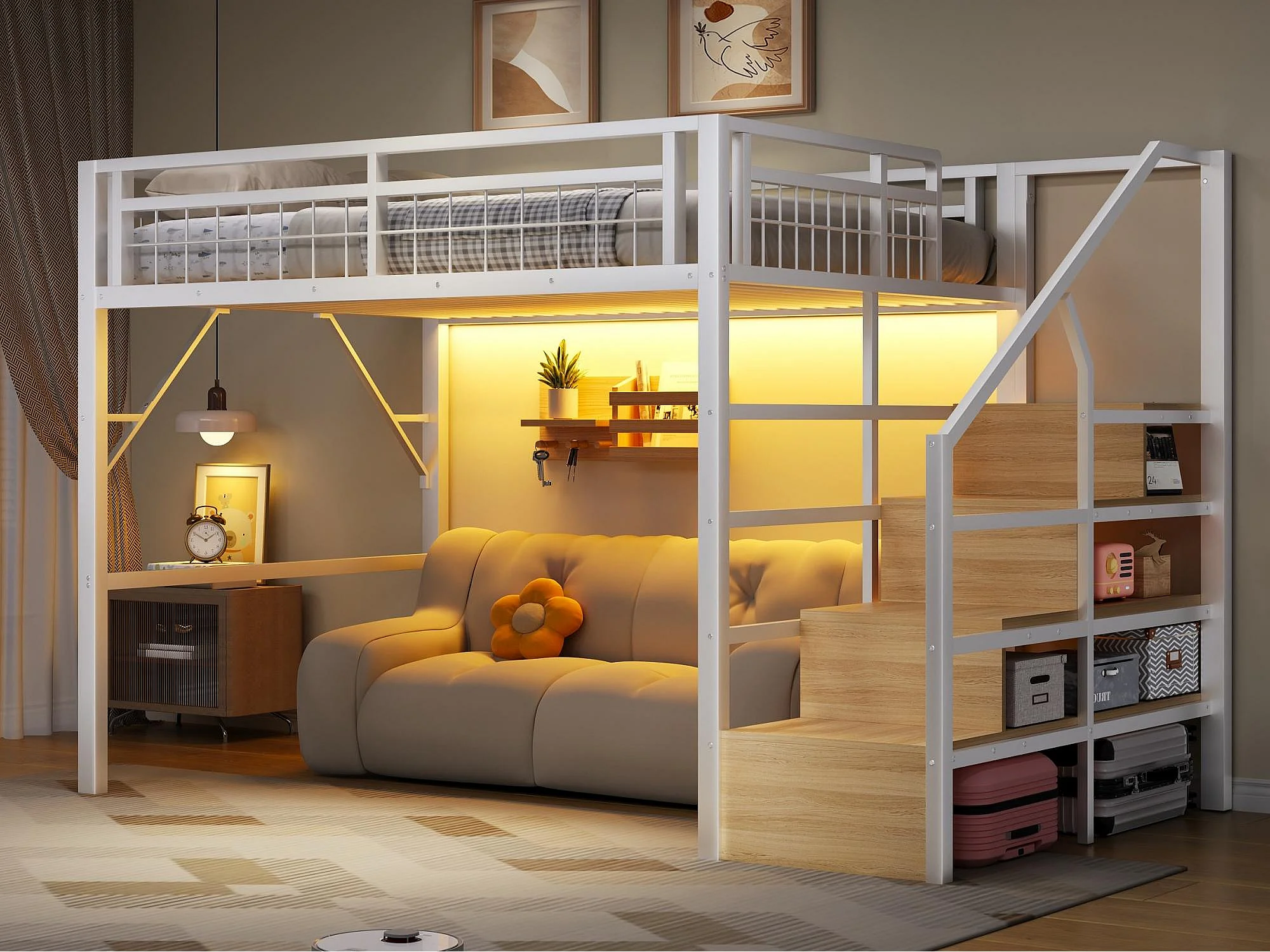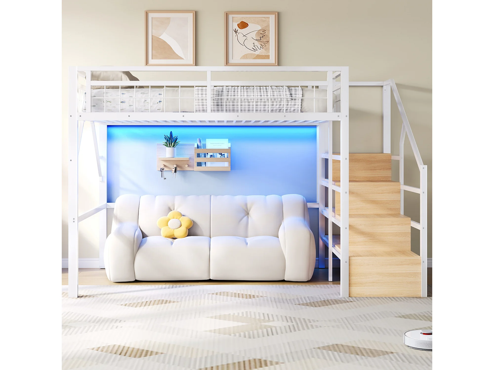 Lit mezzanine 140 x 200 cm - Structure en fer - Éclairage LED - Escalier - Blanc (matelas non inclus)