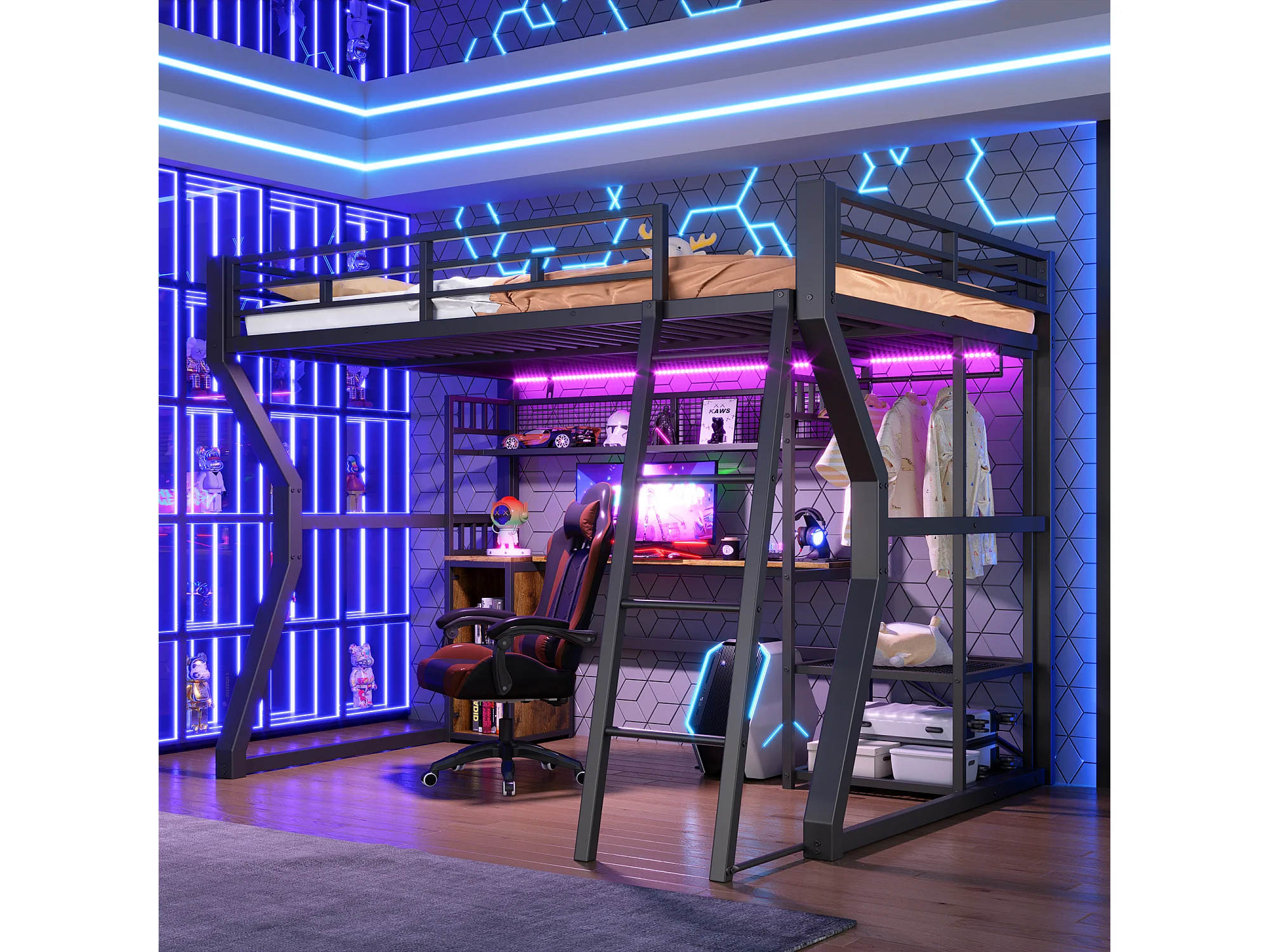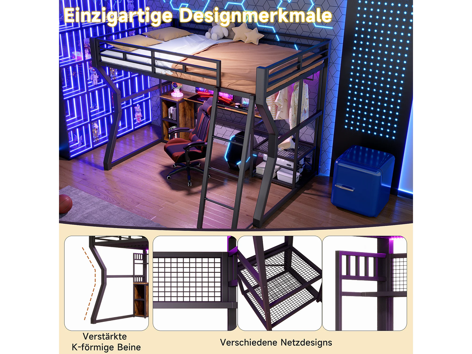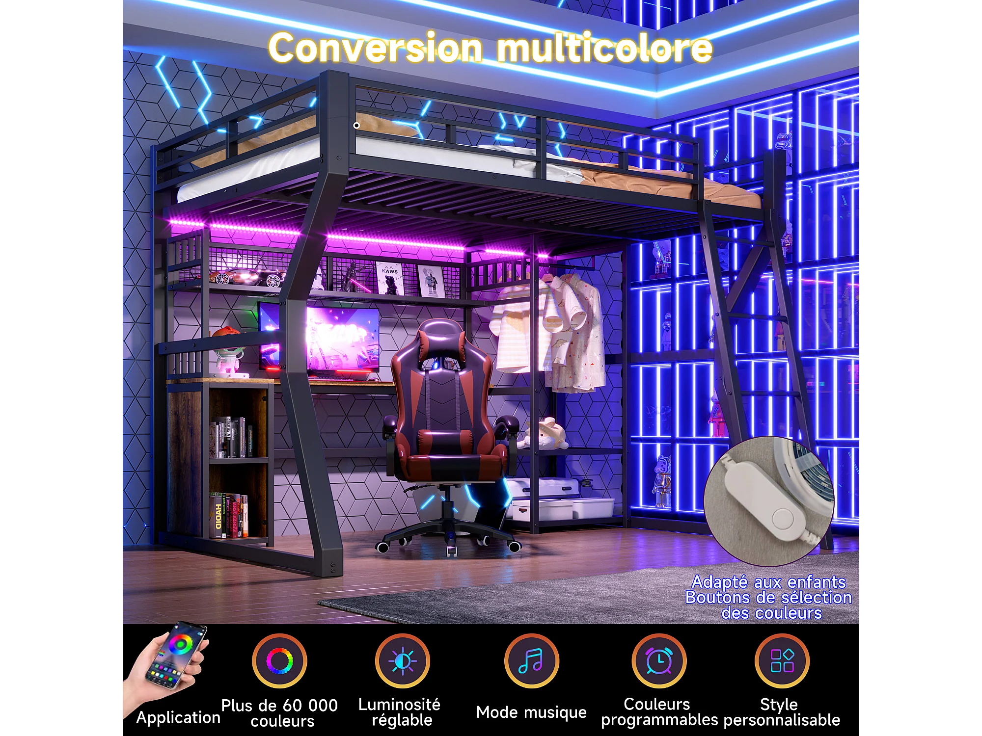 Lit mezzanine 140 x 200 cm - Structure en fer - Éclairage LED - Prise électrique + espace penderie - Bureau - noir (matelas non inclus)