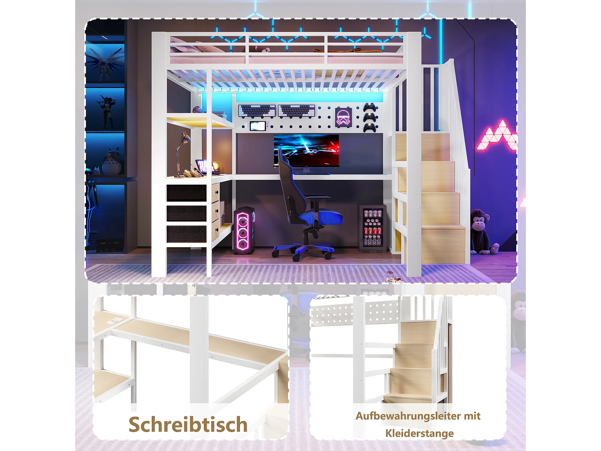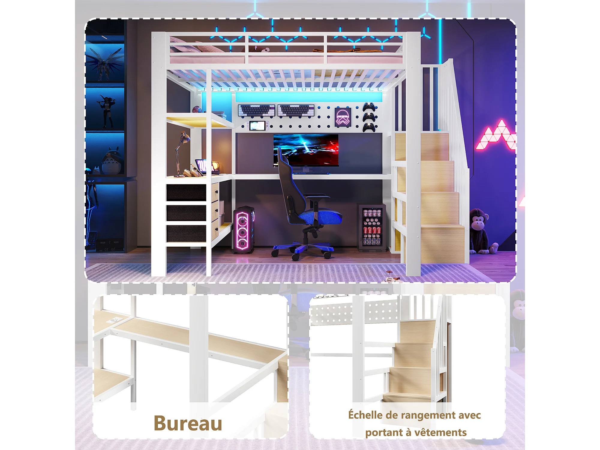 Lit mezzanine 140 x 200 cm - Structure en métal - 3 tiroirs - Table intégrée - Prise électrique - Éclairage LED - blanc (matelas non inclus)
