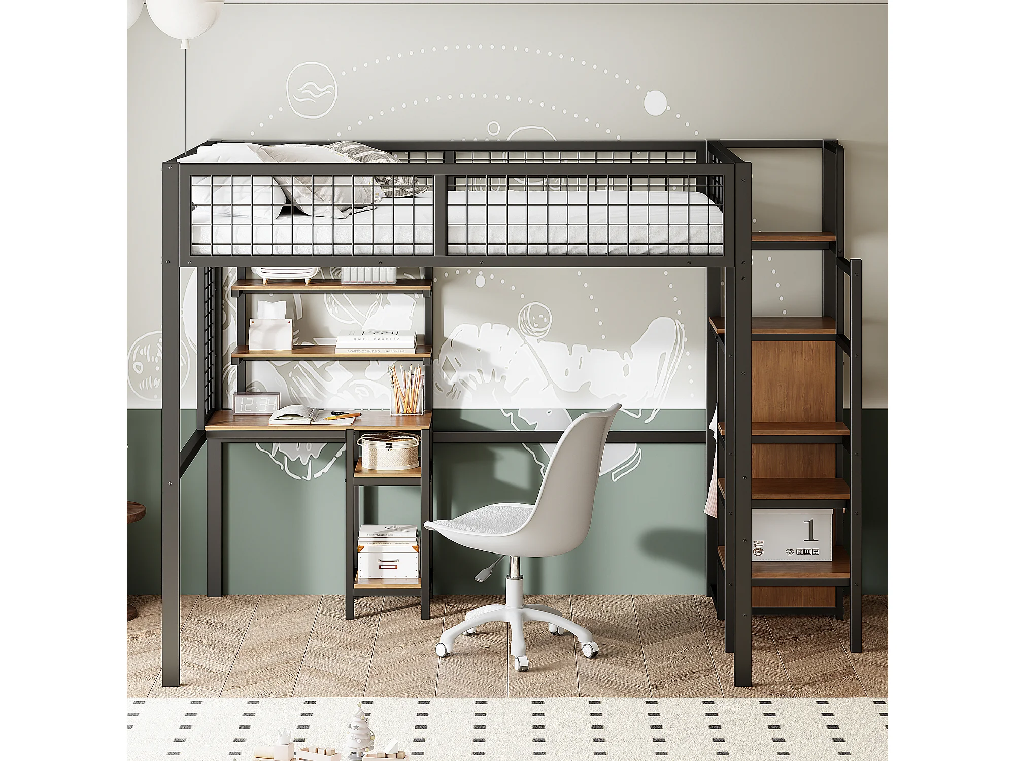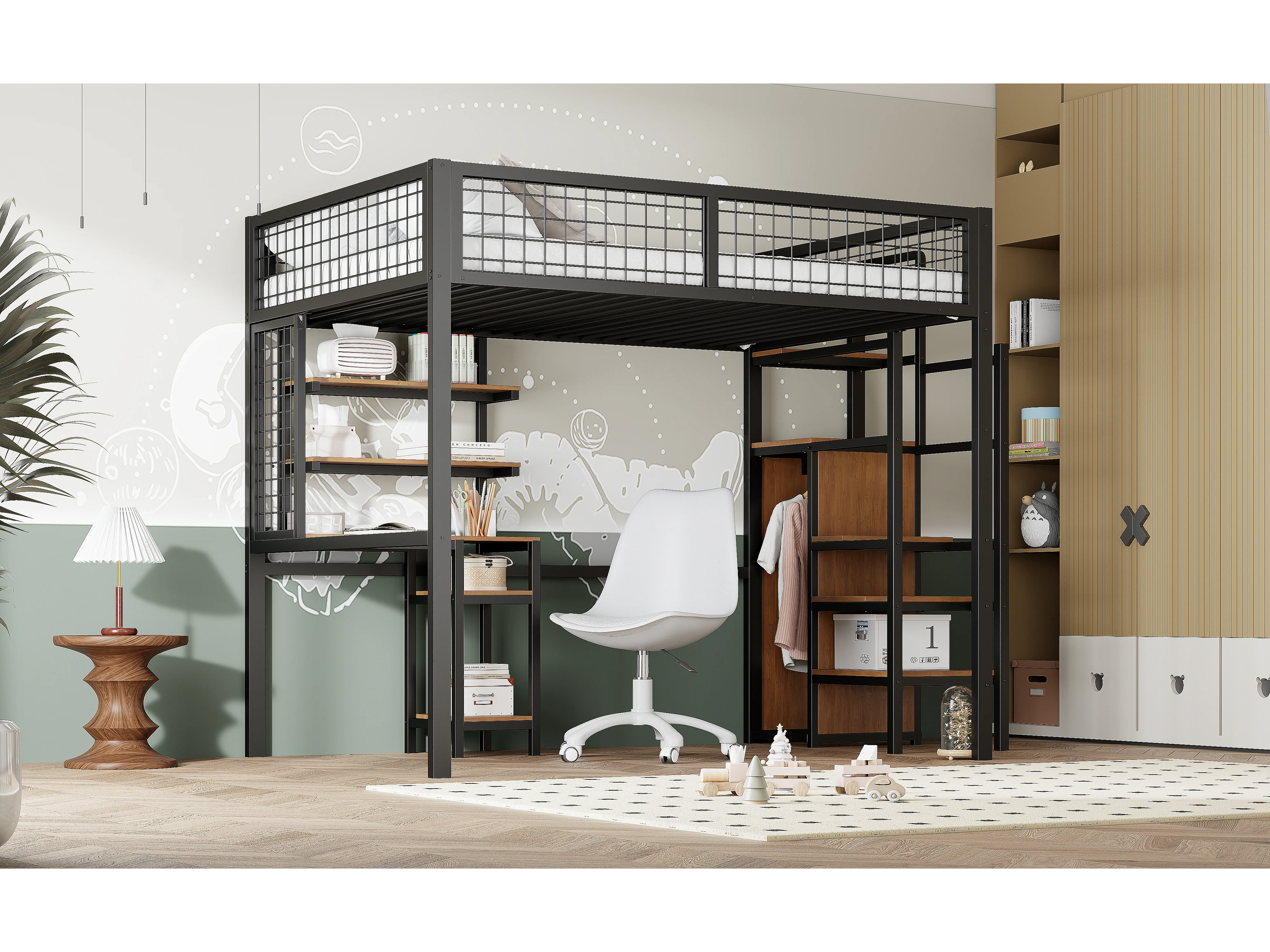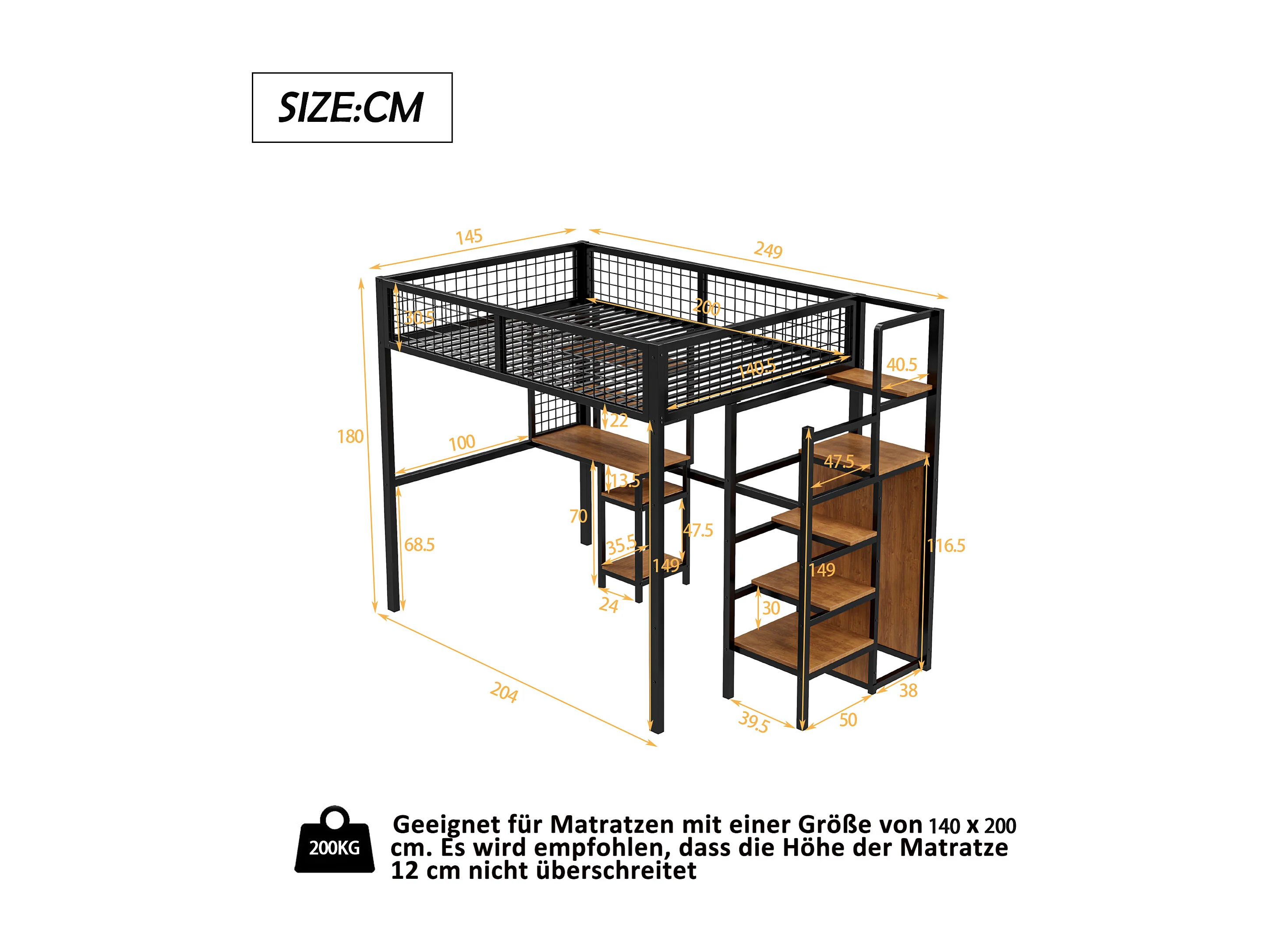Lit mezzanine 140 x200 avec échelle de sécurité, lit d'enfant avec cadre en fer Armoire et table d'ordinateur Noir