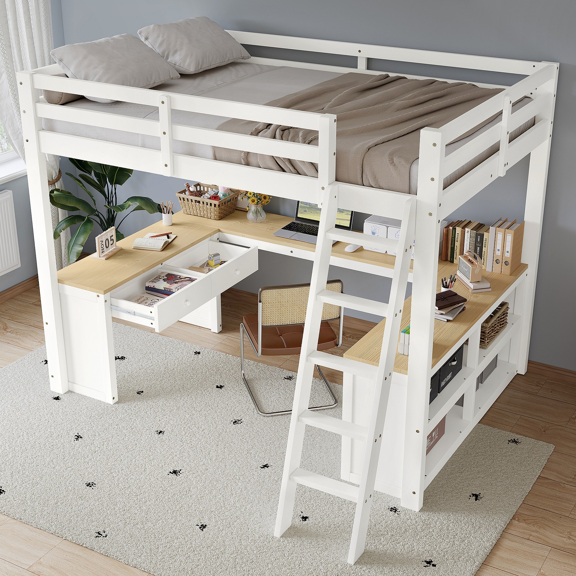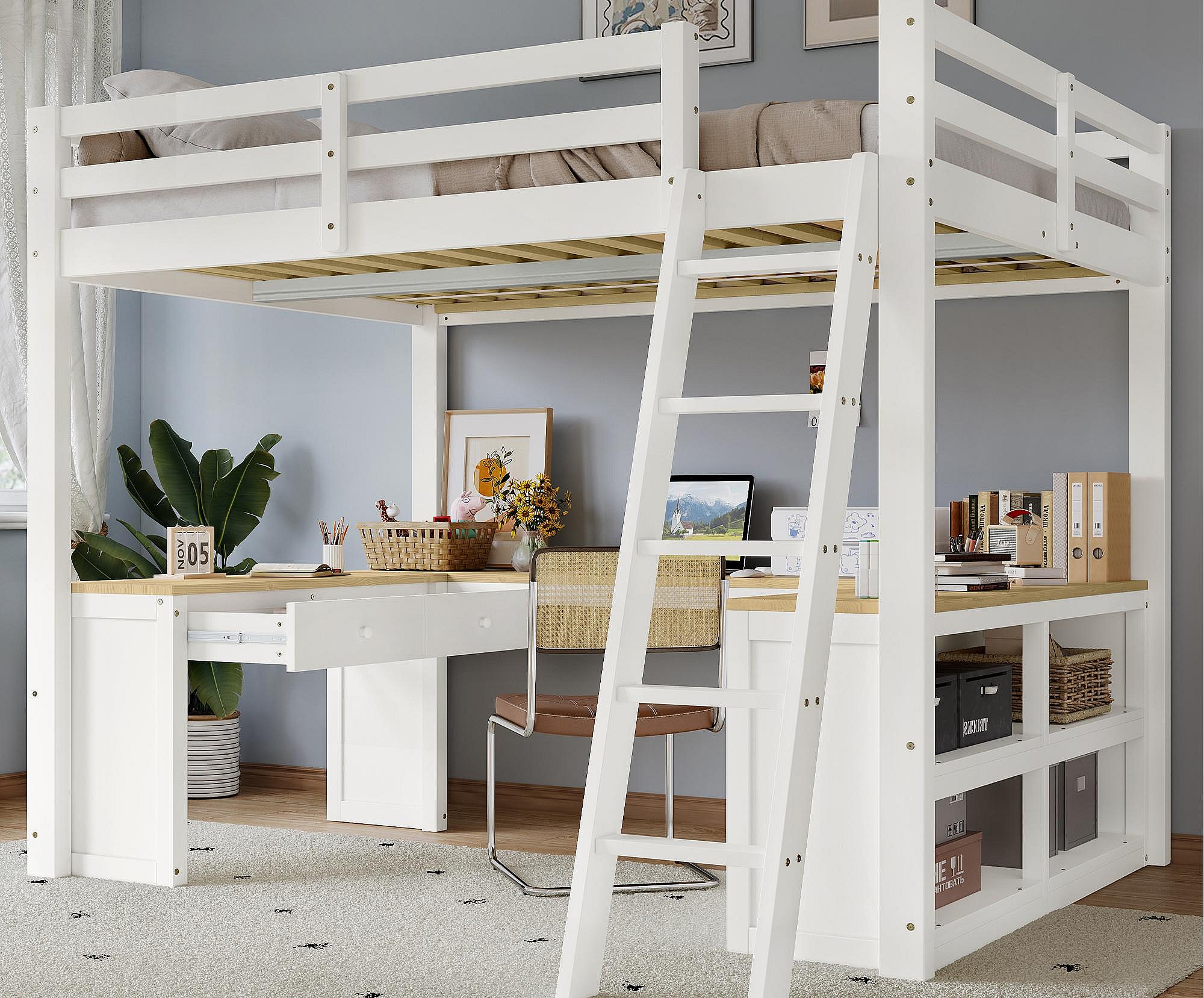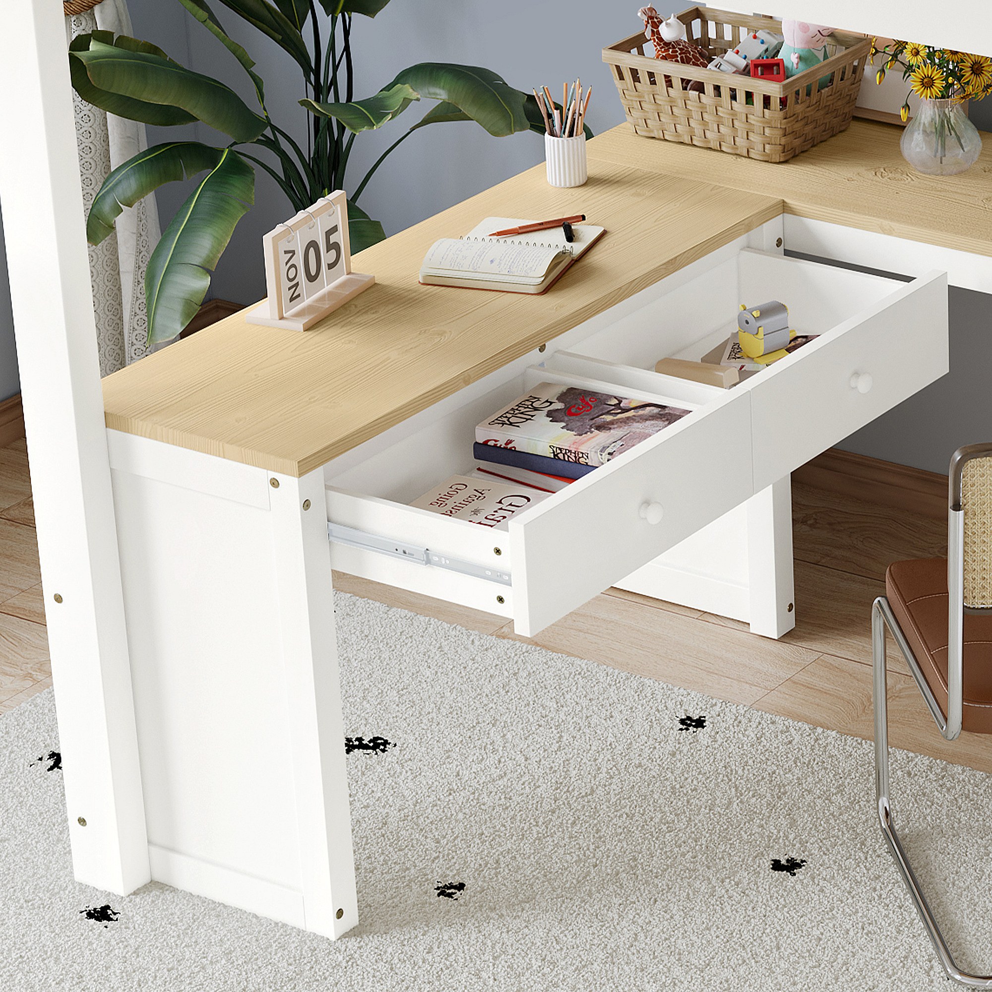 Lit mezzanine 140x200 cm - avec 2 tiroirs et étagère de rangement - avec bureau en U - bois massif + MDF - Blanc + Naturel (sans matelas)