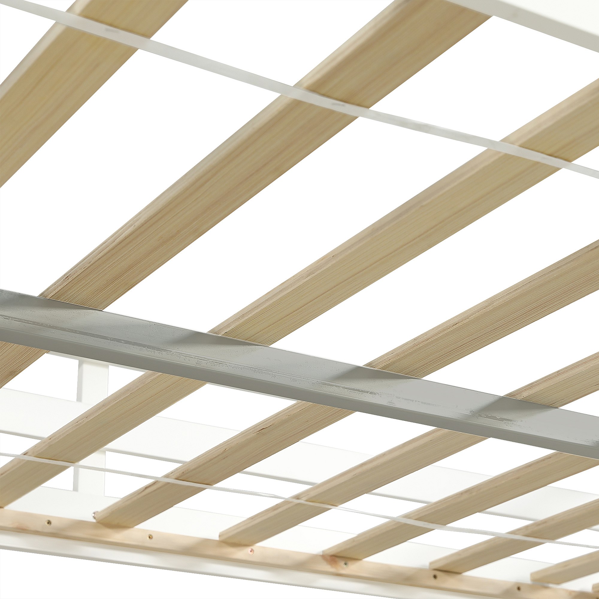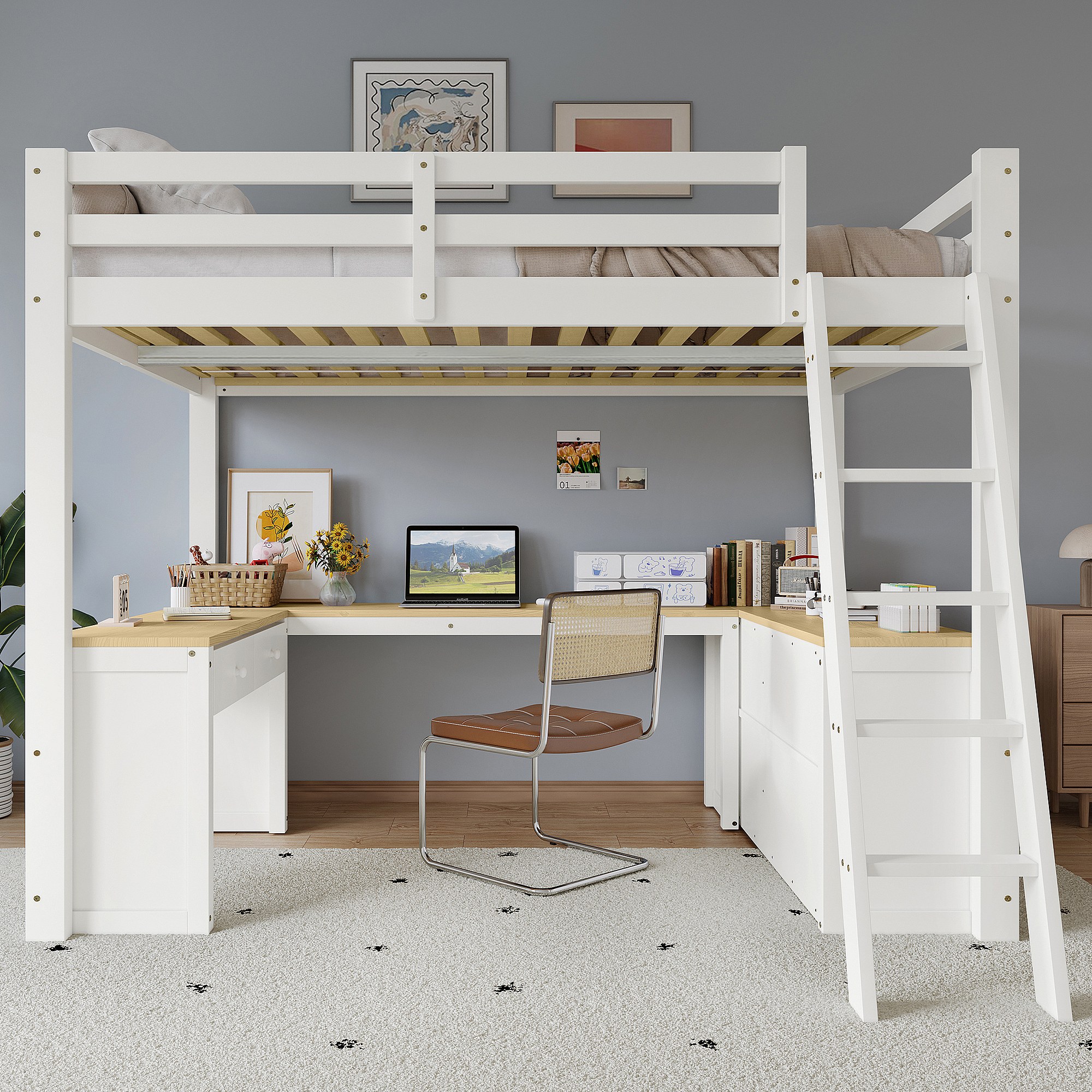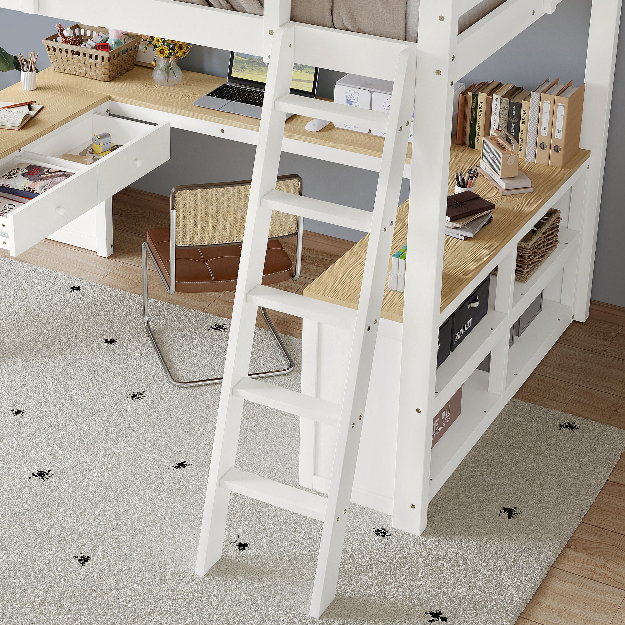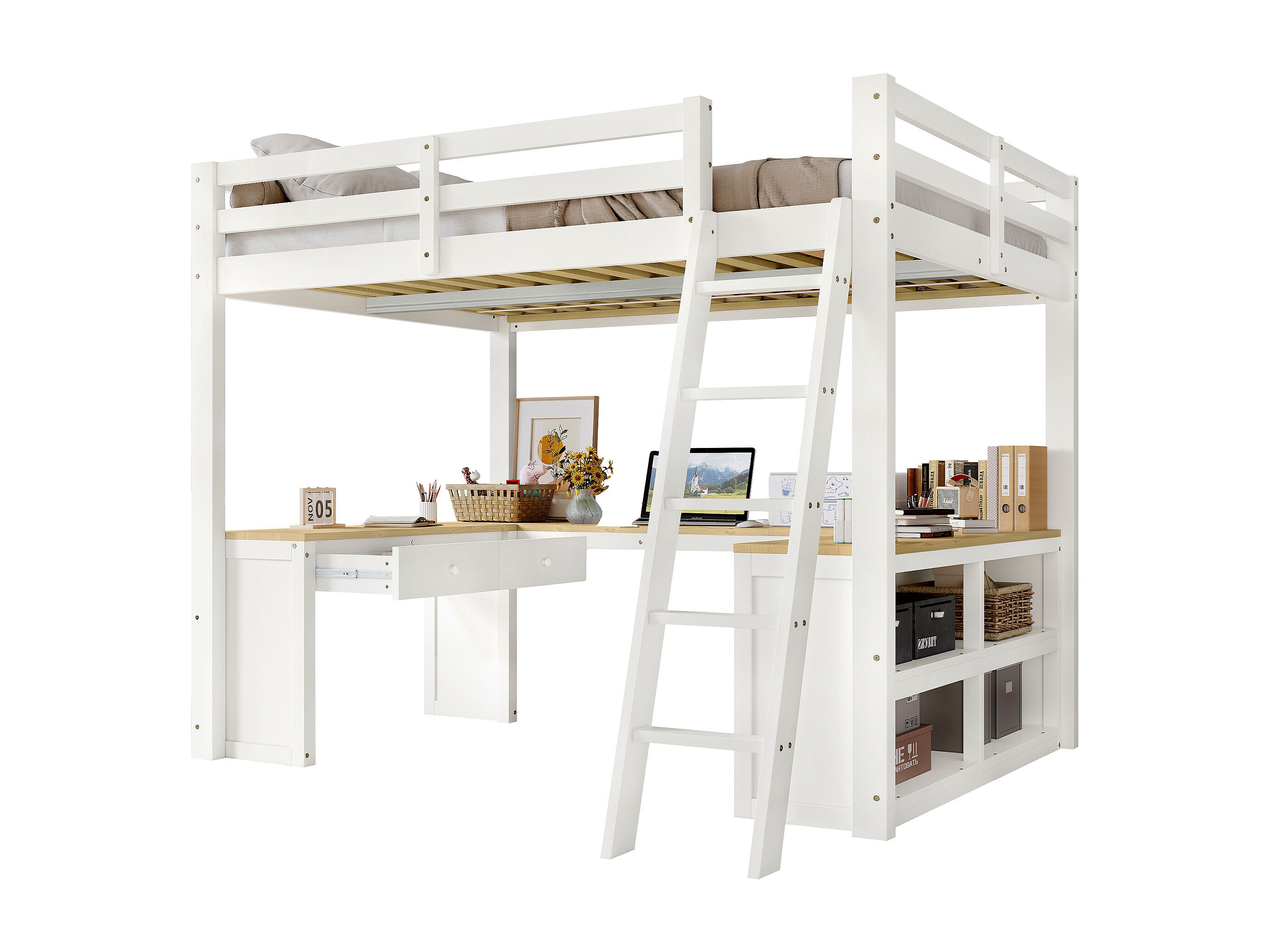 Lit mezzanine 140x200 cm - avec 2 tiroirs et étagère de rangement - avec bureau en U - bois massif + MDF - Blanc + Naturel (sans matelas)