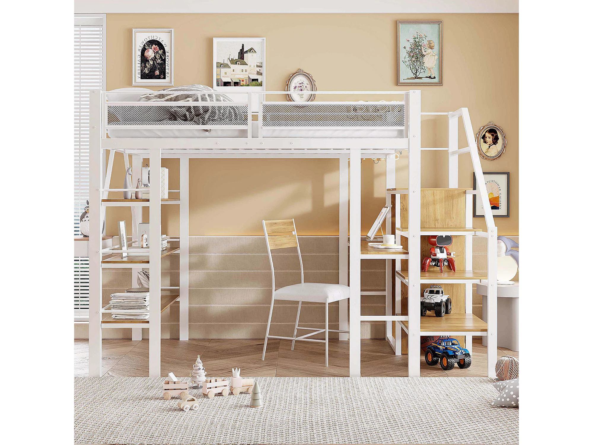 Lit mezzanine 140x200 cm avec bureau, LED et prise USB - Métal blanc