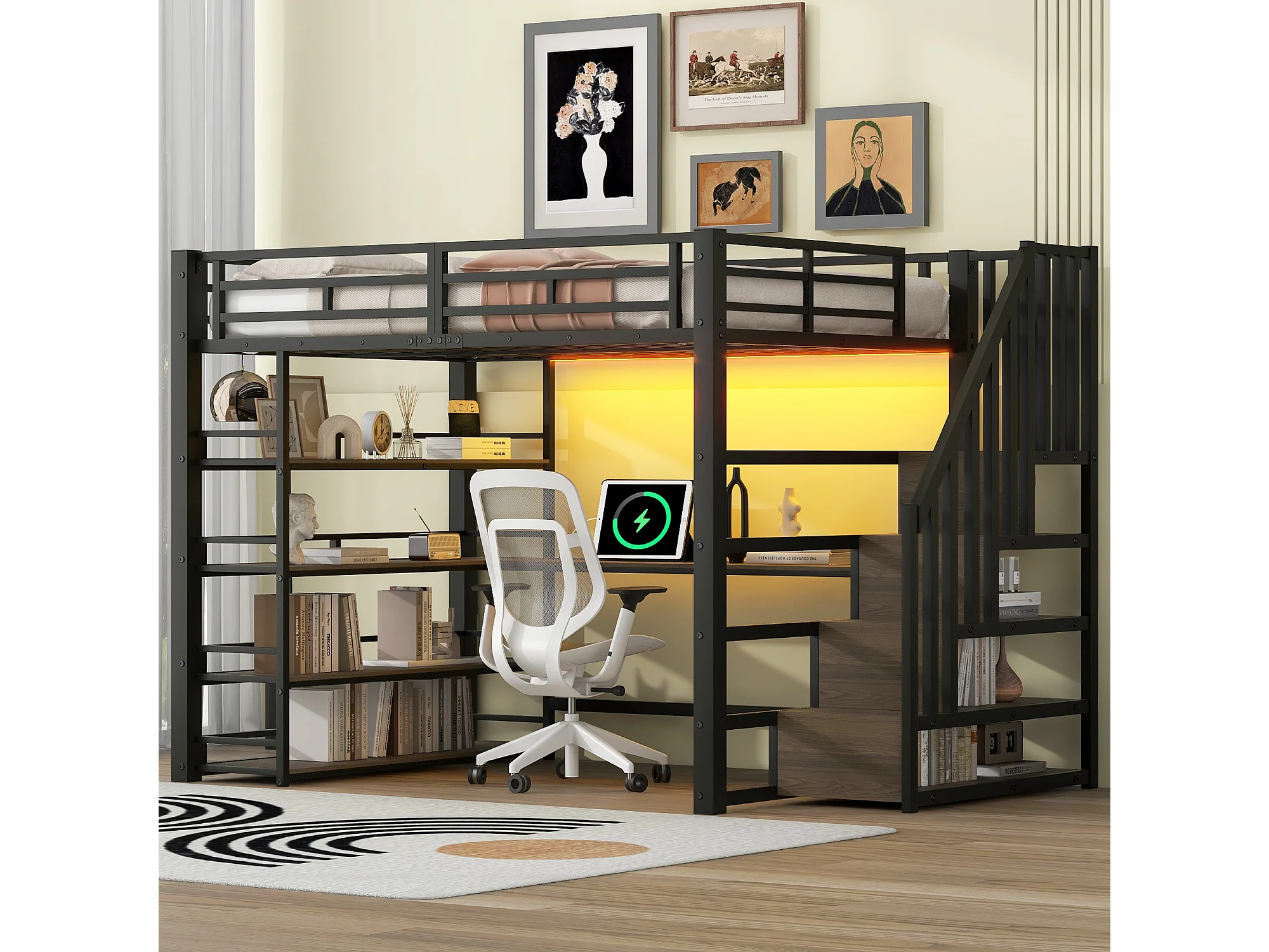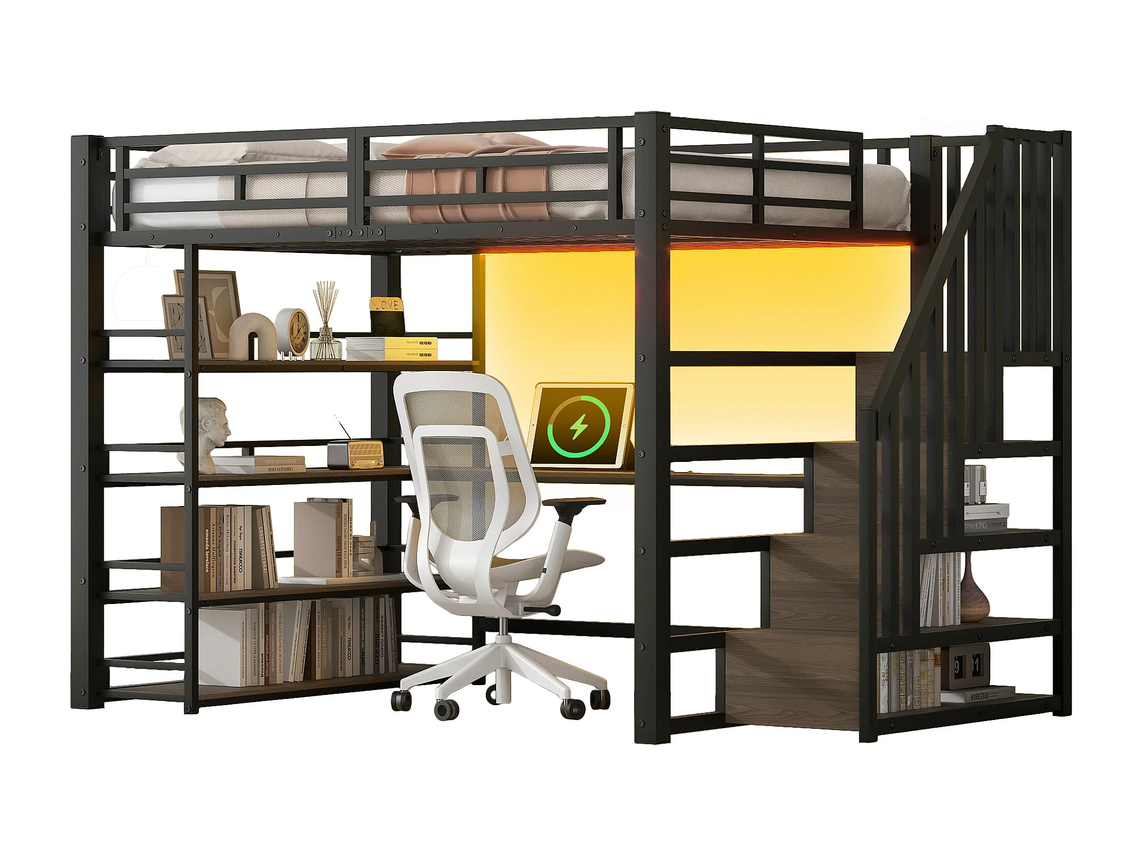 Lit mezzanine 140x200 cm avec bureau, port USB et rangements - Métal noir