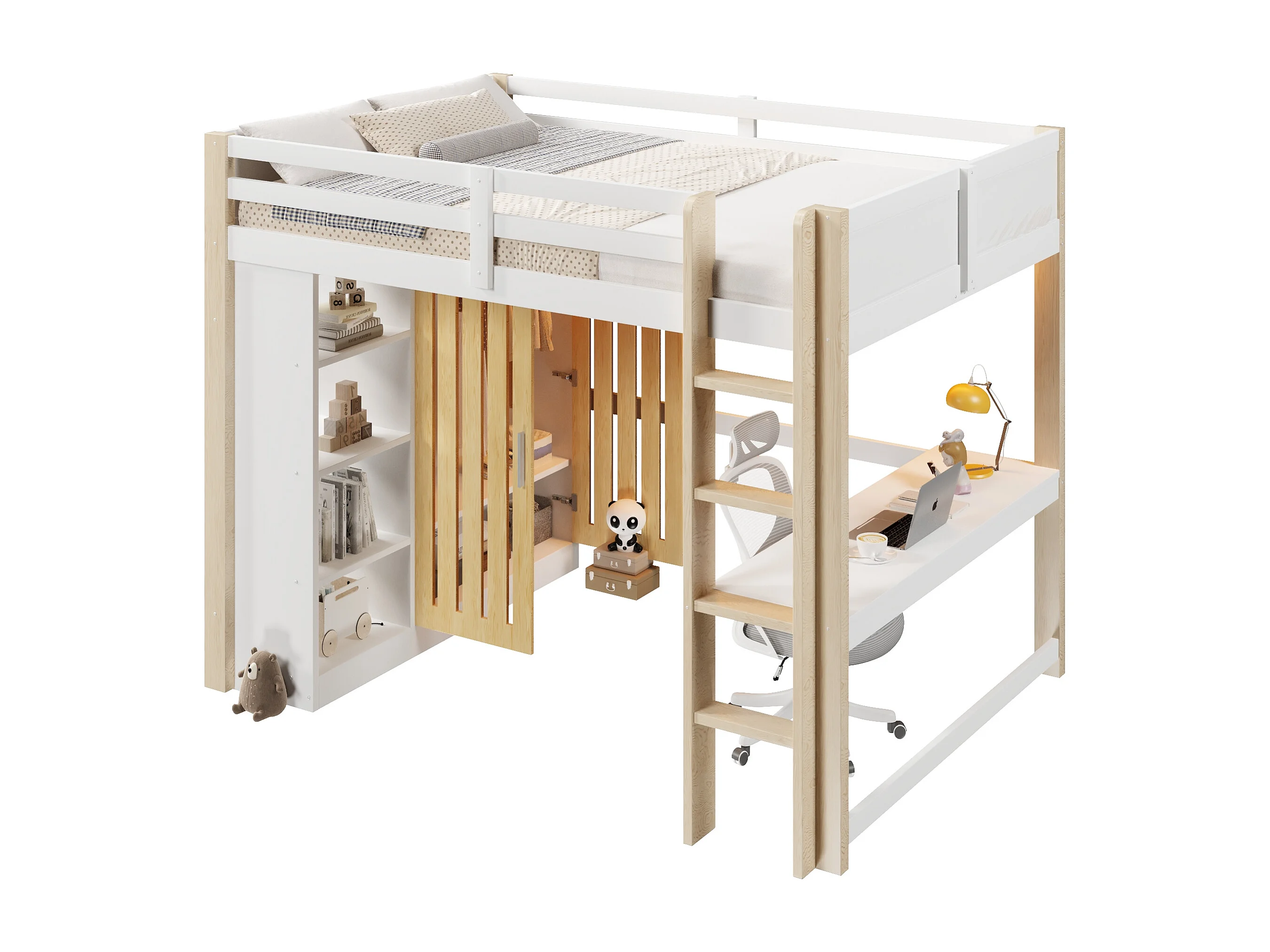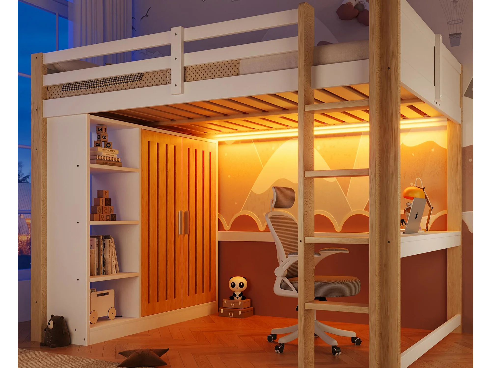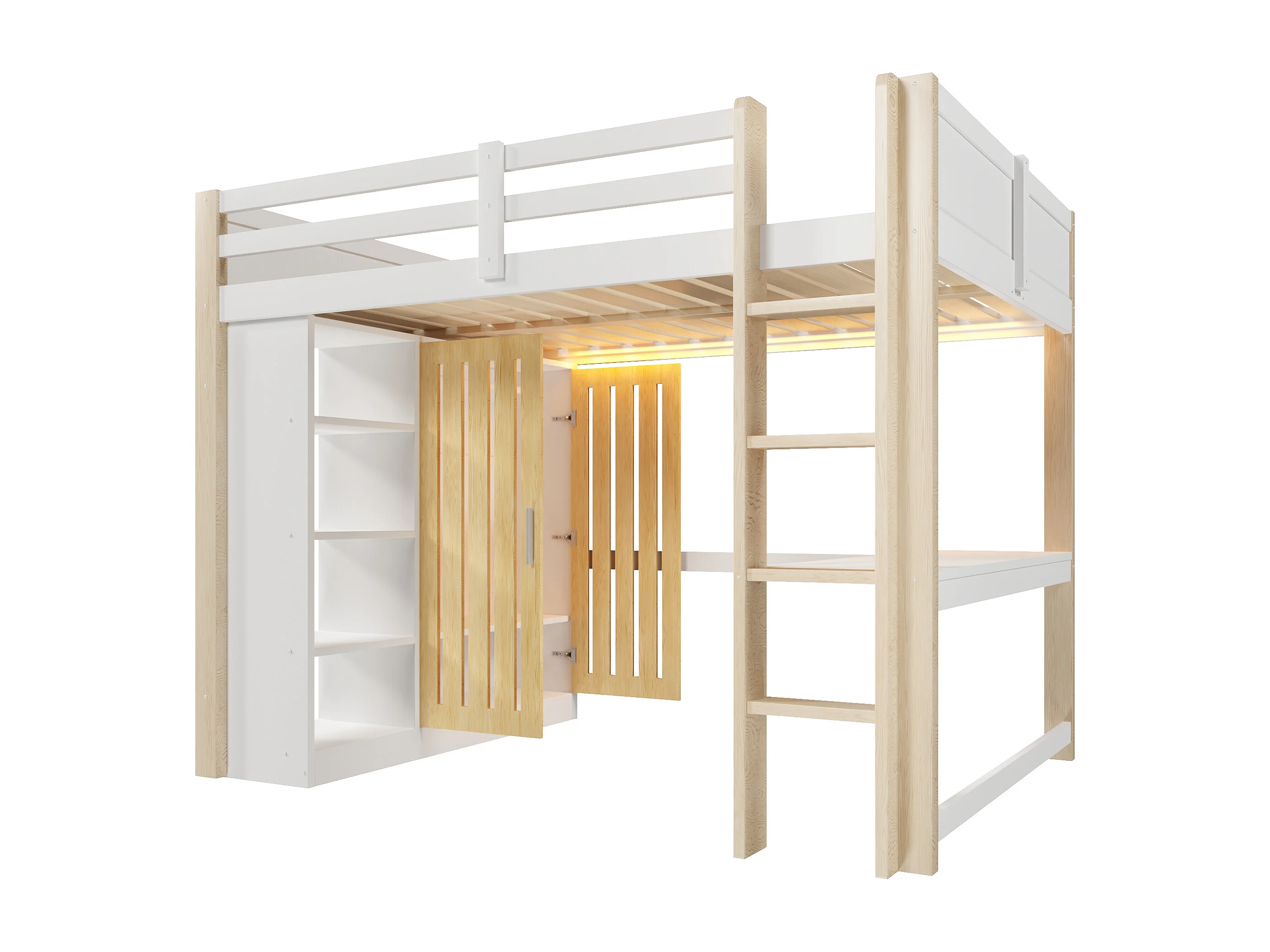 Lit mezzanine 140x200 cm - avec éclairage LED - avec armoire - avec étagères et bureau - blanc + couleur naturelle (matelas non inclus)