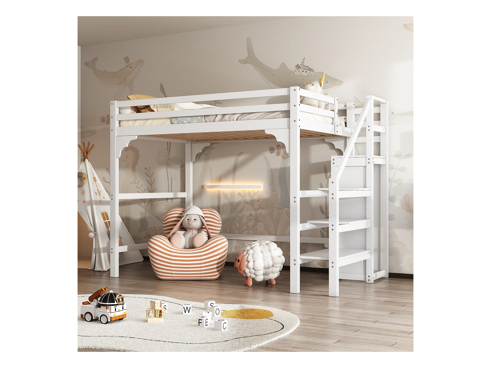 Lit mezzanine 140x200 cm avec sommier, escalier à marches, armoire intégrée, espace rangement, pour adolescents, Blanc