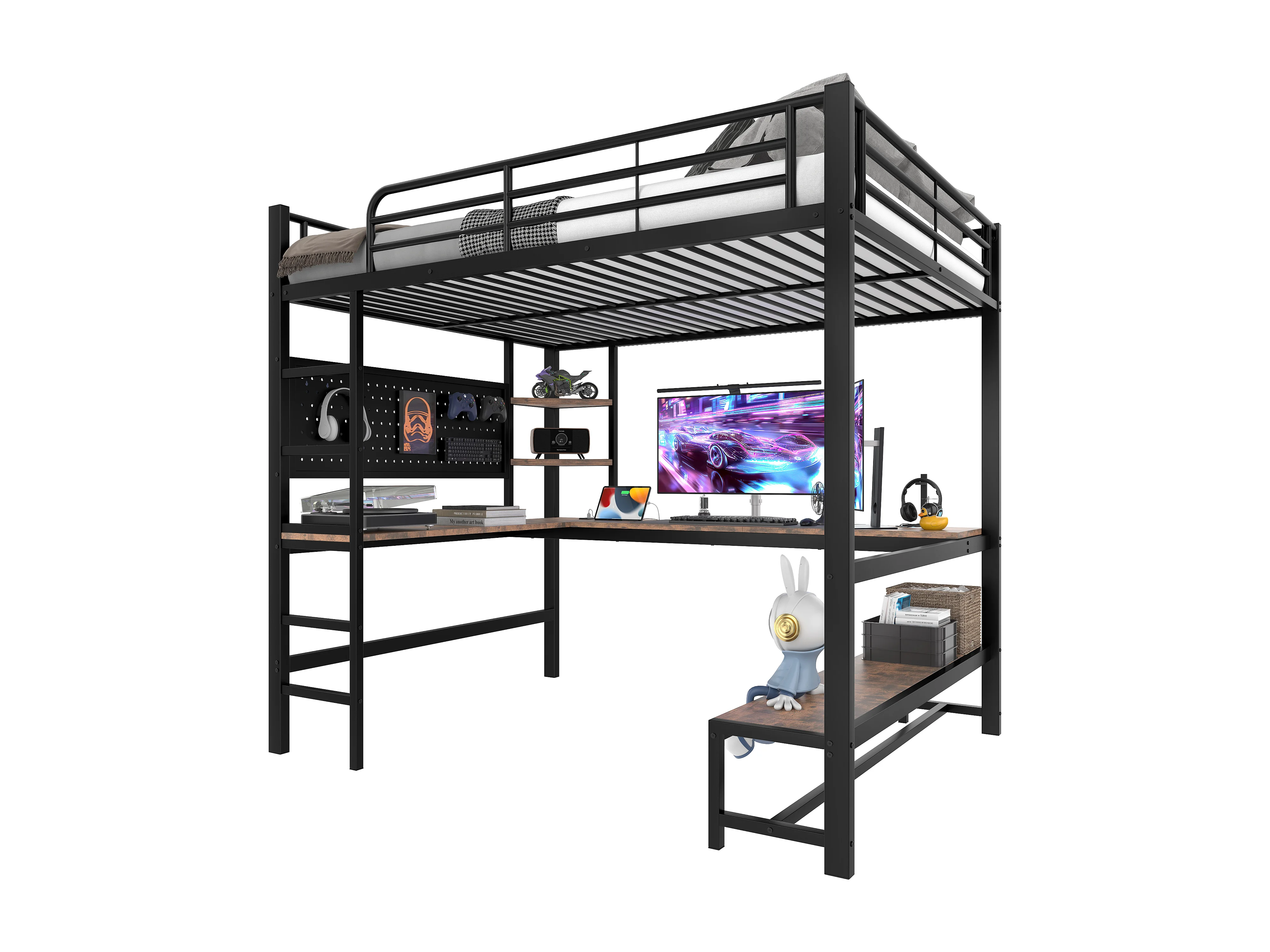 Lit mezzanine 140x200 cm, cadre en métal avec bureau, échelle, étagères, prise USB + Type-C, LED, sans matelas, Noir