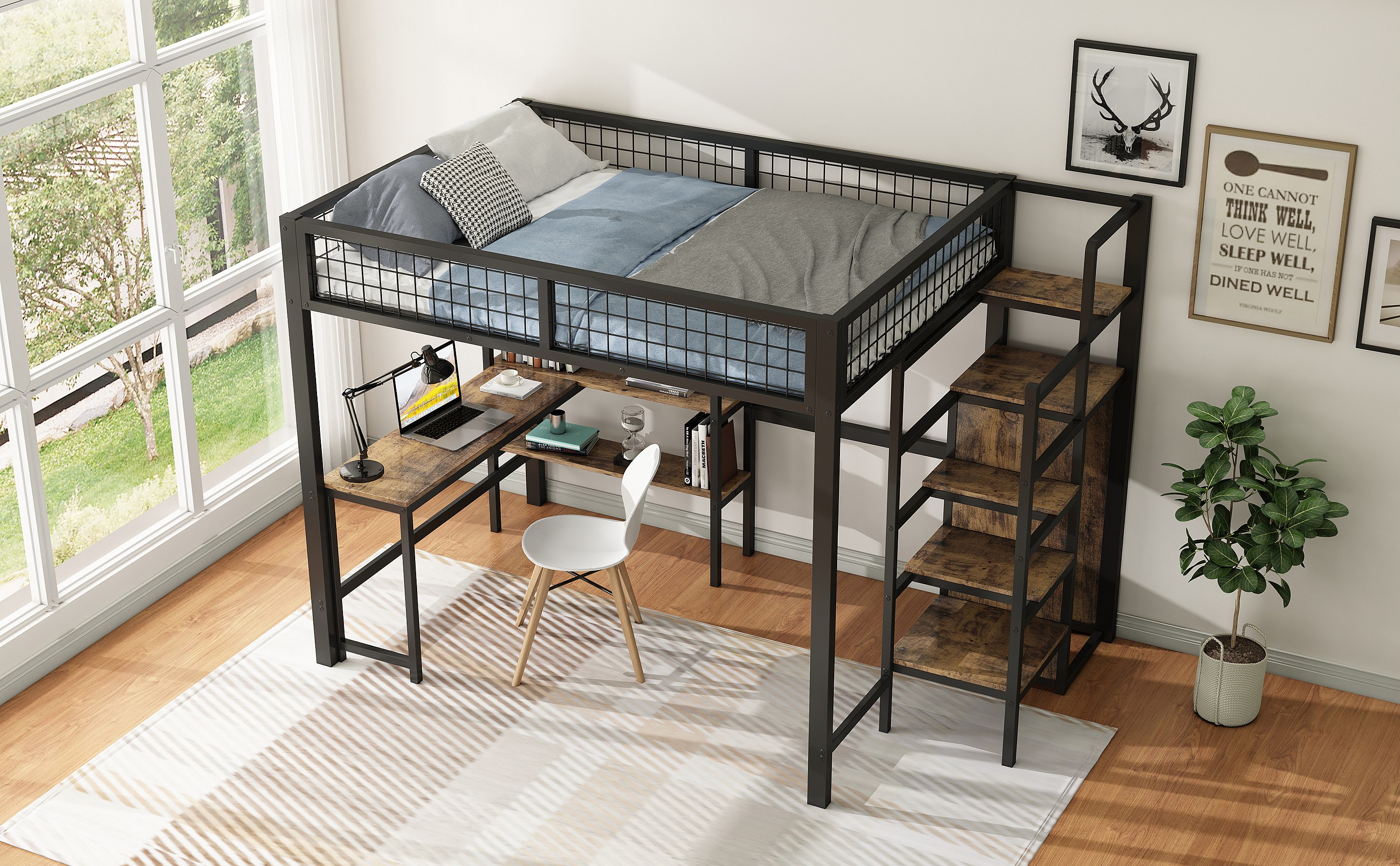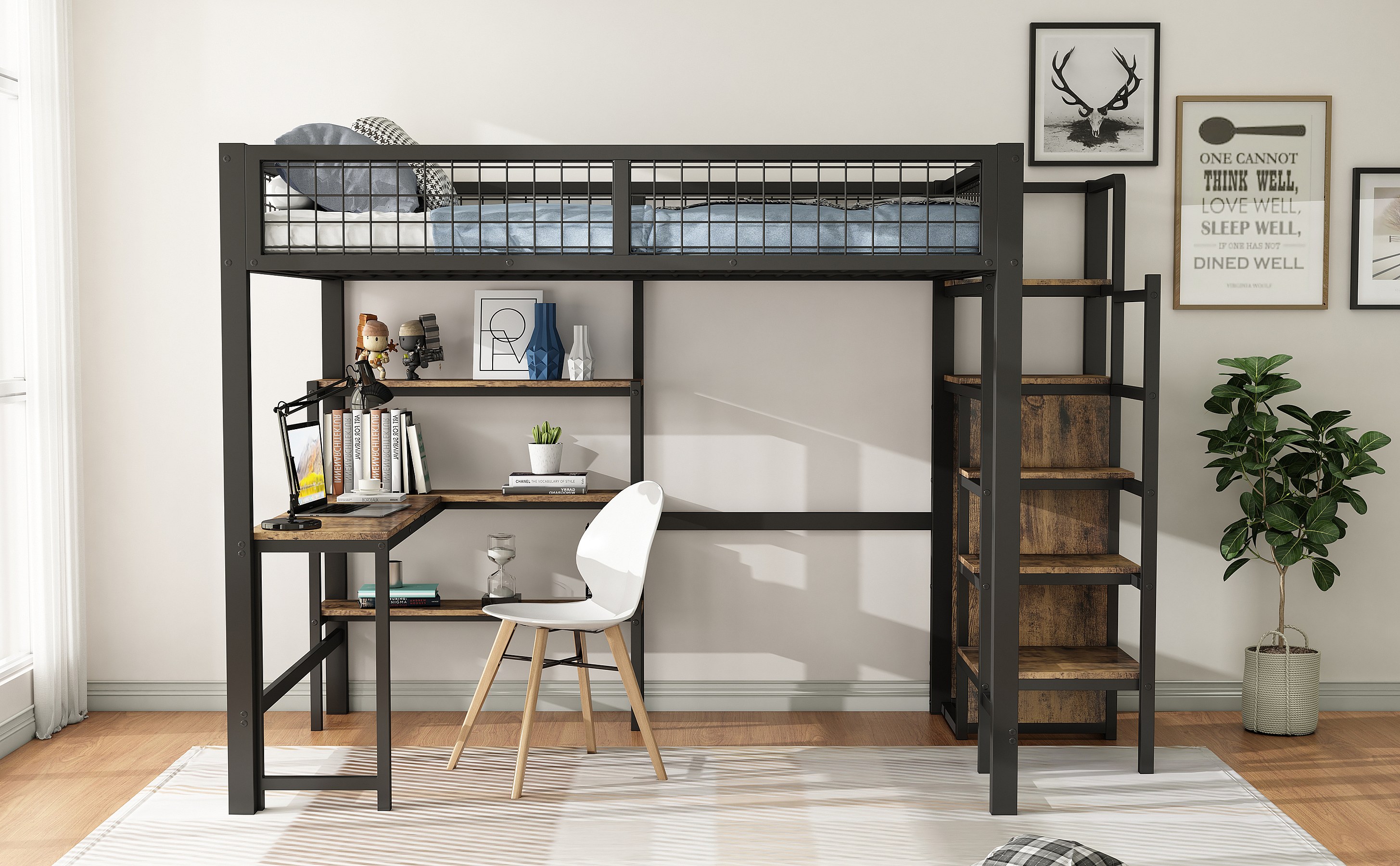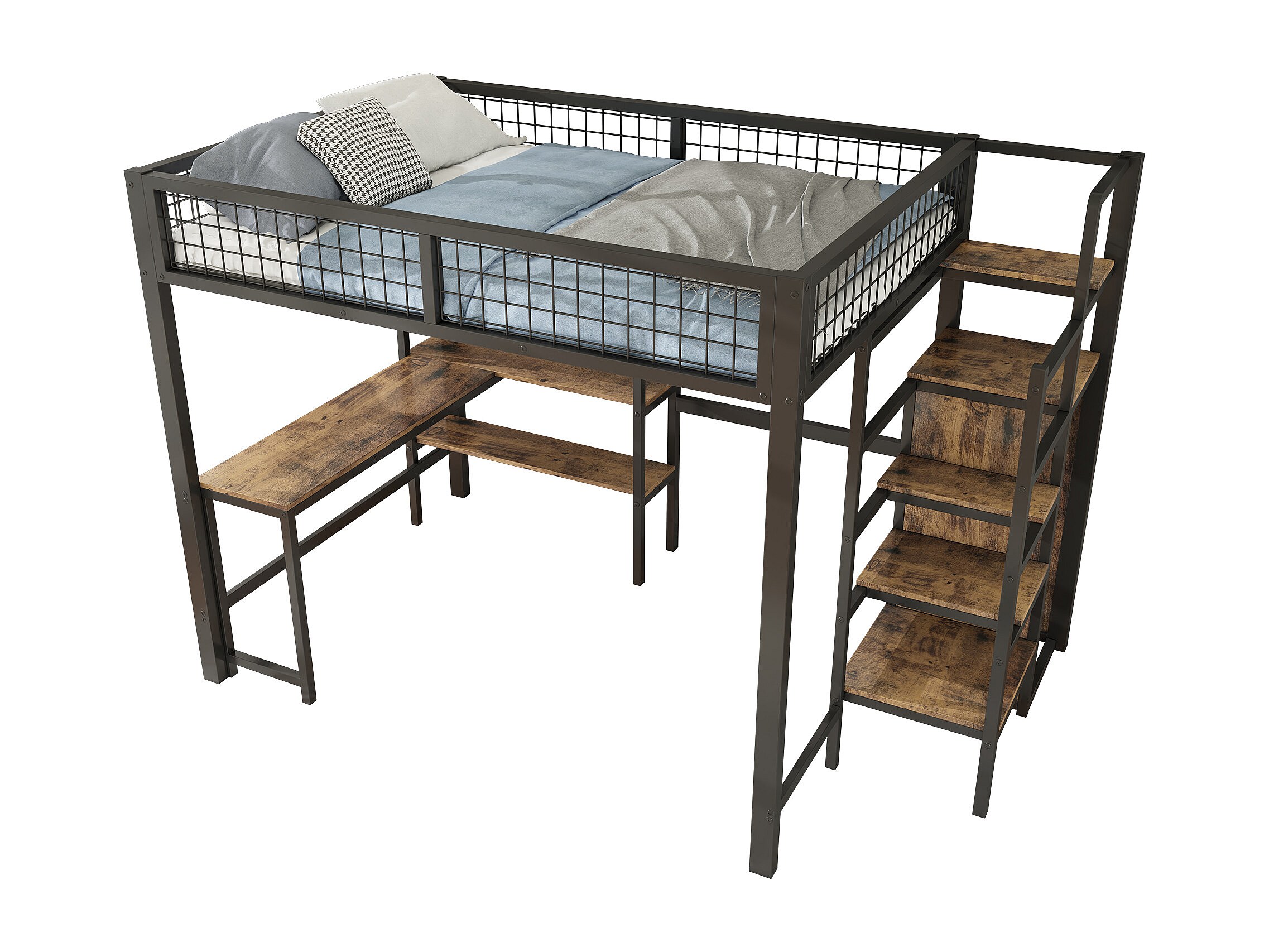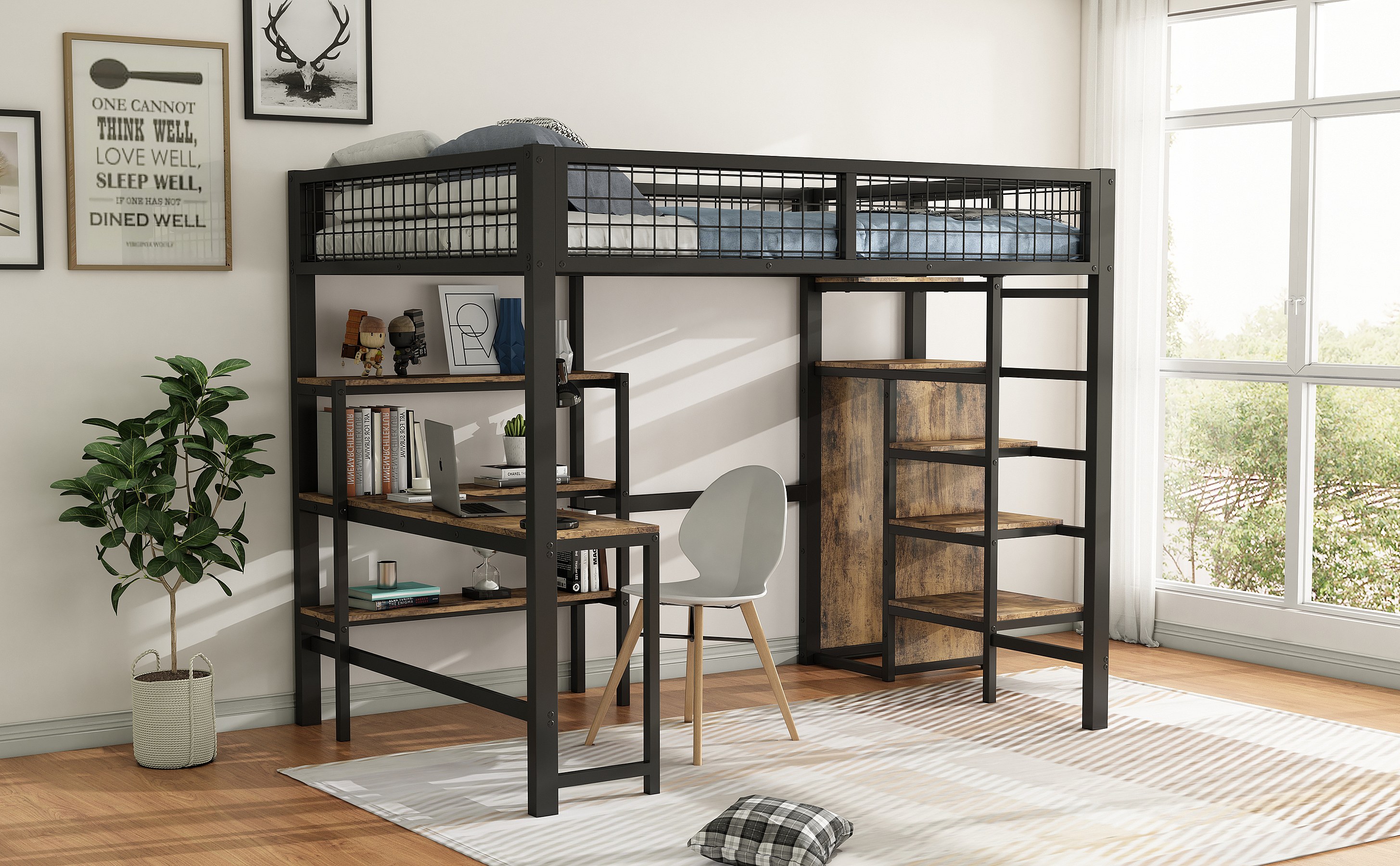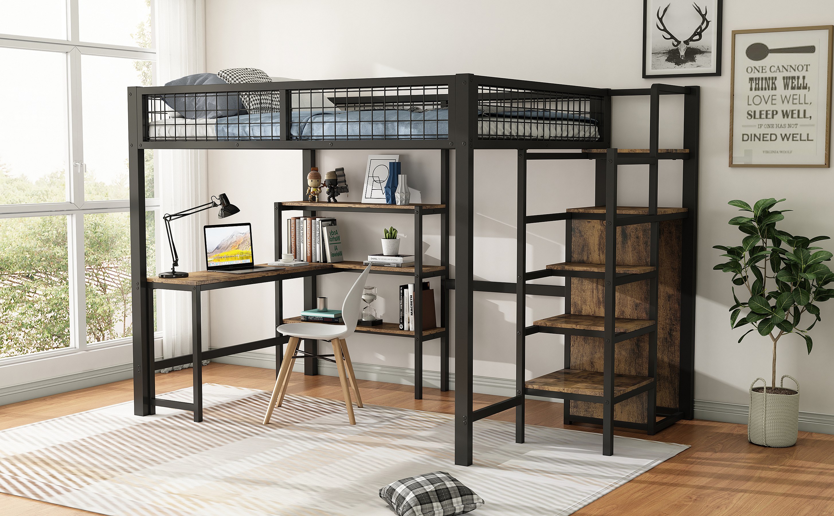 Lit mezzanine 140x200 cm, cadre en métal, échelle et étagères, sans matelas, armoire intégrée, bureau, Noir