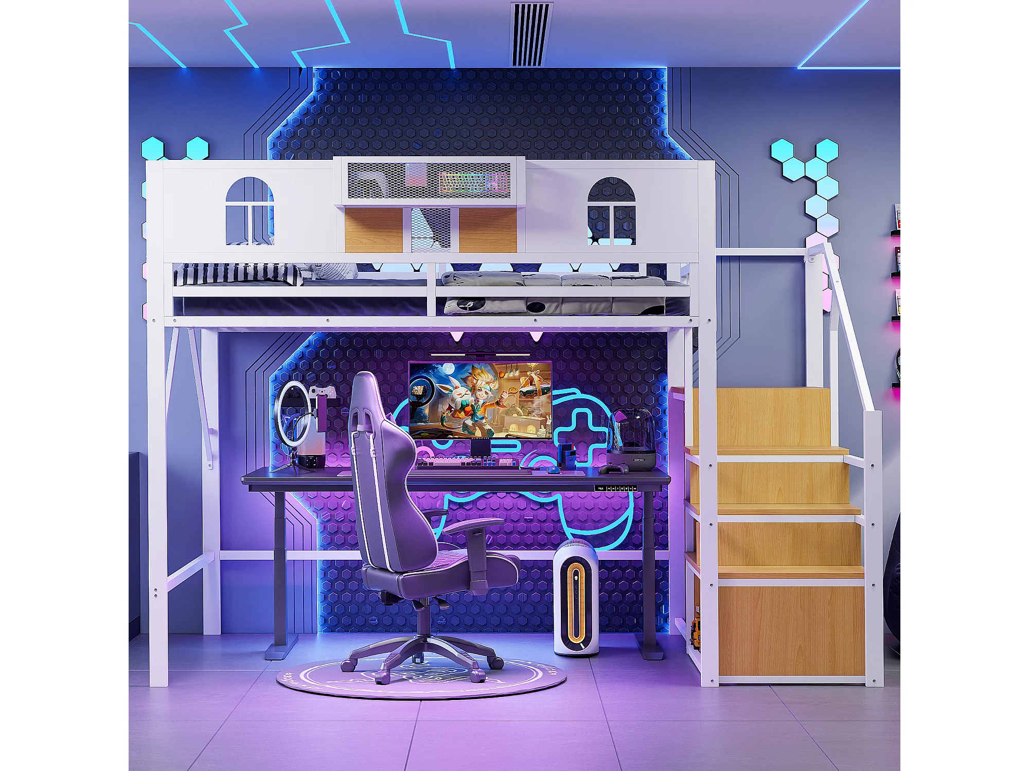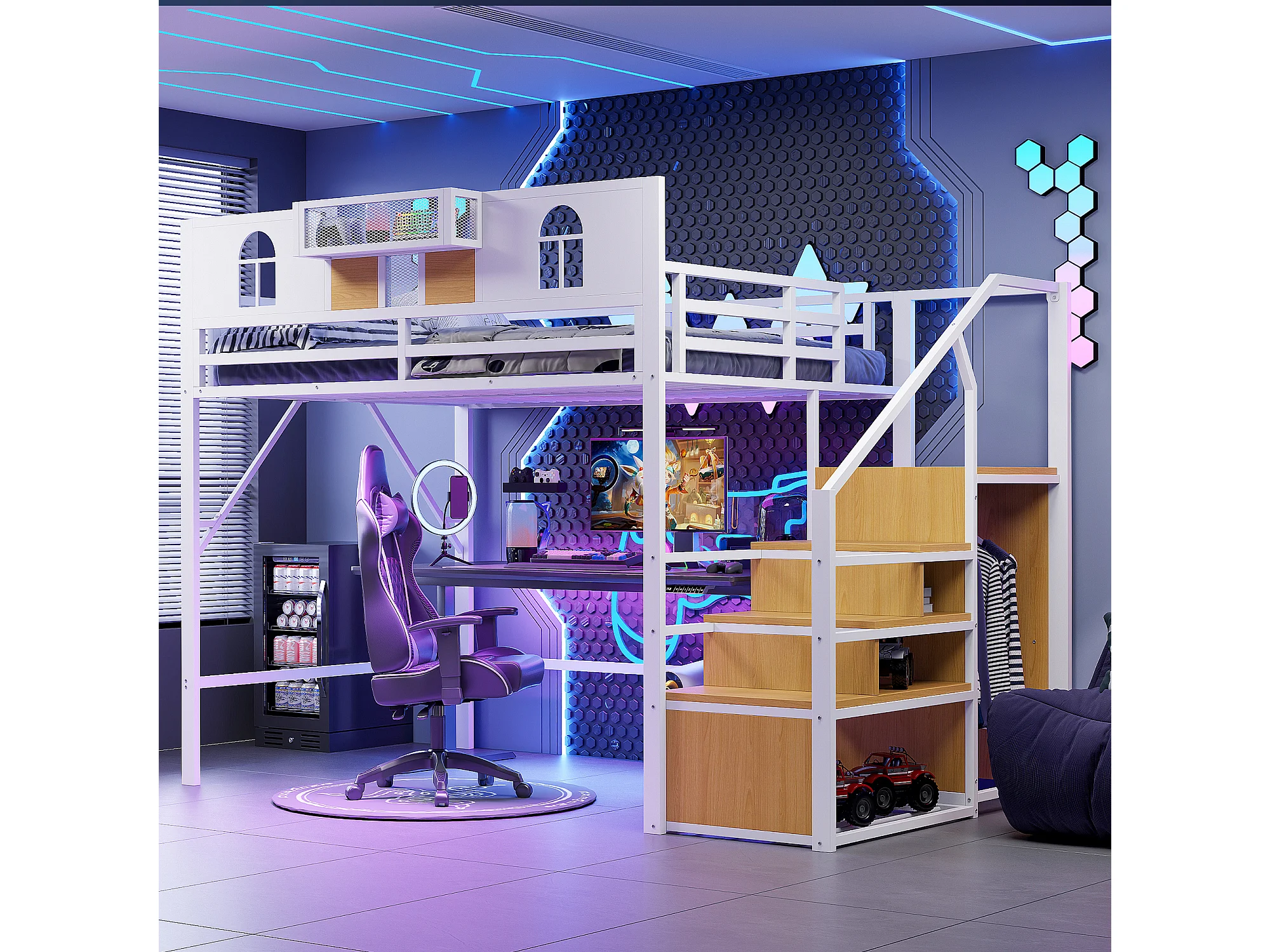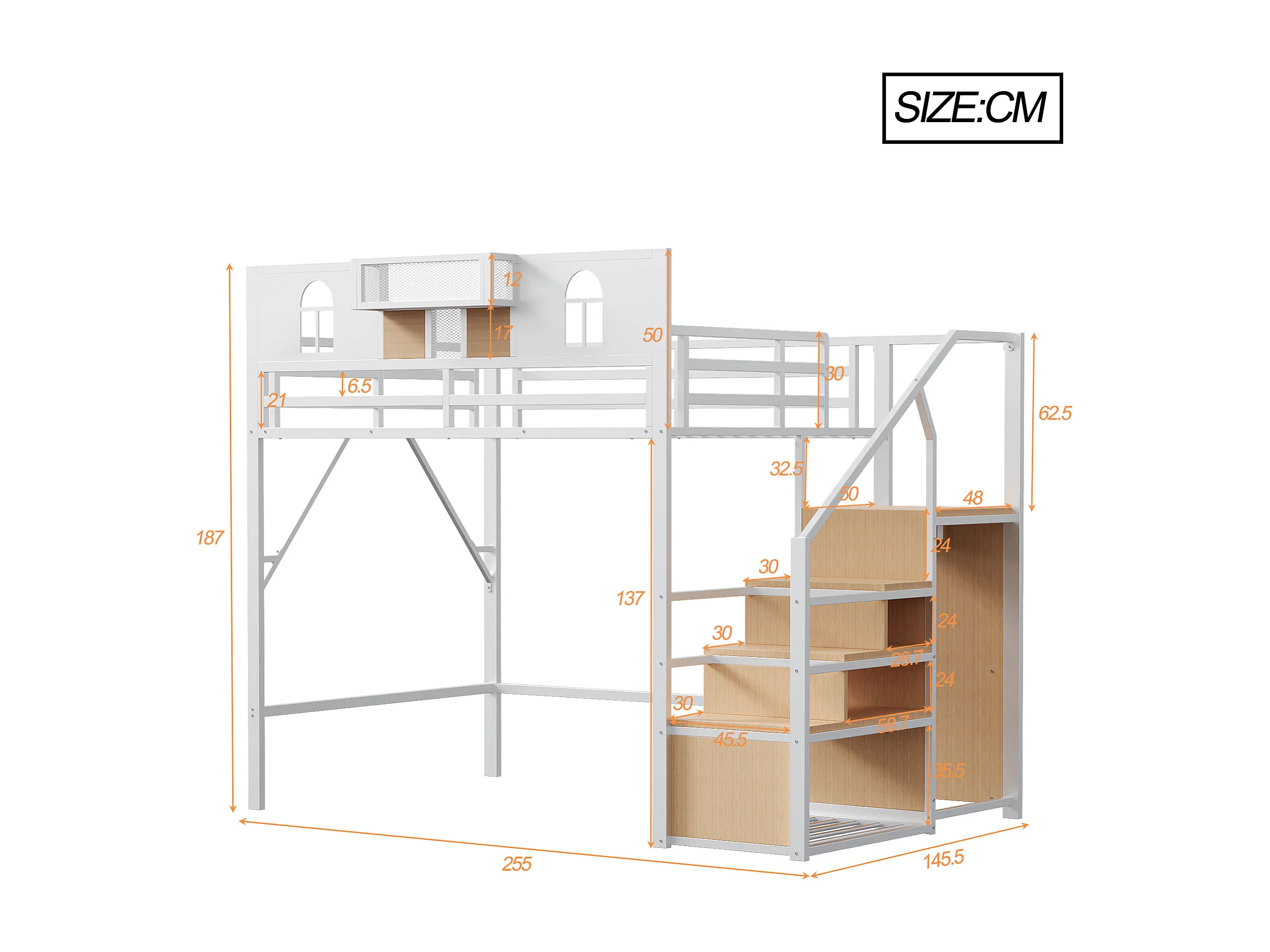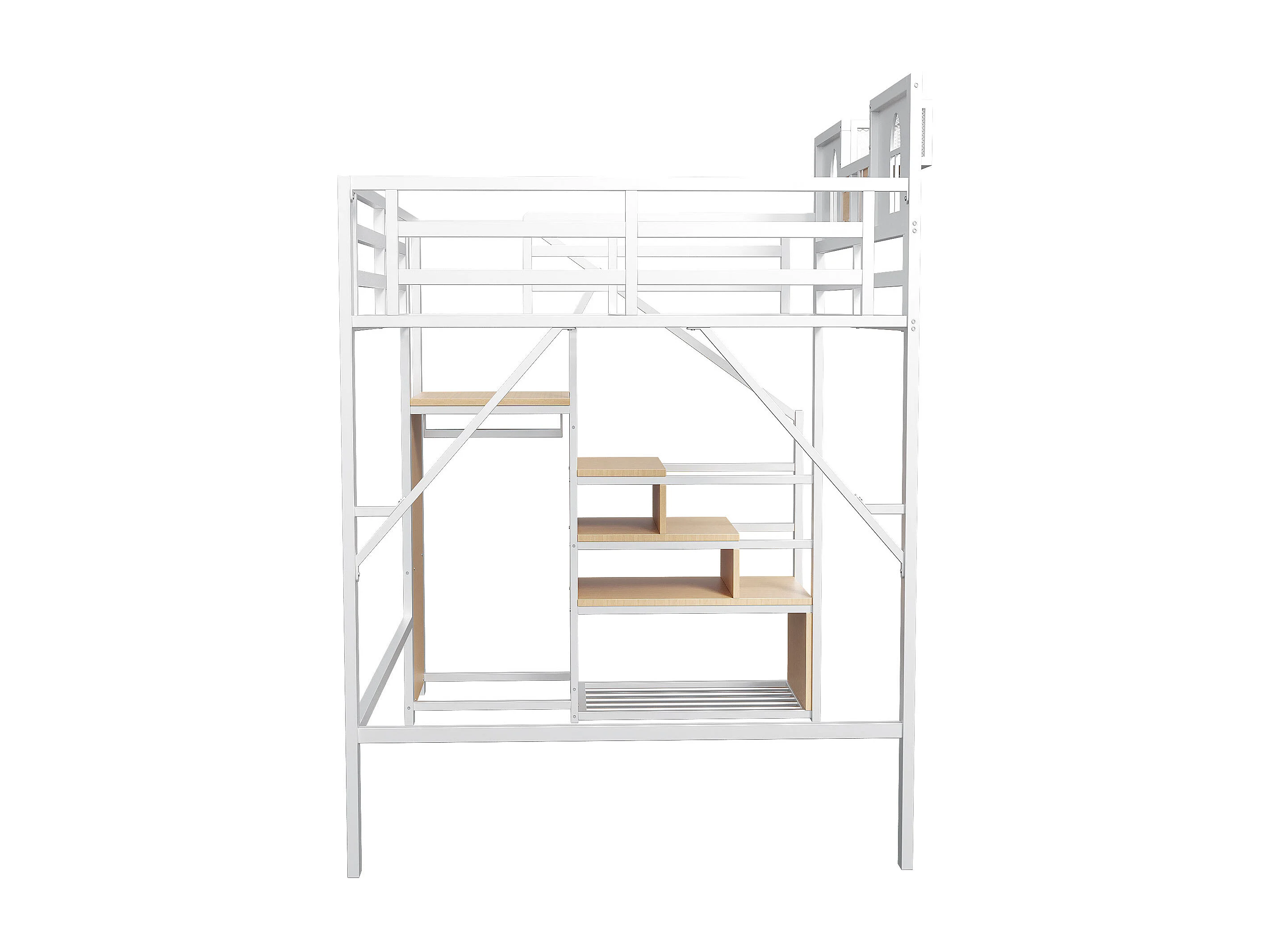 Lit mezzanine 140x200 cm en métal avec échelle de rangement, planches en bois et filet, haute barrière unique – Blanc
