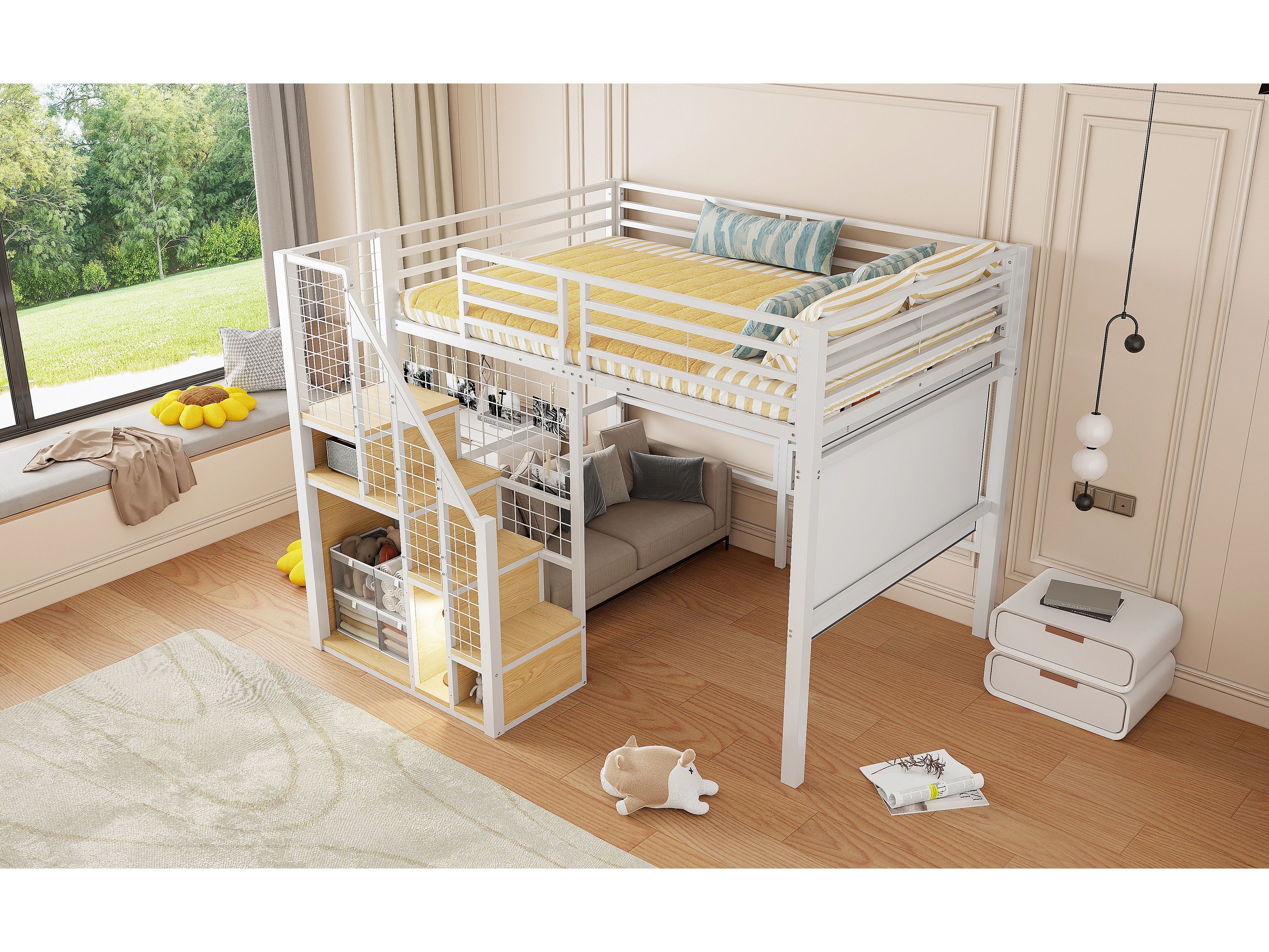 Lit mezzanine 140x200 cm en métal blanc avec rangements et étagère