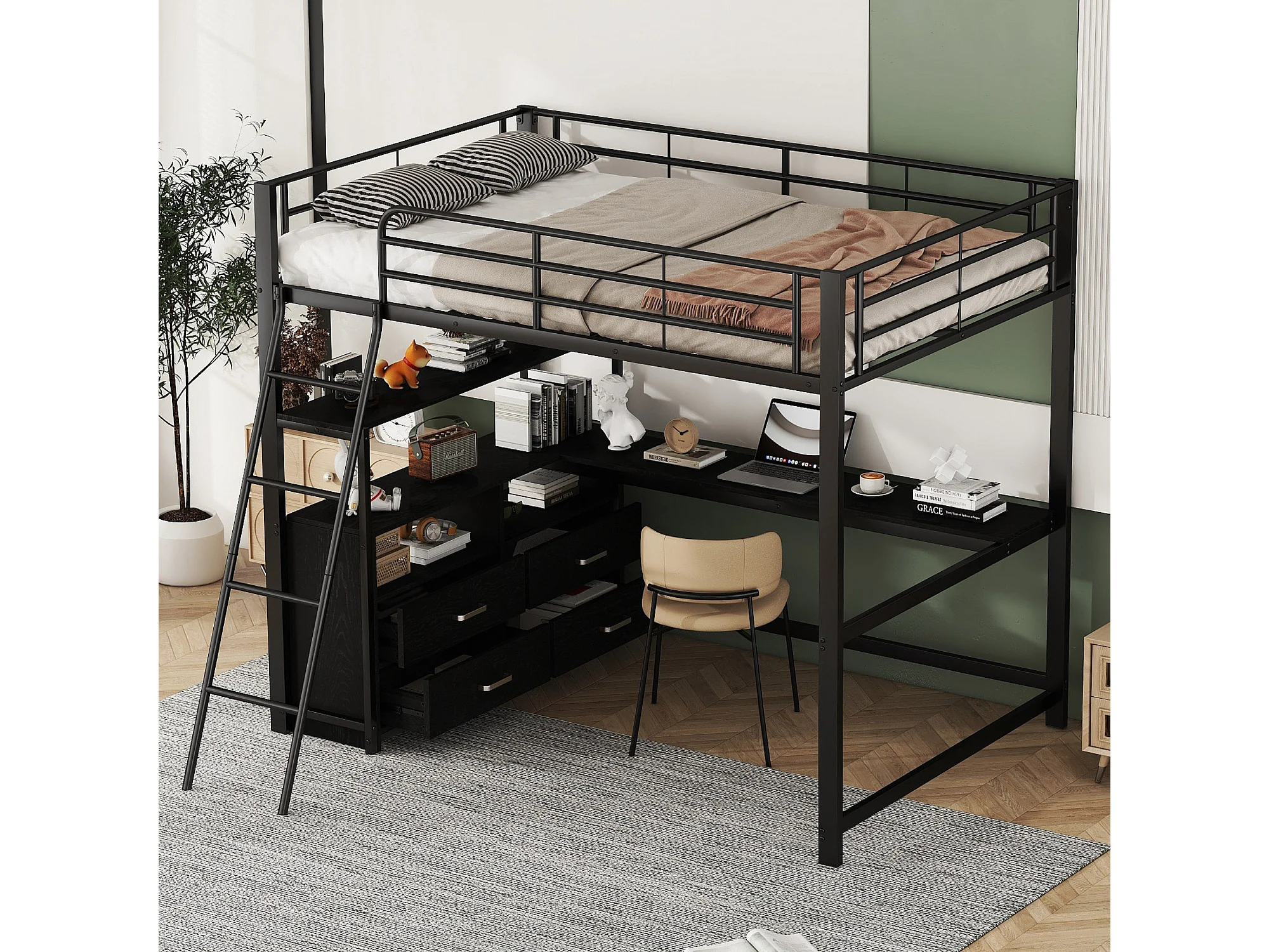 Lit mezzanine 140x200 cm en métal noir avec tiroirs pratiques et bureau en L – design en stratifié, lit moderne sans matelas