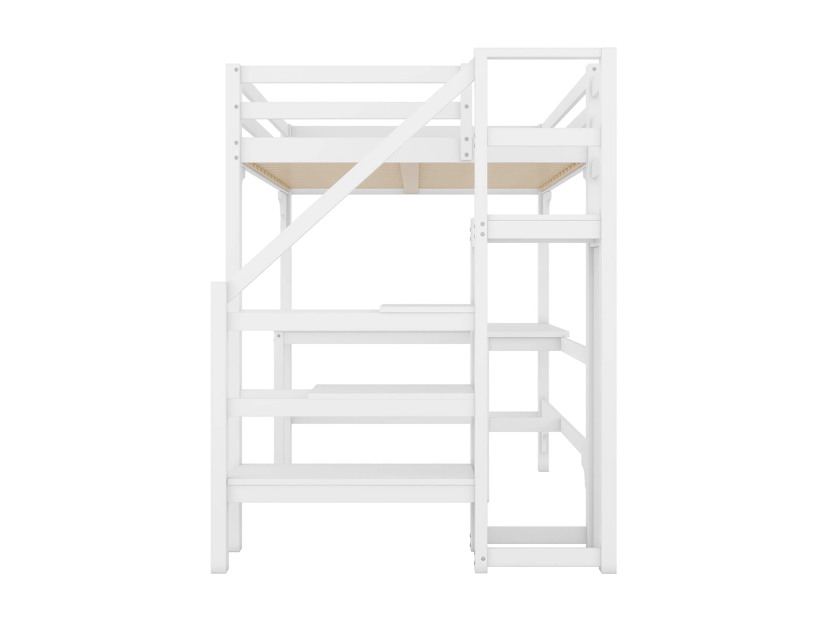 Lit mezzanine 140x200 cm en pin blanc avec bureau et armoire ouverte – Gain de place pour chambre ado/adulte