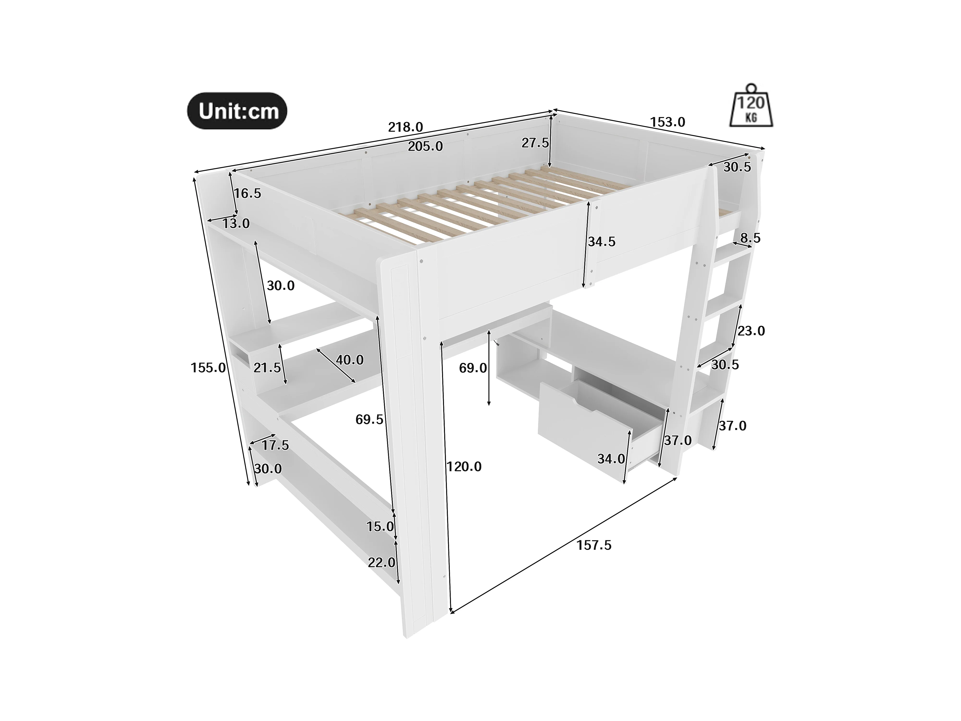 Lit mezzanine 140x200 cm, lit gaming avec bureau, LED, tiroir, étagères, sans matelas, Blanc