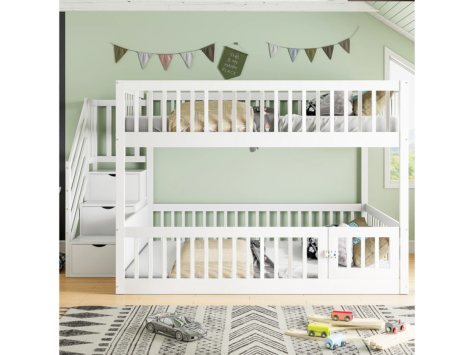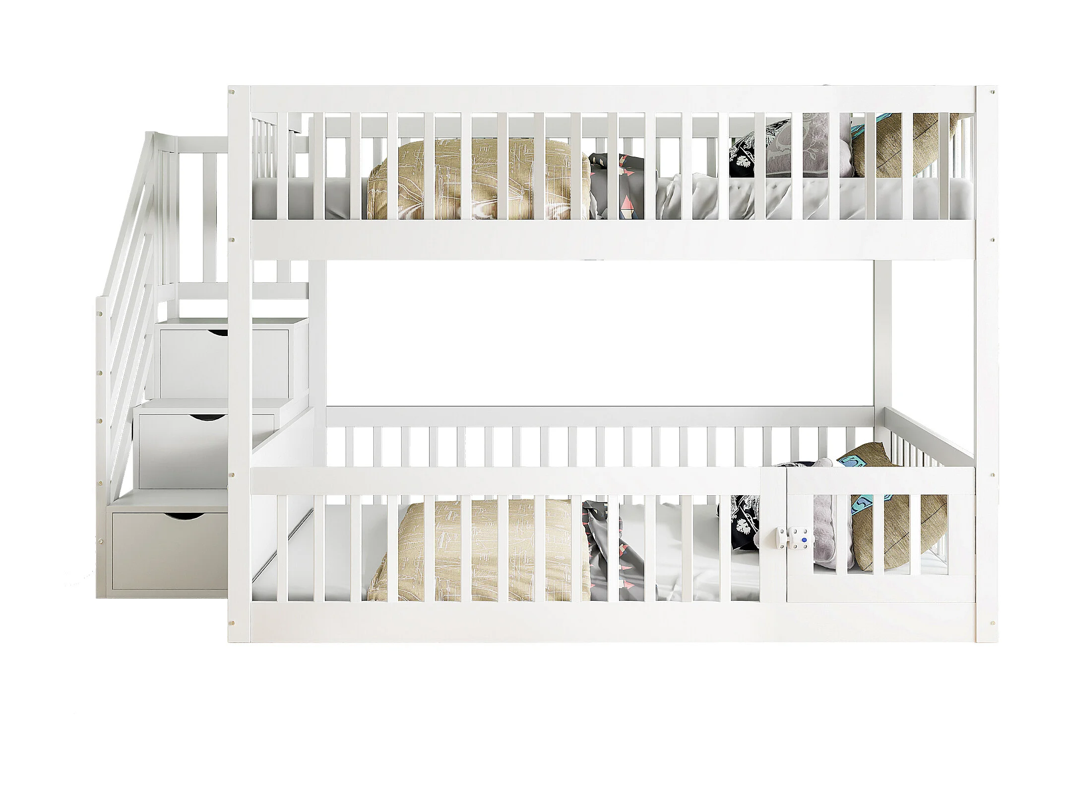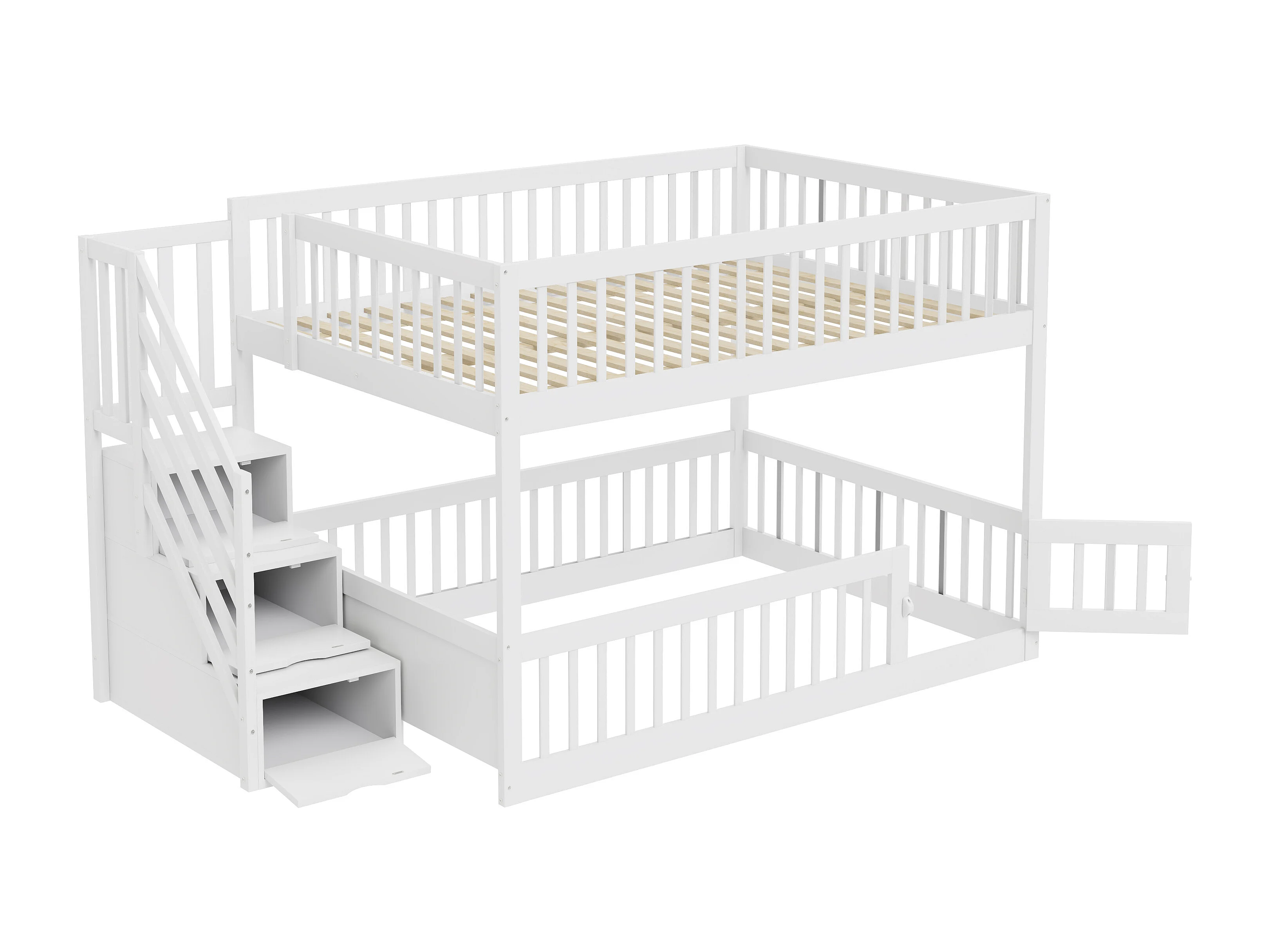 Lit mezzanine 140x200 cm, lit simple bois massif, échelle sécurisée, tiroirs de rangement, lit enfant, lit junior, blanc