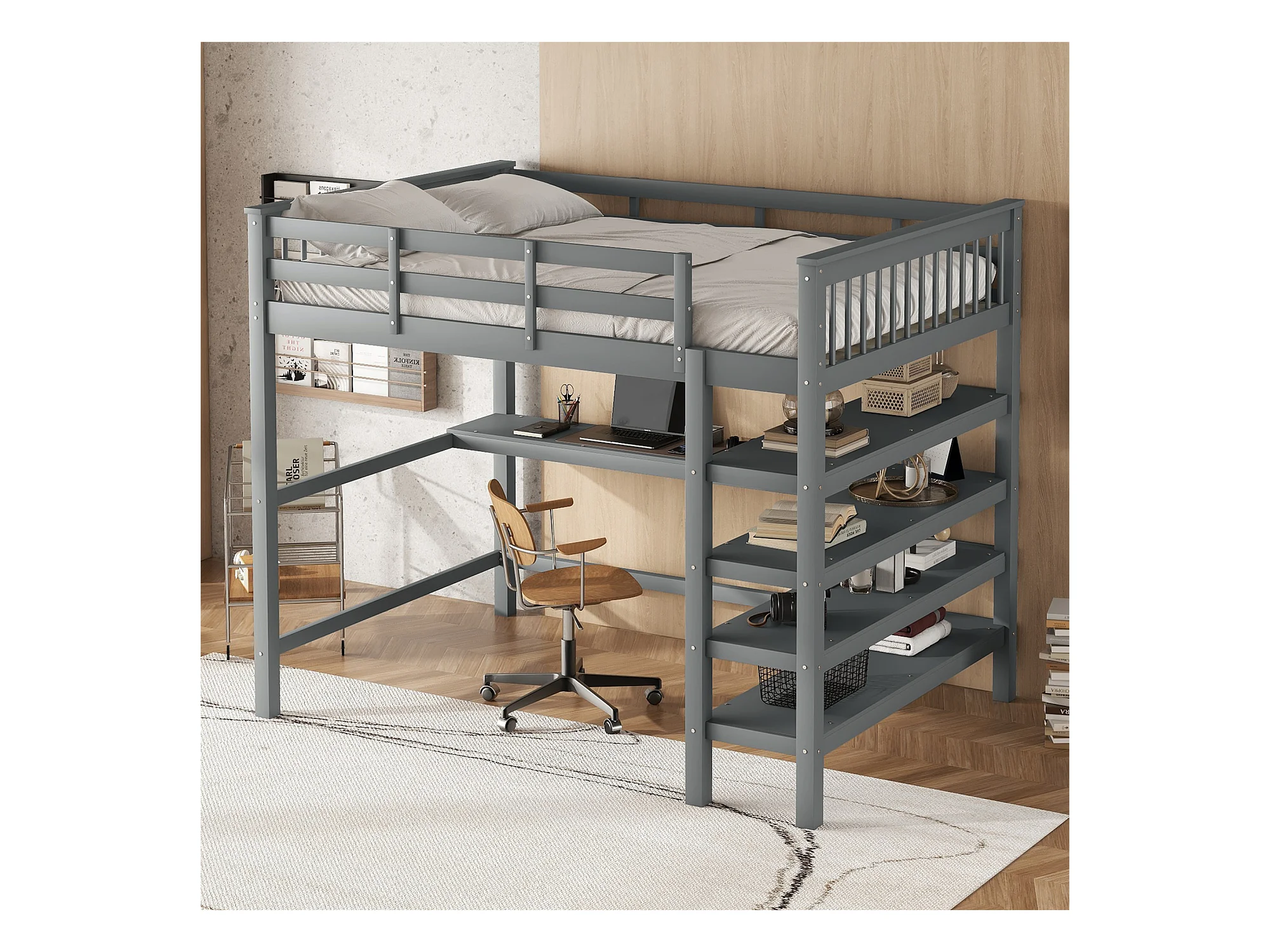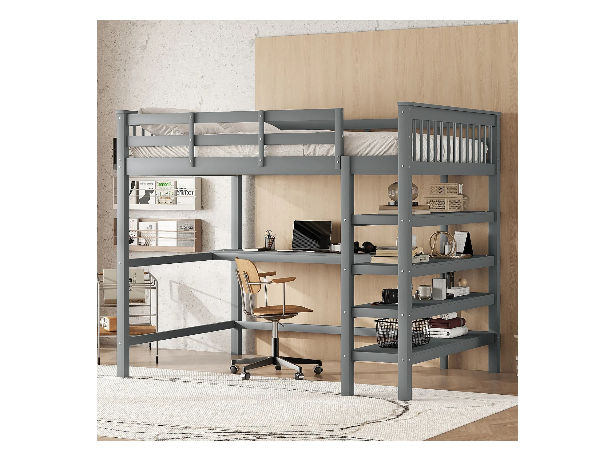 Lit mezzanine 140x200 cm pour enfant avec compartiments de rangement et bureau intégré, sans matelas, bois de pin, Gris