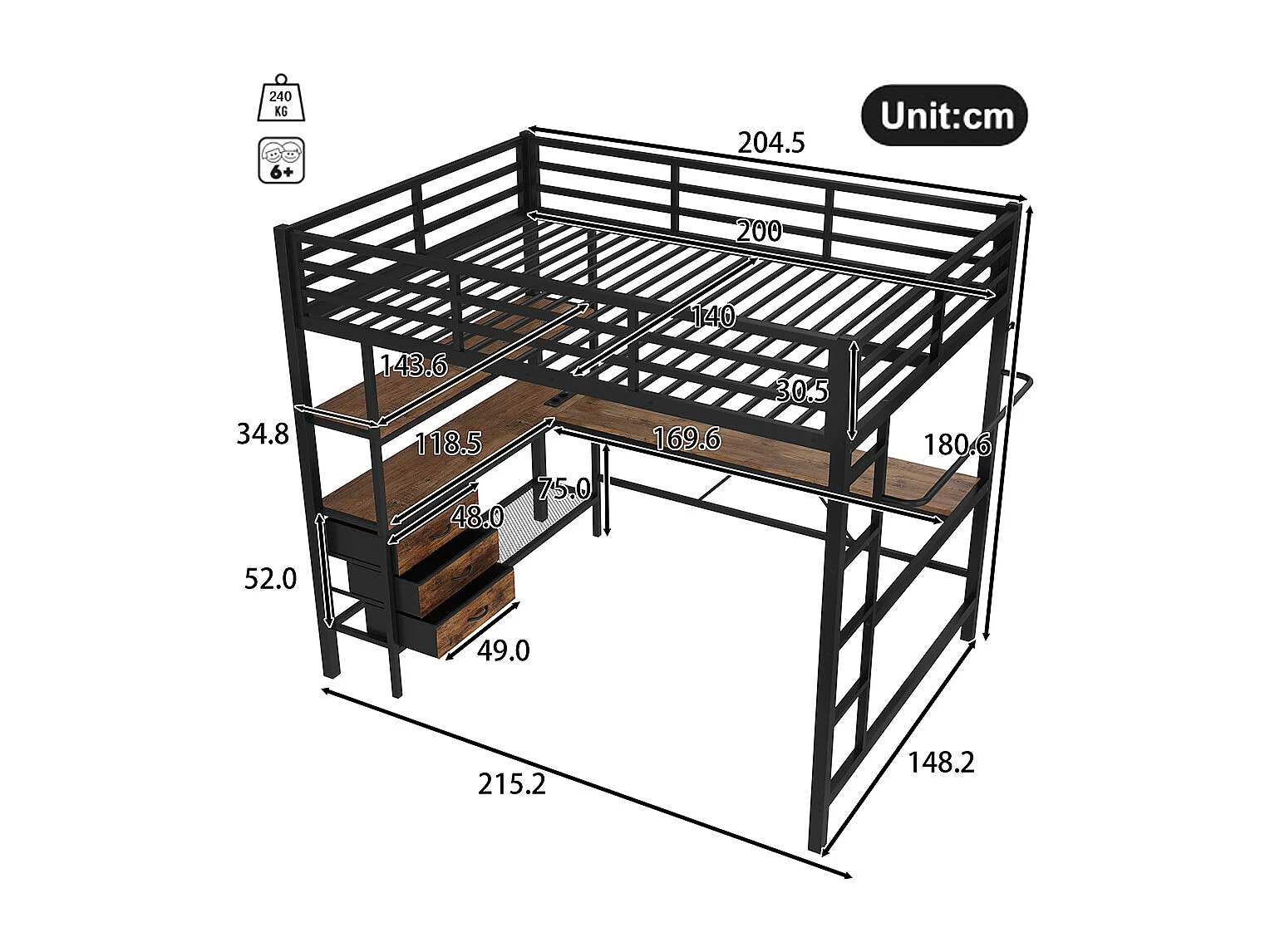 Lit mezzanine 140x200 éclairage d'ambiance avec télécommande bureau prise+USB 3 tiroirs étagères garde-corps escalier Noir
