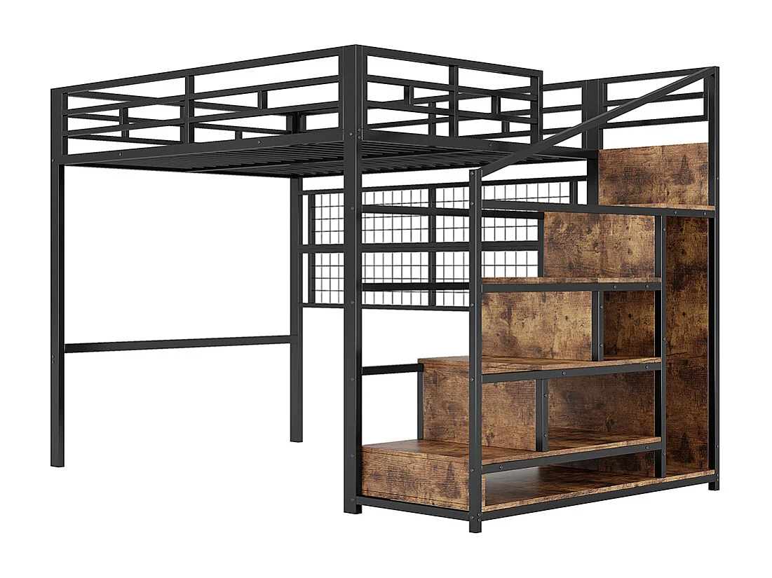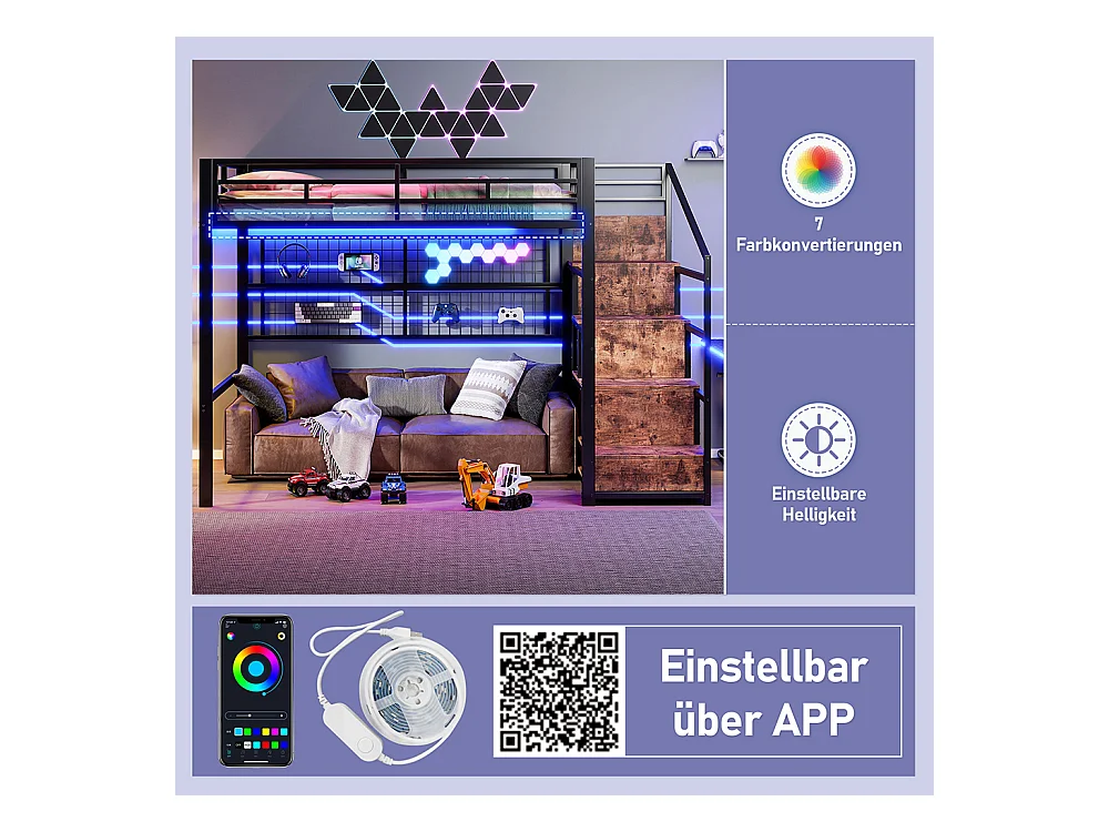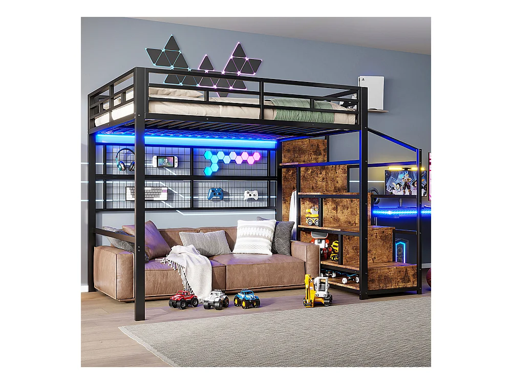Lit mezzanine 140x200 en métal noir avec armoire échelle de rangement grille suspendue espace sous le lit éclairage LED 7 couleurs