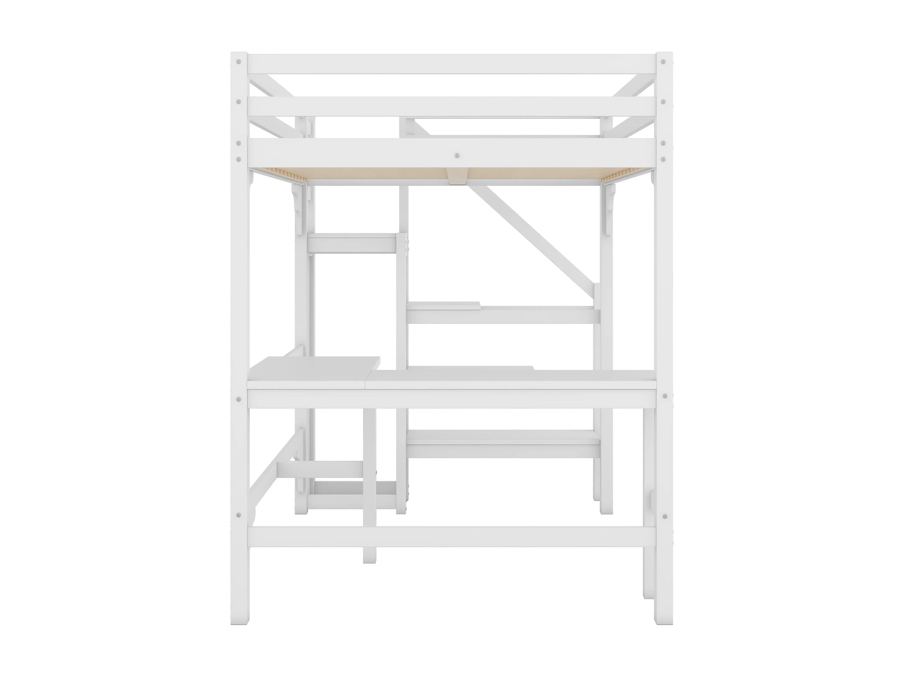 Lit mezzanine 140x200cm avec bureau en L, armoire et escalier, pin + MDF, blanc