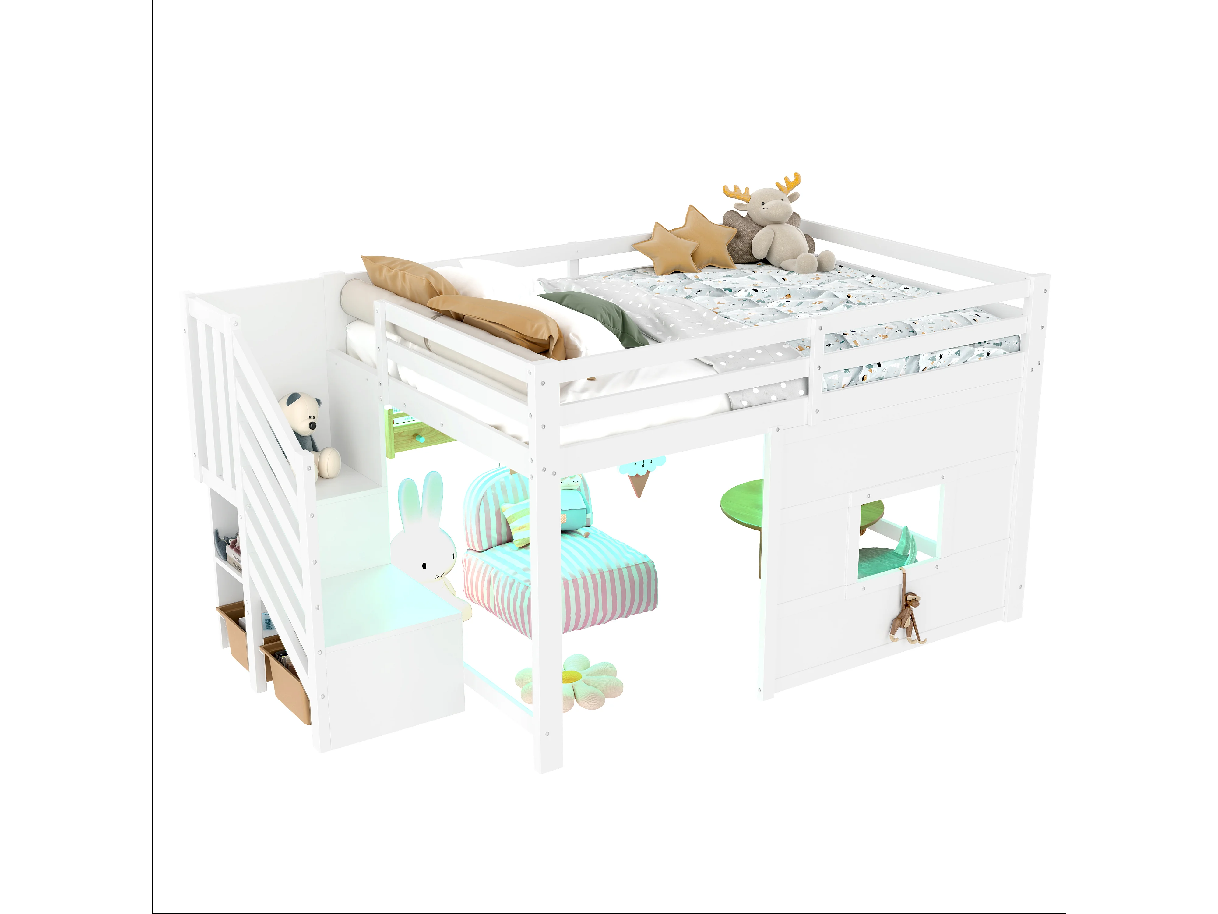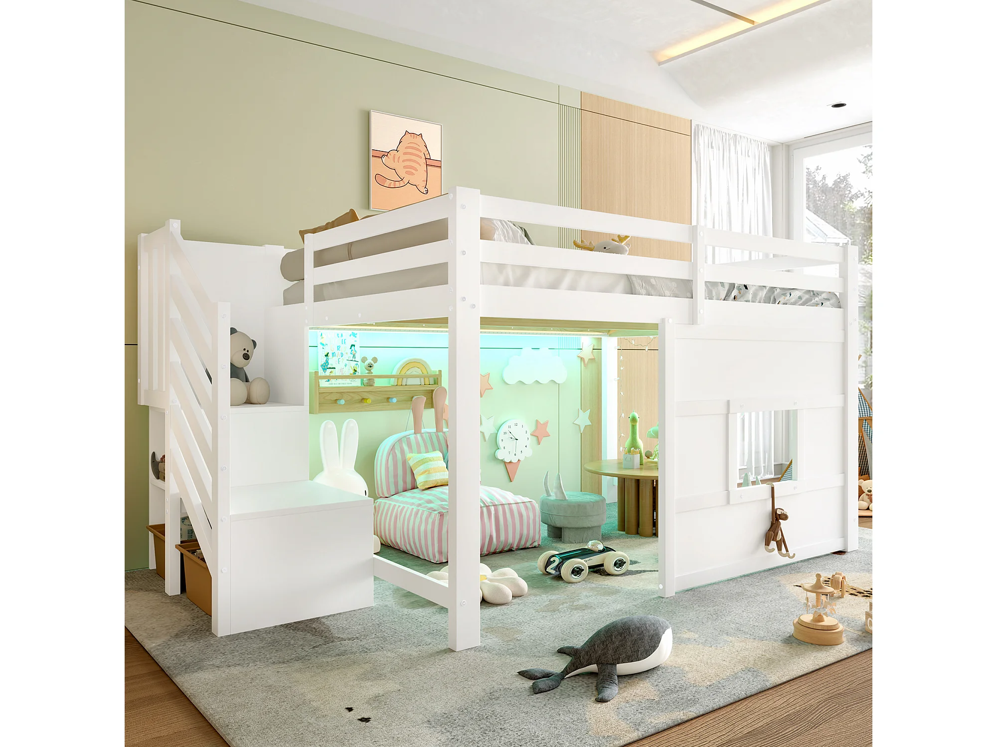 Lit mezzanine 140x200cm - avec échelle de rangement et fenêtre - avec LED - Barrière de sécurité - MDF - Blanc ( sans matelas )