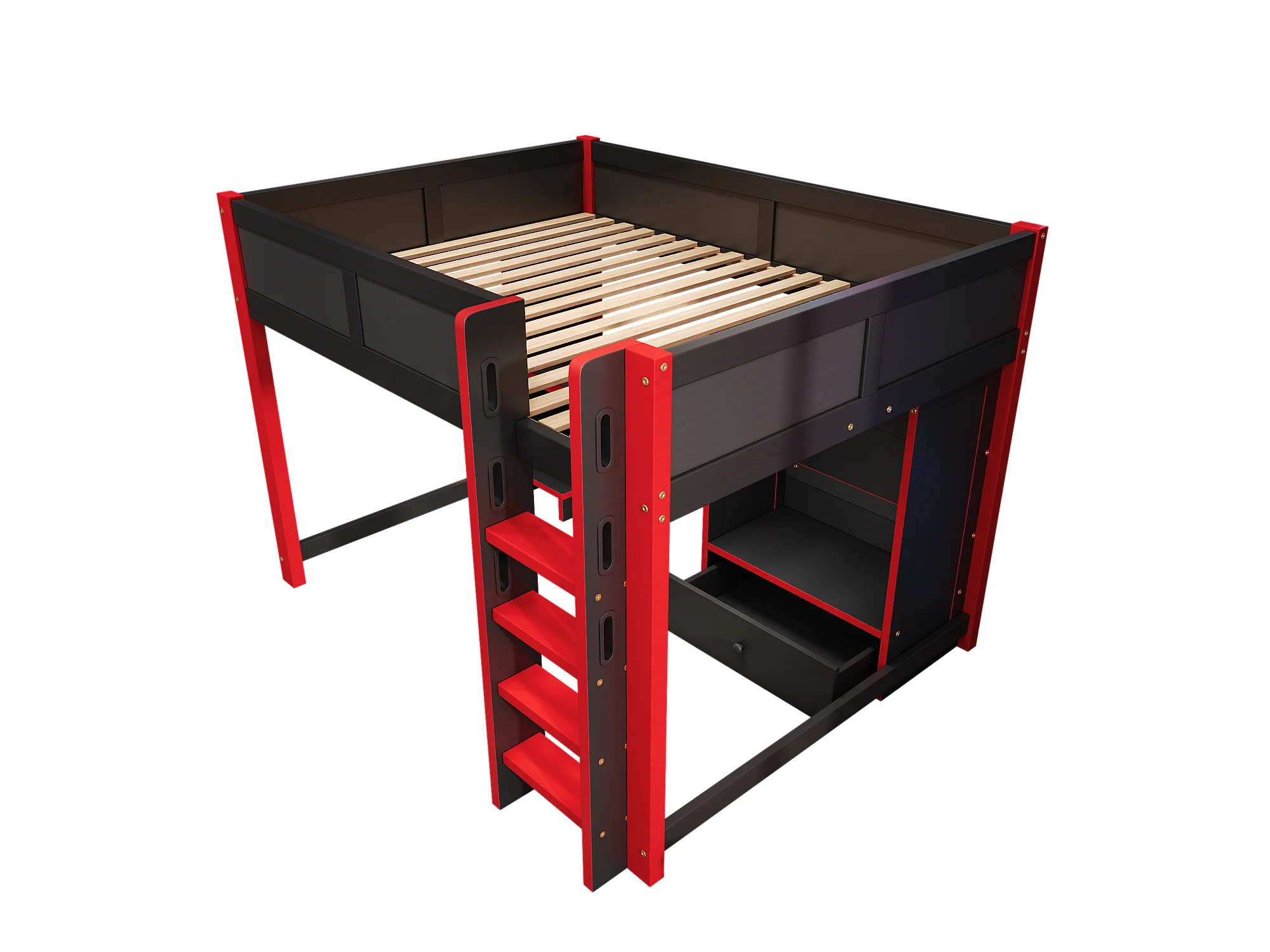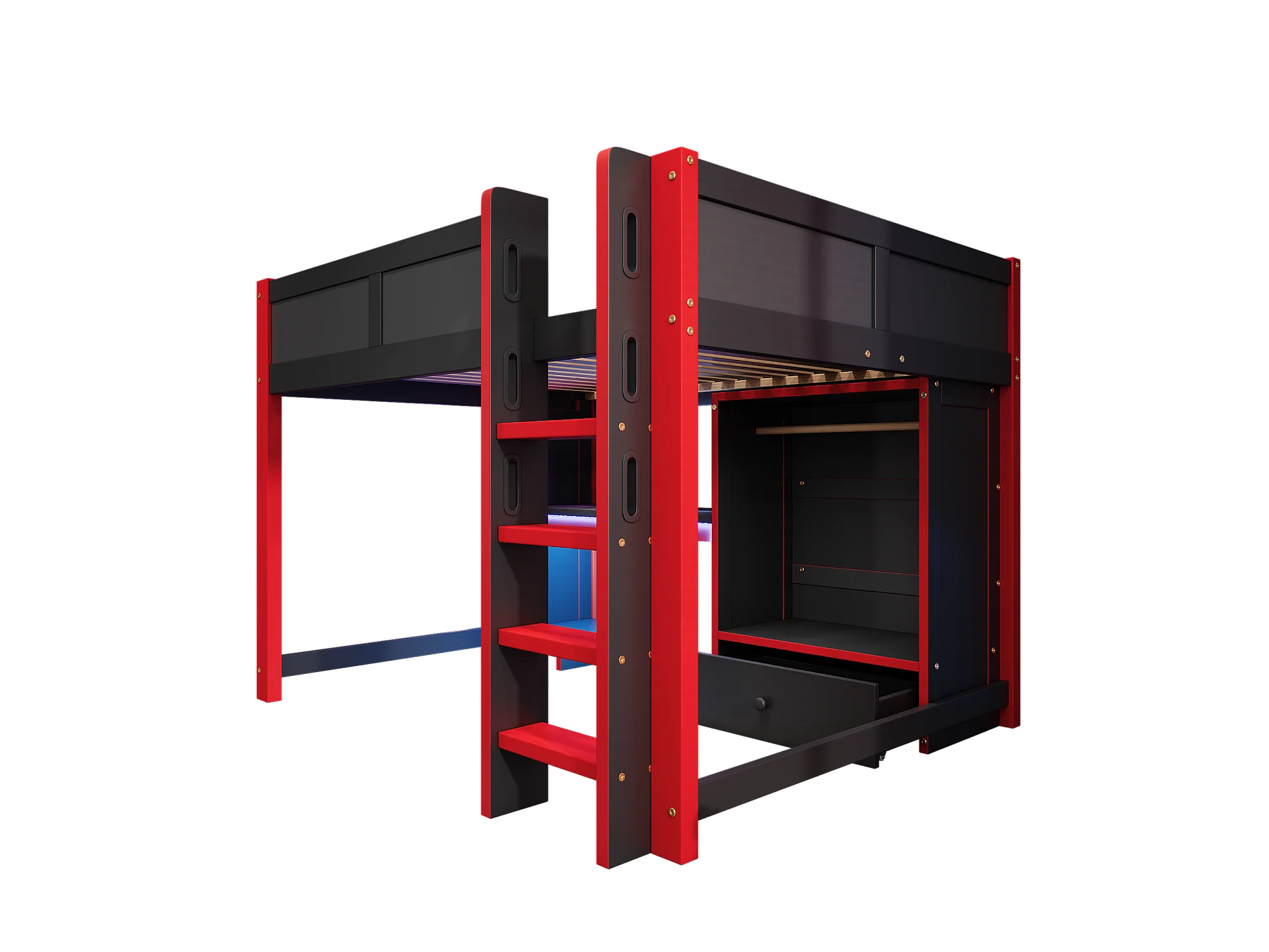 Lit mezzanine 140x200cm - avec éclairage LED - avec bureau - avec échelle et armoire - avec 1 tiroir - noir + rouge (matelas non inclus)