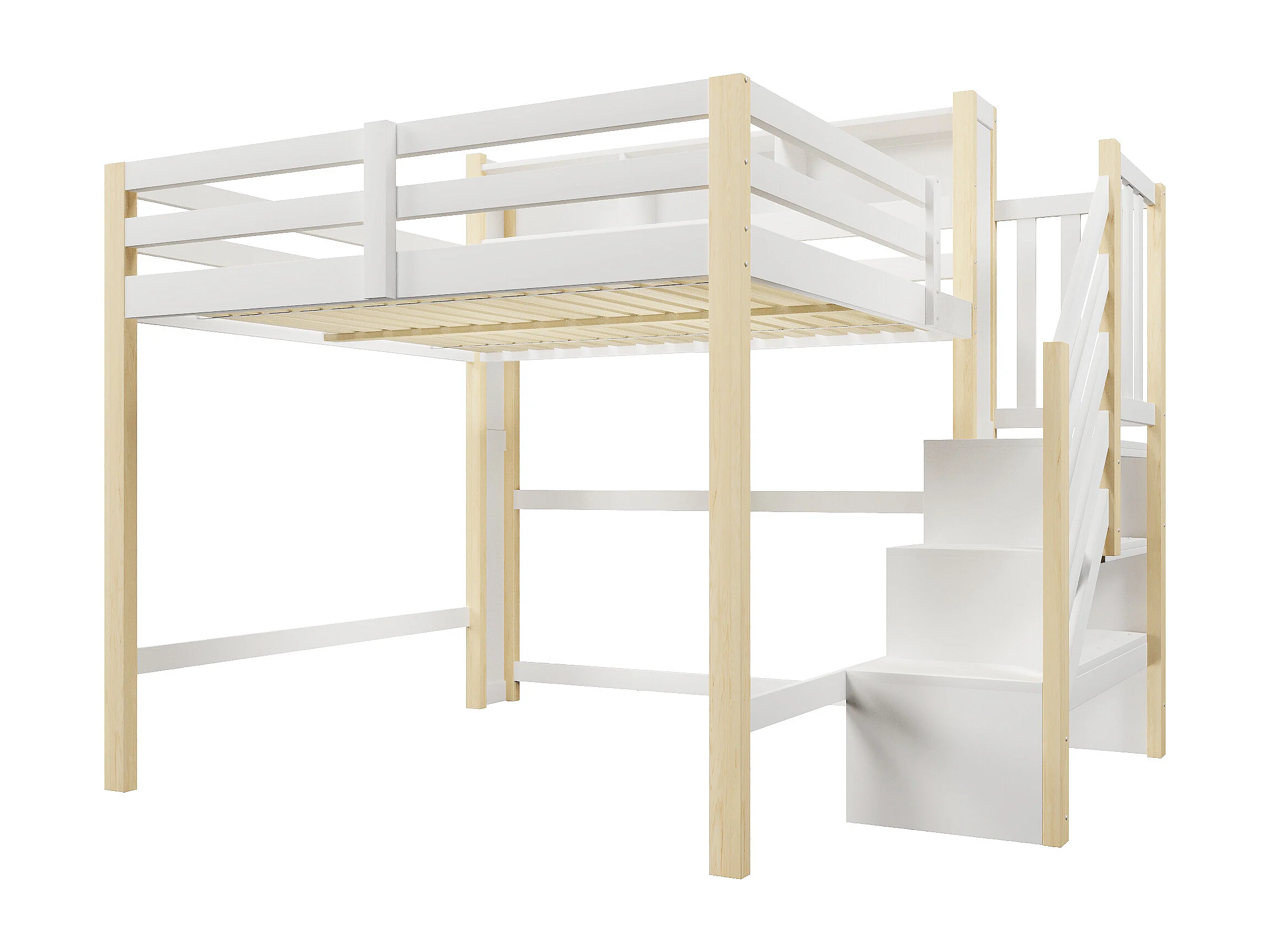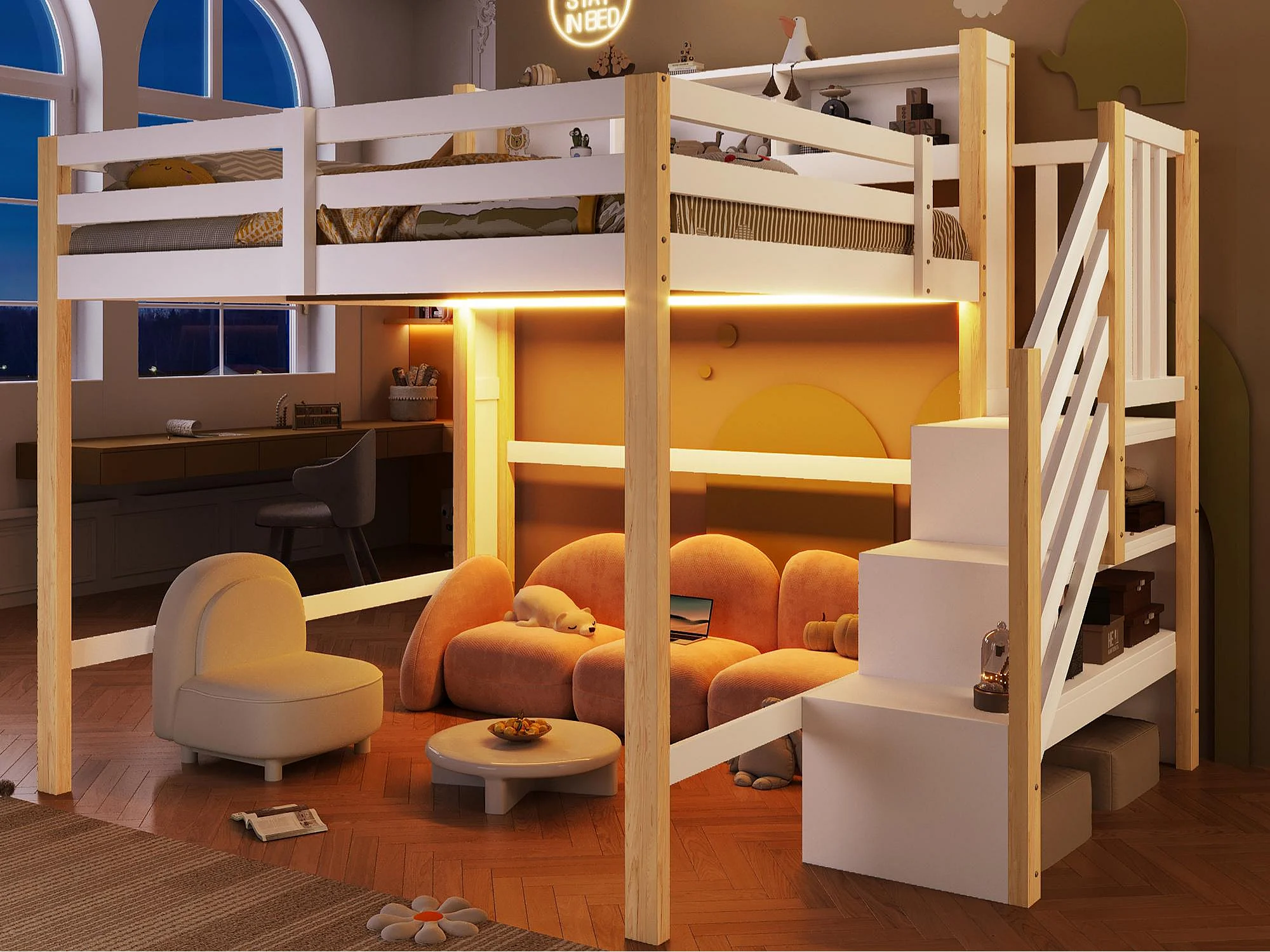 Lit mezzanine 140x200cm - avec éclairage LED - avec échelle de rangement - Blanc + Naturel (matelas non inclus)