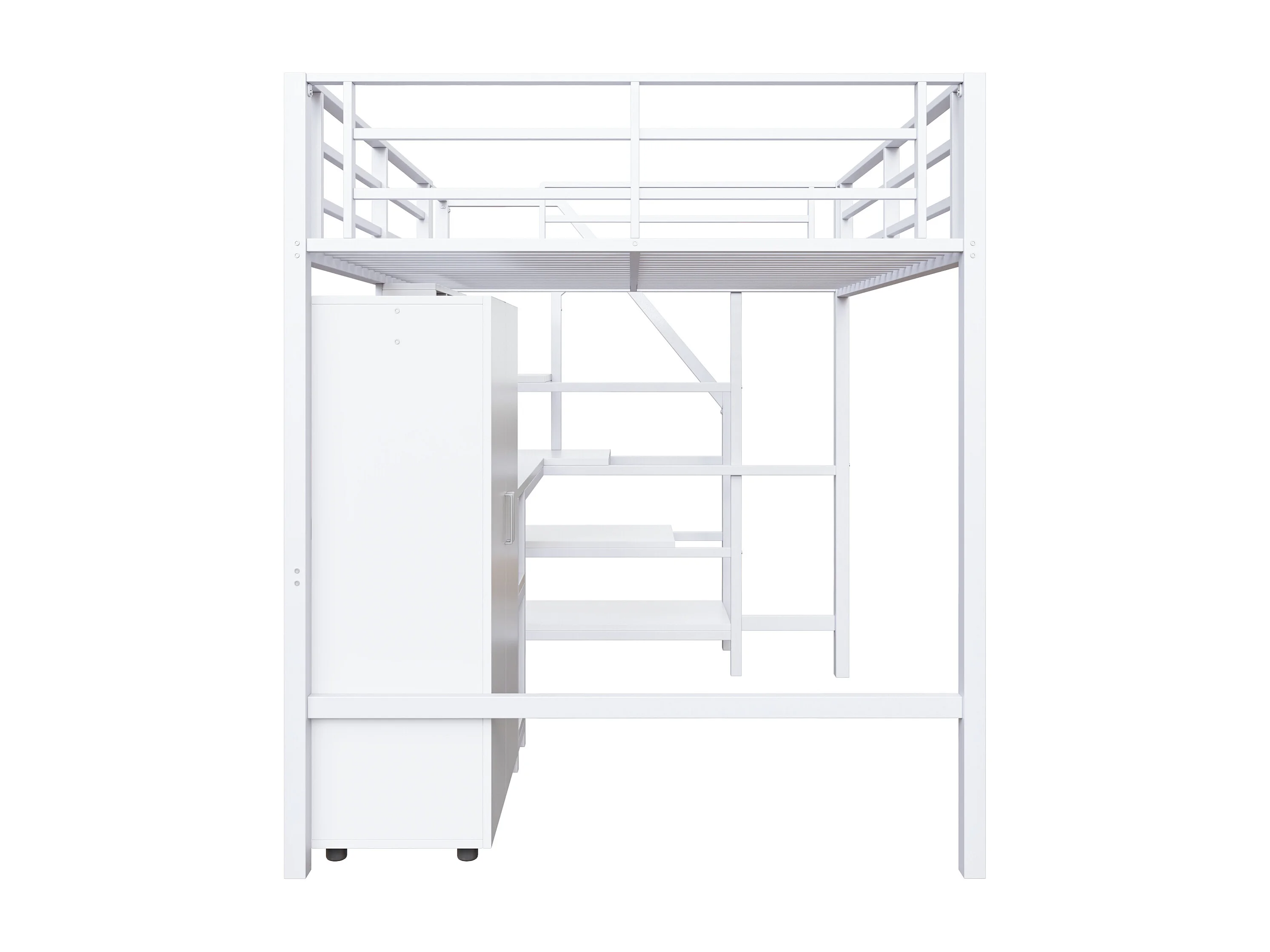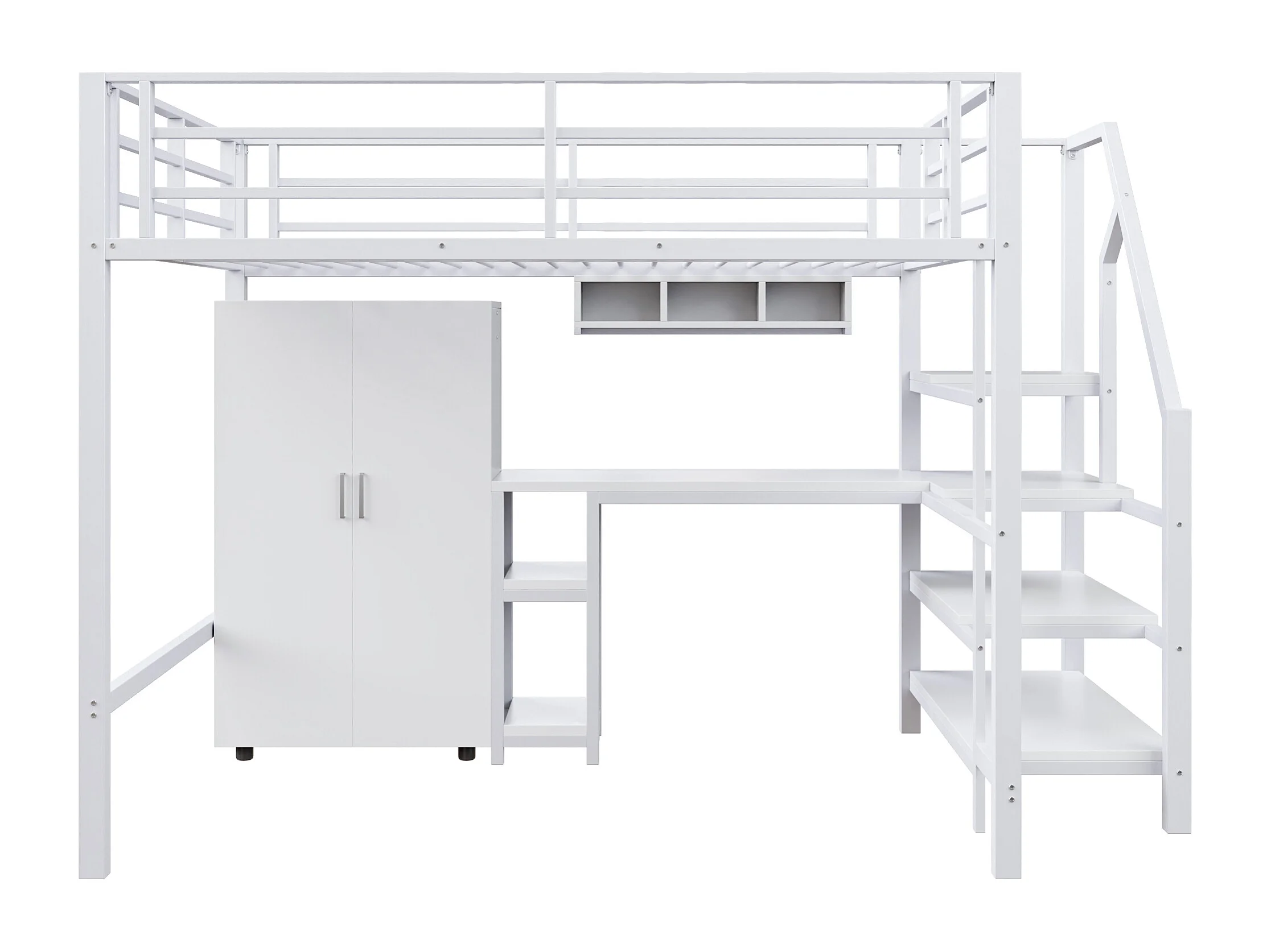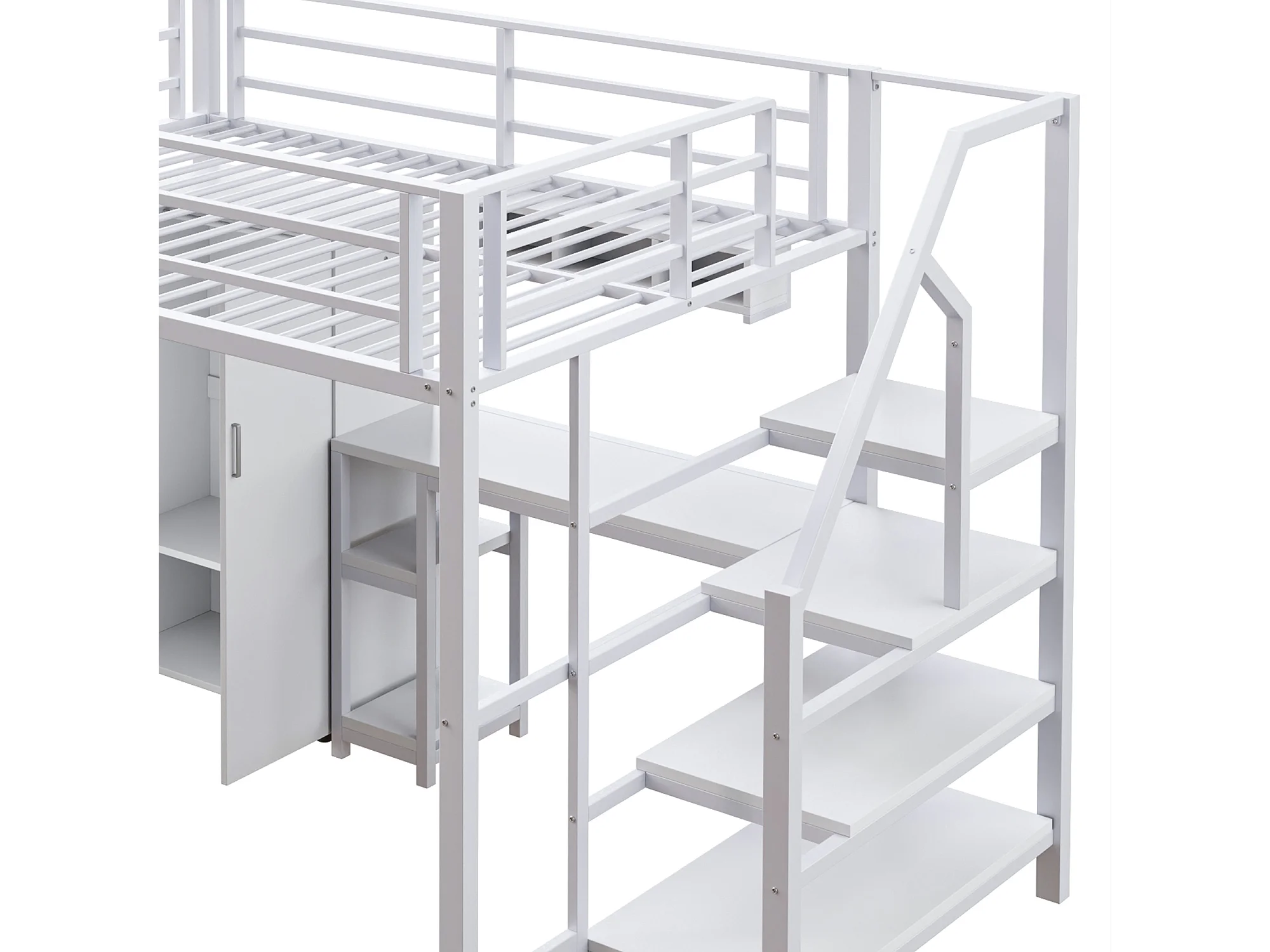 Lit mezzanine 140x200cm avec escalier de rangement, bureau et armoire - Métal + MDF - Blanc